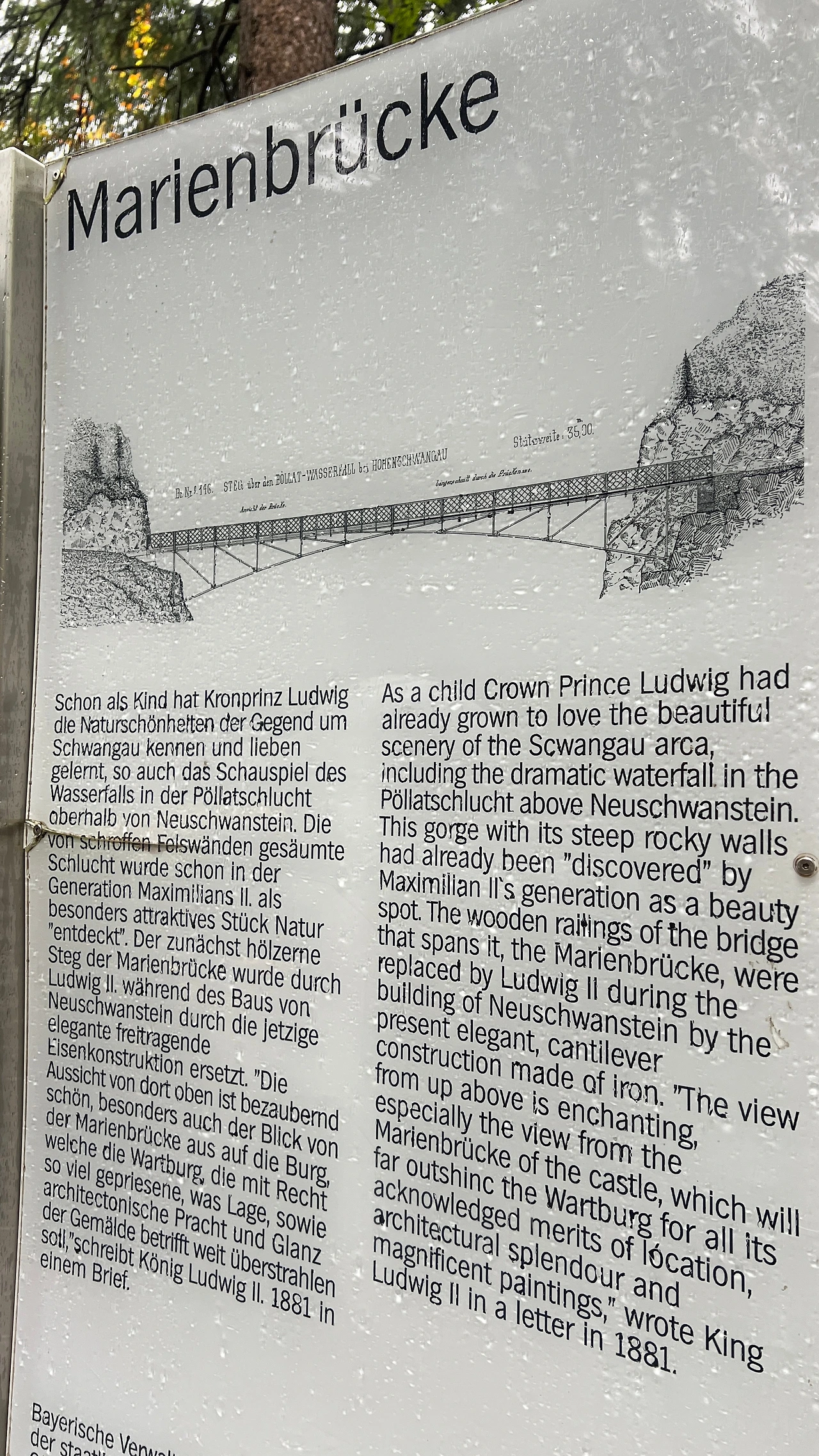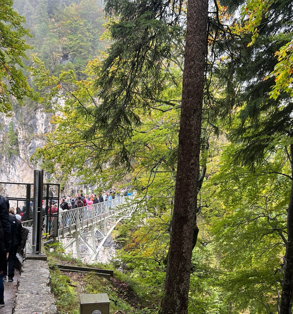 내부 성 투어는 하지 않고 성아 가장 잘 보인다는 마리엔브뤼케 (Marienbrücke) 다리로 향했다. 포엘라트 협곡 위 약 90m 높이에 걸쳐 있으며, 길이는 약 35m다. 다리 아래에는 폭포가 흐르며, 절벽 양쪽을 연결하고 있는데 노이슈반슈타인 성의 전경을 완벽히 조망할 수 있었다.
