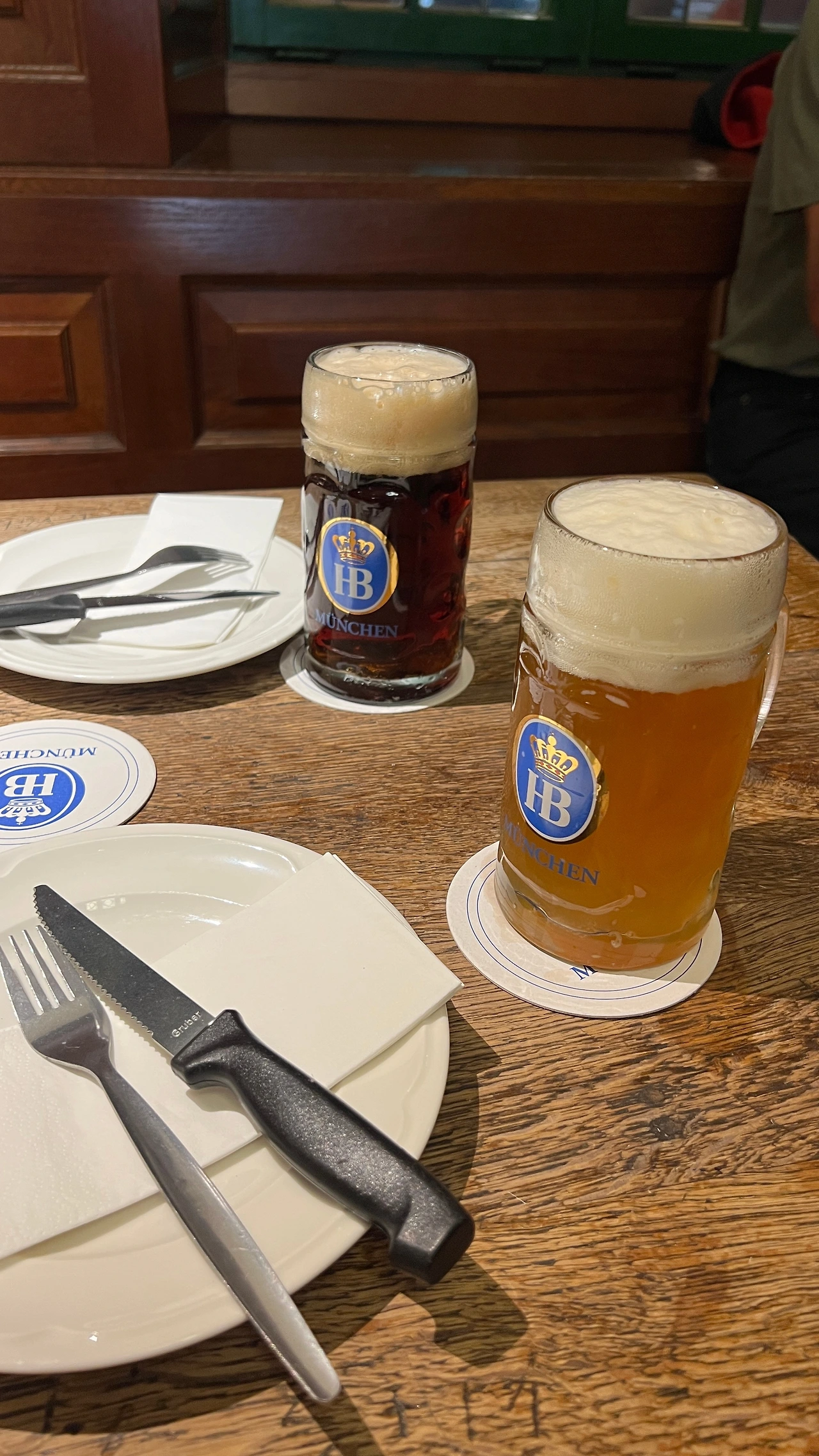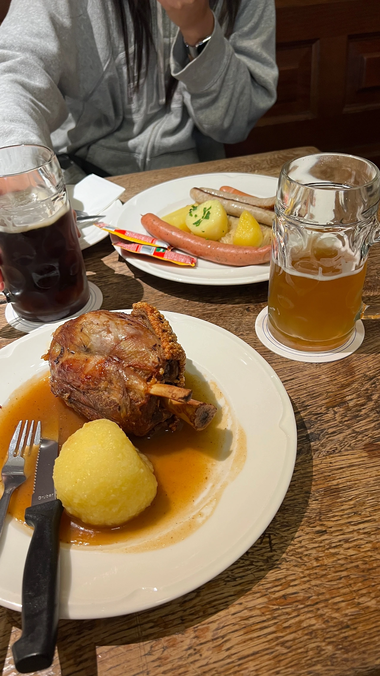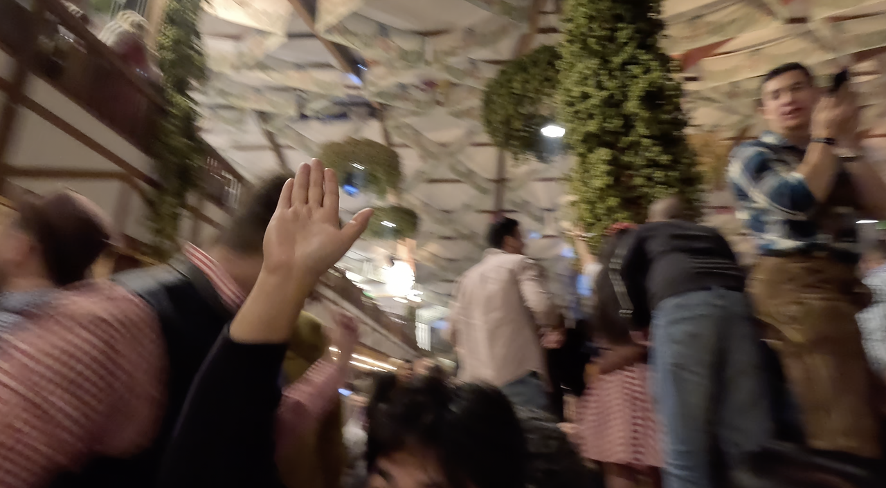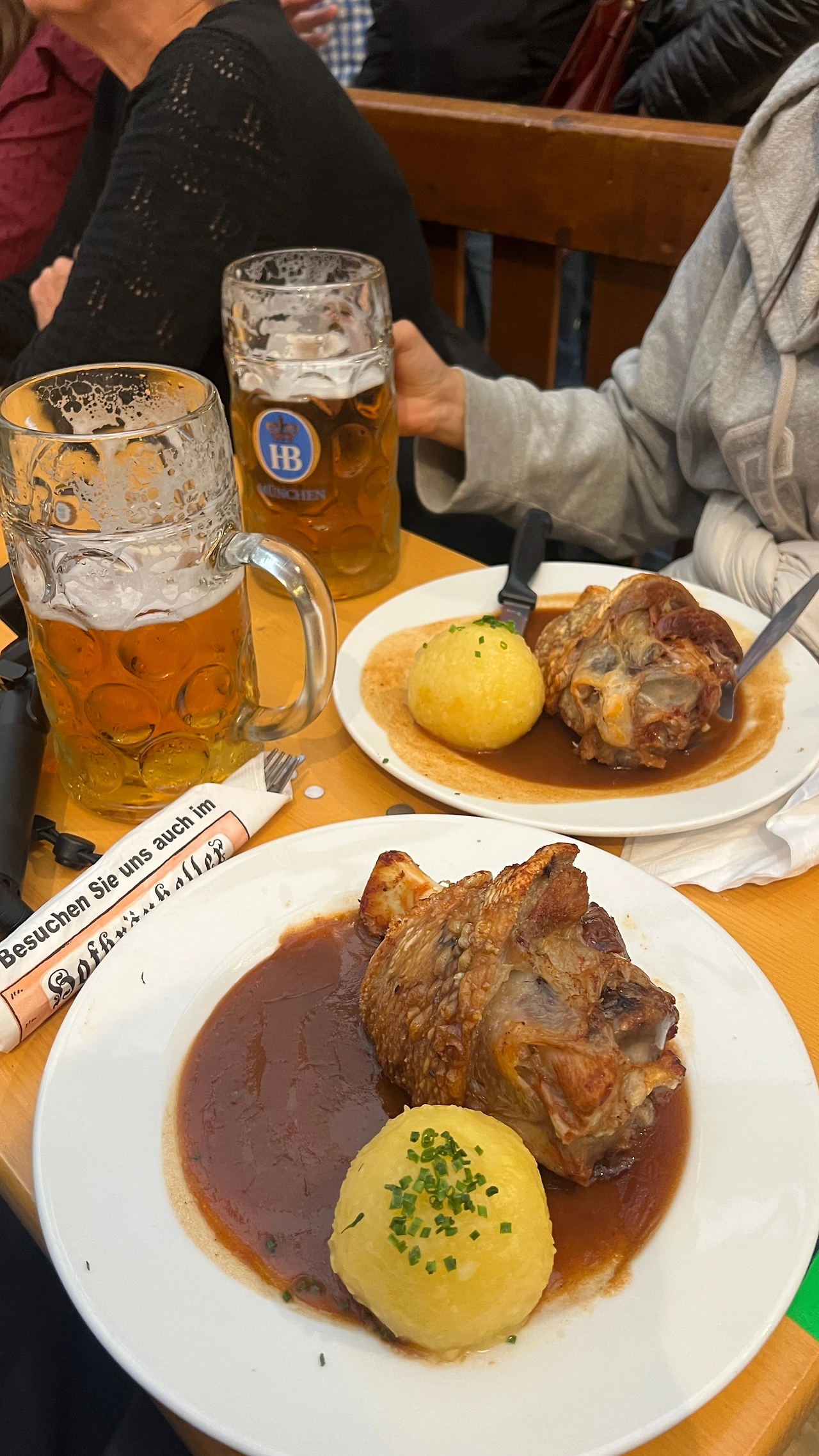 공식예약테이블은 최소 예약 단위가 10명이기에 카카오톡 오픈채팅방에 인원을 채우려는 방들이 열리기도 한다. 우리는 둘 다 예전 배낭여행 때 인상 깊게 먹었던 호프브로이에 들어가 한참을 돌아다닌 후 지나가던 직원에서 팁을 좀 쥐어주고 단체 자리를 마련해서 오픈채팅방에 올렸는데 이미 야외텐트에 자리를 마련한 그들은 오지 않았다. 둘이 오붓하게 고대하던 슈바이학센과 맥주를 시켜 축제를 즐기기 시작했다.