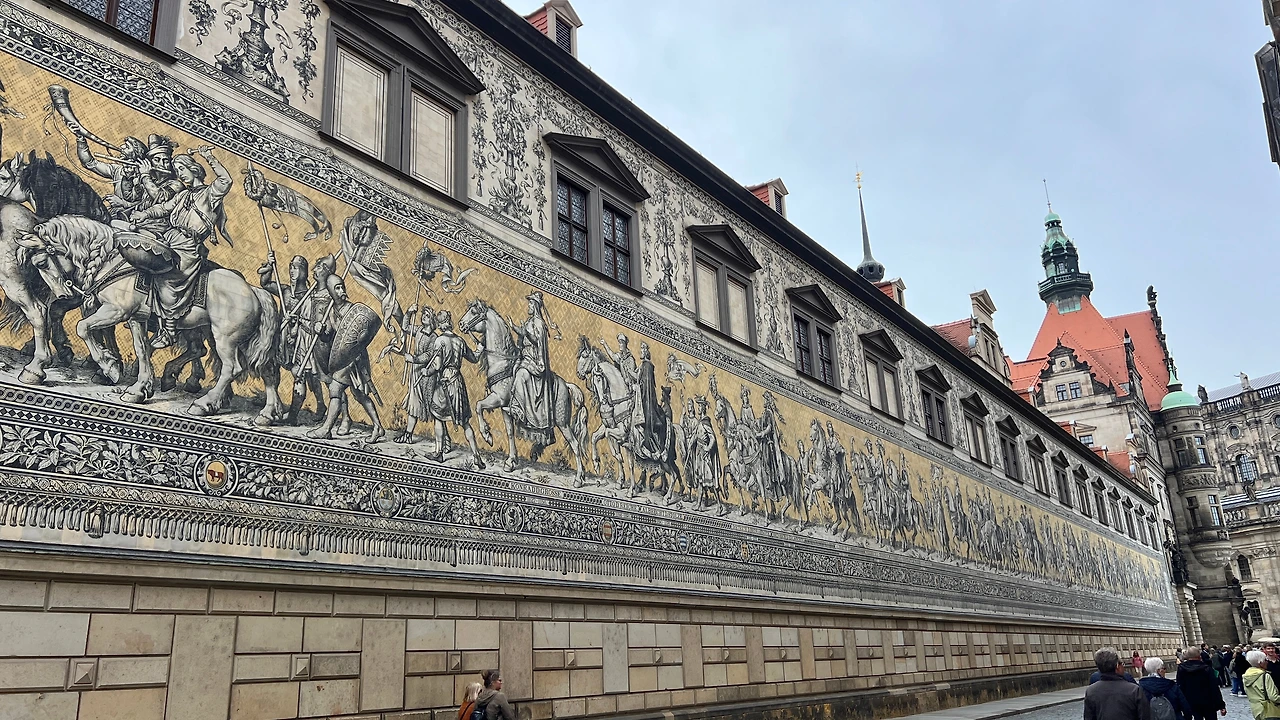 레지덴츠 궁전 외벽에 1900년대 초반에 만든 102m 길이의 긴 벽화가 있었다. 이 일대를 다스렸던 작센 왕가인 베틴 가문(House of Wettin)의 군주 35명을 나열한 벽화인데 도자기 타일 약 23,000장으로 만들어졌다고 한다. 전쟁에도 큰 피해 없이 현재까지도 원형 그대로를 유지하고 있었다.