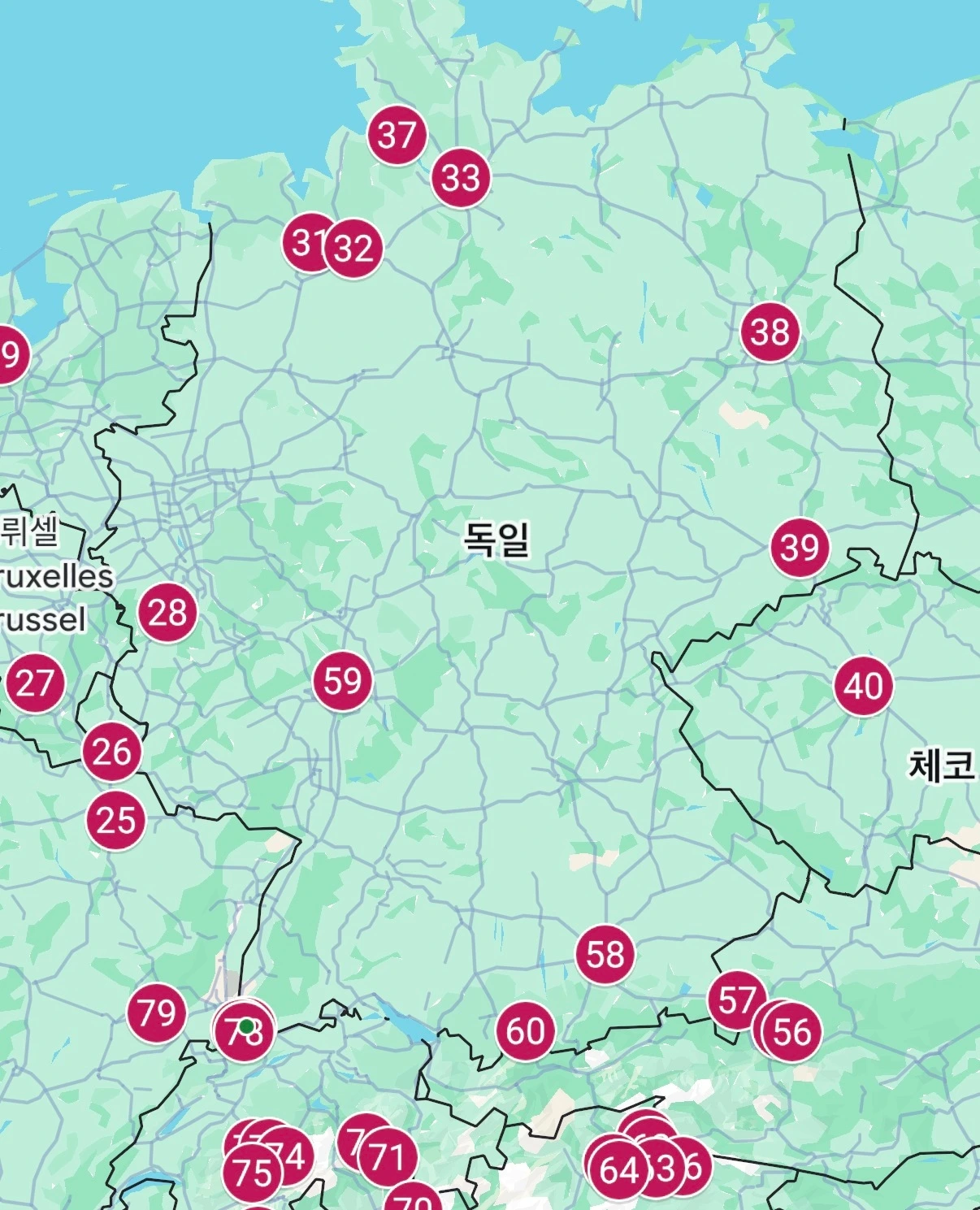 38. 베를린 여행을 마치고 39. 드레스덴을 거쳐 체코와 헝가리 등 동유럽 여행을 하고 오스트리아를 거쳐 58. 뮌헨으로 향했다. 이후 59. 프랑크푸르트에 살고 있는 지인의 초대를 받아 어쩔 수 없이 먼 길을 갔다가 다시 60. 휘센으로 갔다. 마지막 독일 여행지는 스위스와 프랑스, 독일이 국경을 맞대고 있는 78. 바일 암 라인 (Weil am Rhein)이었다.