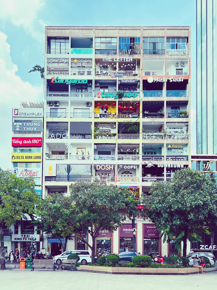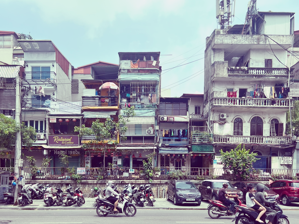 다닥다닥 붙은 길쭉한 건물들. 예전에는 도로에 면한 건물의 면적에 따라 세금을 매겼다고 한다. 그래서 베트남에는 이런 형태의 건물들이 많다. 1층에는 상점이나 음식점이고 그 위로는 주택으로 사용된다.