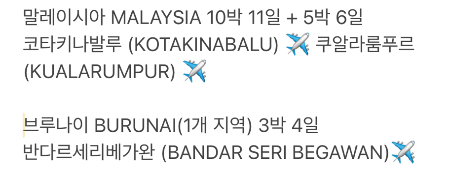 말레이시아는 무비자로 90일간, 브루나이는 30일 동안 체류가 가능하다. 우리가 방문했던 말레이시아의 코타키나발루와 쿠알라룸푸르, 브루나이의 반다르세리베가완은 모두 한국에서 직항이 있어서 특히나 한국인 관광객이 많았다. 우리는 운 좋게도 코타키나발루로 놀러 온 와이프 친구에게 필요한 물품을 받고 우리에게 필요 없는 짐을 한국으로 보내기도 할 수 있었다.