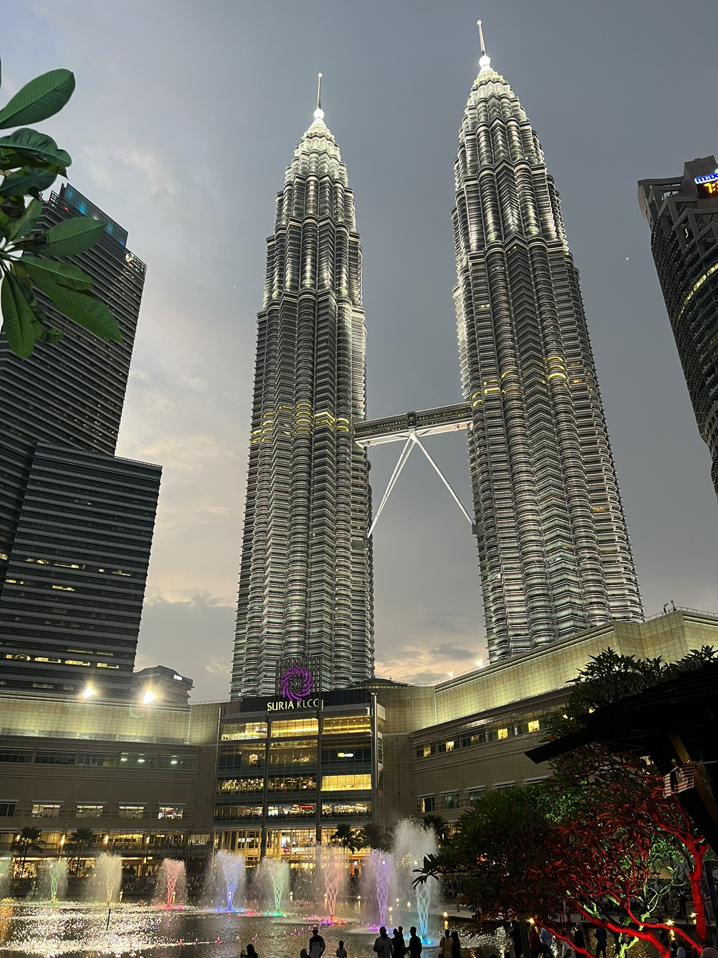 90년대 말부터 2000년대 초반까지 세상에서 가장 높은 빌딩이라는 타이틀을 가지고 있던 페트로나스타워에도 다녀왔다. 현재도 가장 높은 트윈타워라는 타이틀은 놓치지 않고 있다. 451.9m 높이인데 사진상 오른쪽 타워를 일본 건설사가 지었다고 하고 왼쪽 타워를 우리나라 건설사가 시공했다고 한다. 그래서 그런지 왼쪽 건물이 더 잘 지은 거 같다. 타워 안에 백화점을 구경하고 나와서 타워 바로 앞 KLCC 공원 어딘가에 자리를 잡았다. 타워의 야경을 찍기 위해 수많은 사람들이 몰려들었다.