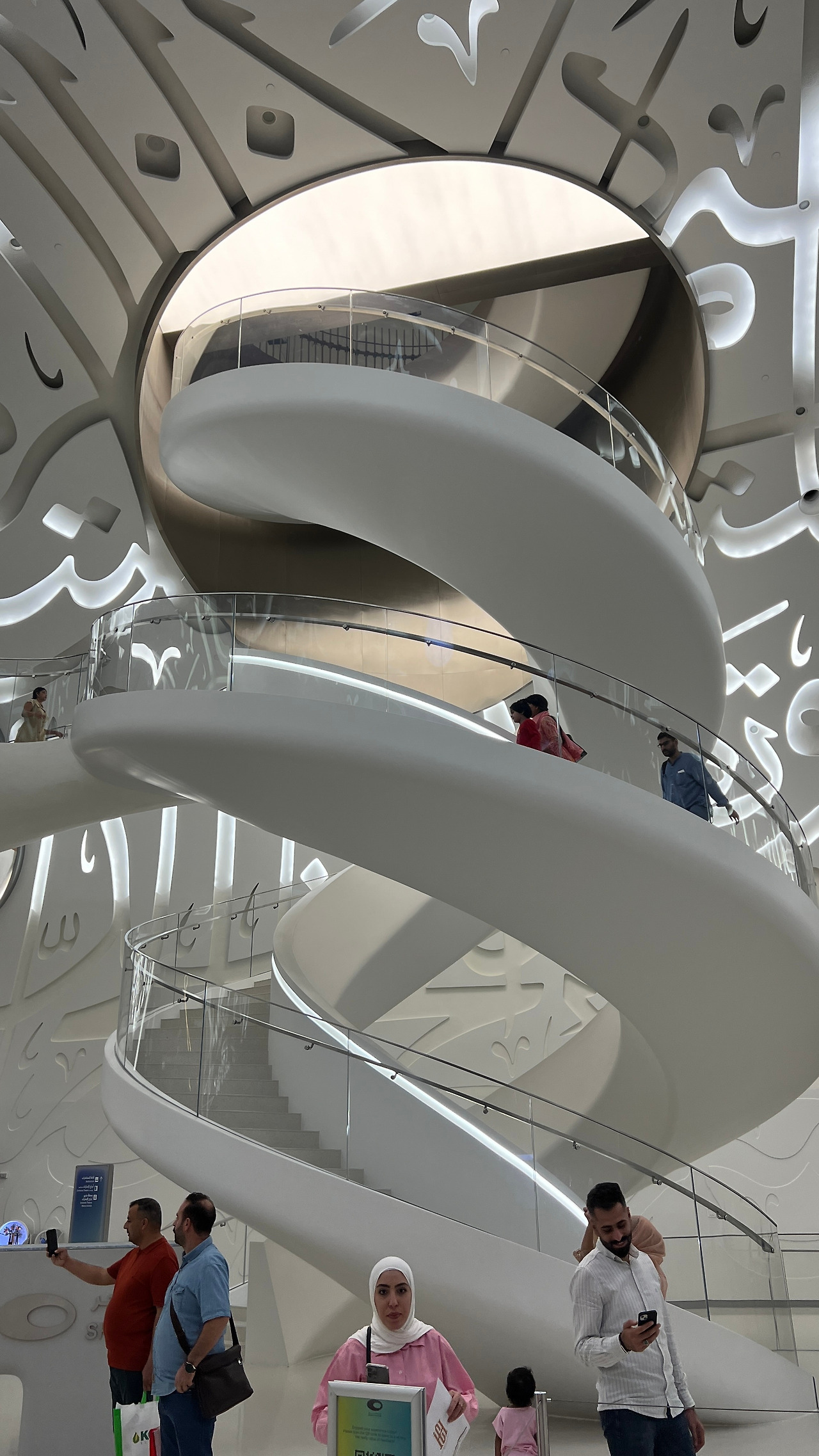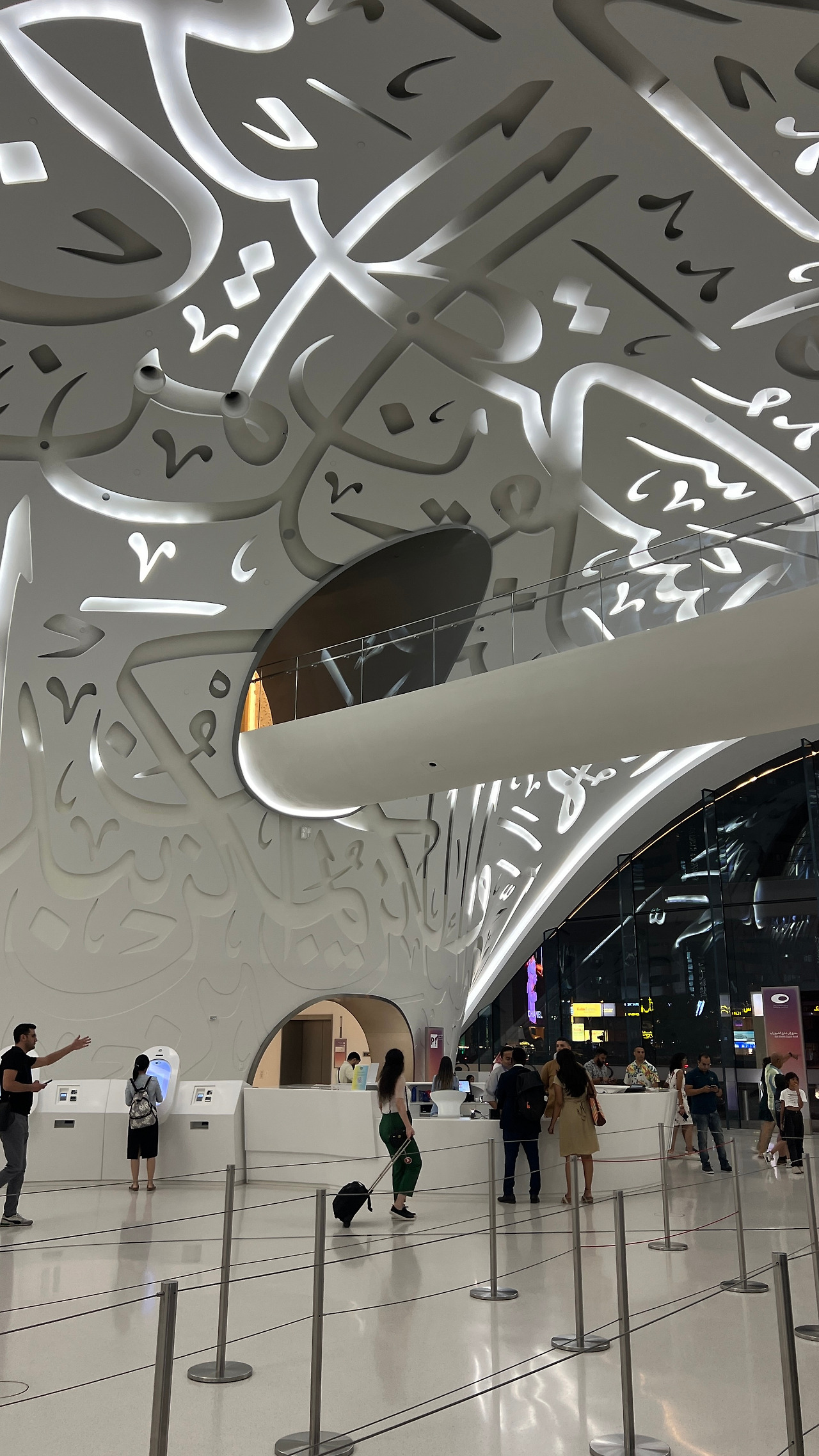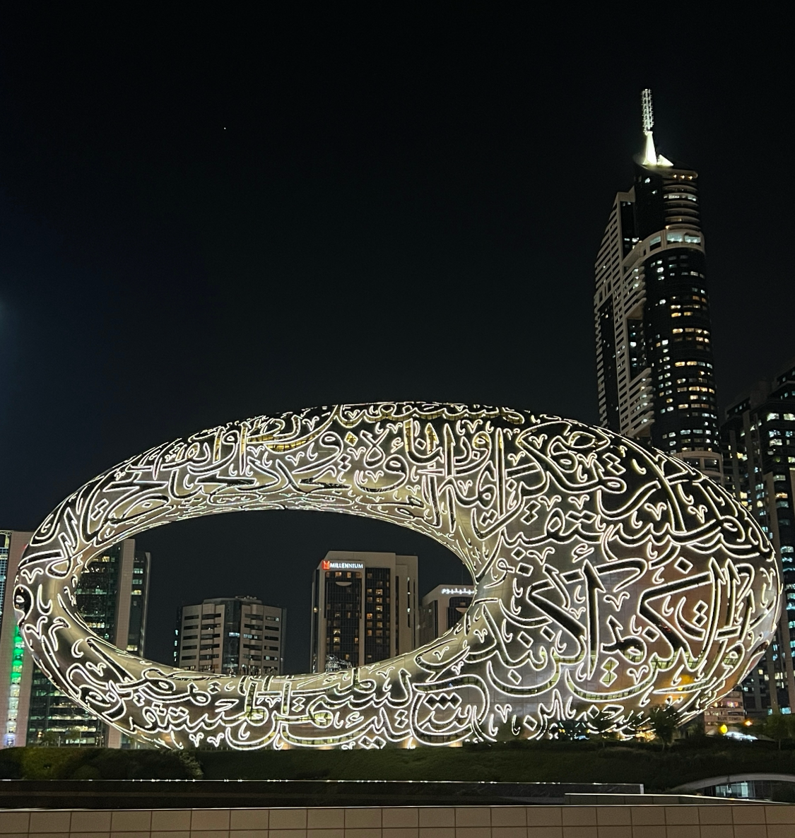 도넛모양 형태의 외관에는 아랍어로 된 캘리그래피를 새긴 1,024개의 패널이 사용됐다. 두바이 통치자의 미래에 대한 생각을 나타내는 세 가지 문구가 적혀 있다고 한다. 실내에서도 조명과 함께 천장과 벽을 감싸고 있어서 우주선을 컨셉으로 한 건물 디자인을 납득할만한 신비한 분위기를 자아낸다.