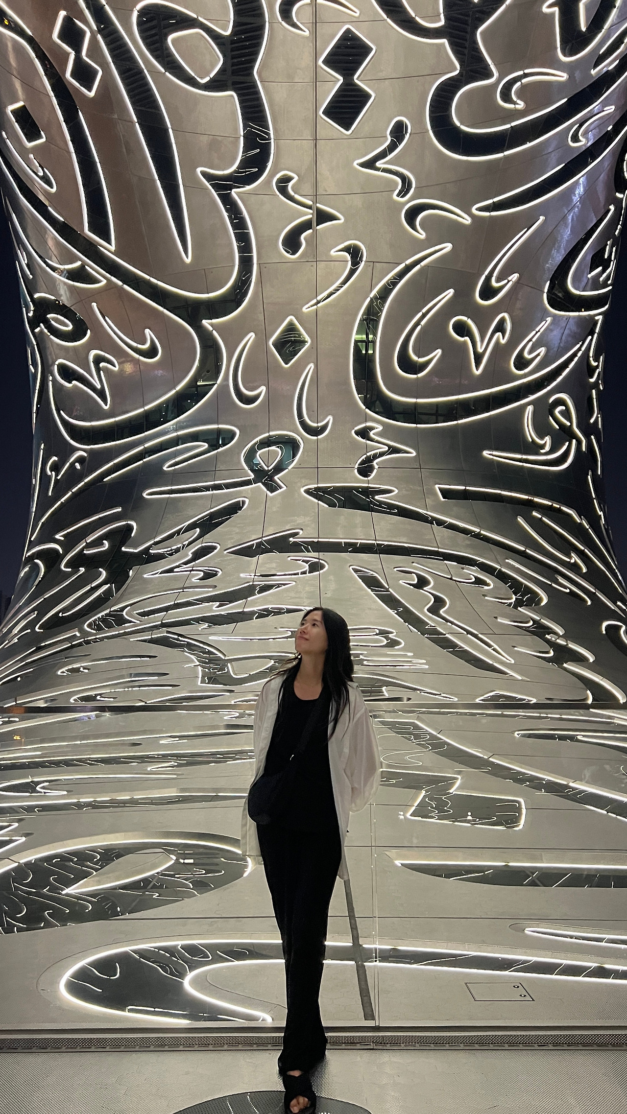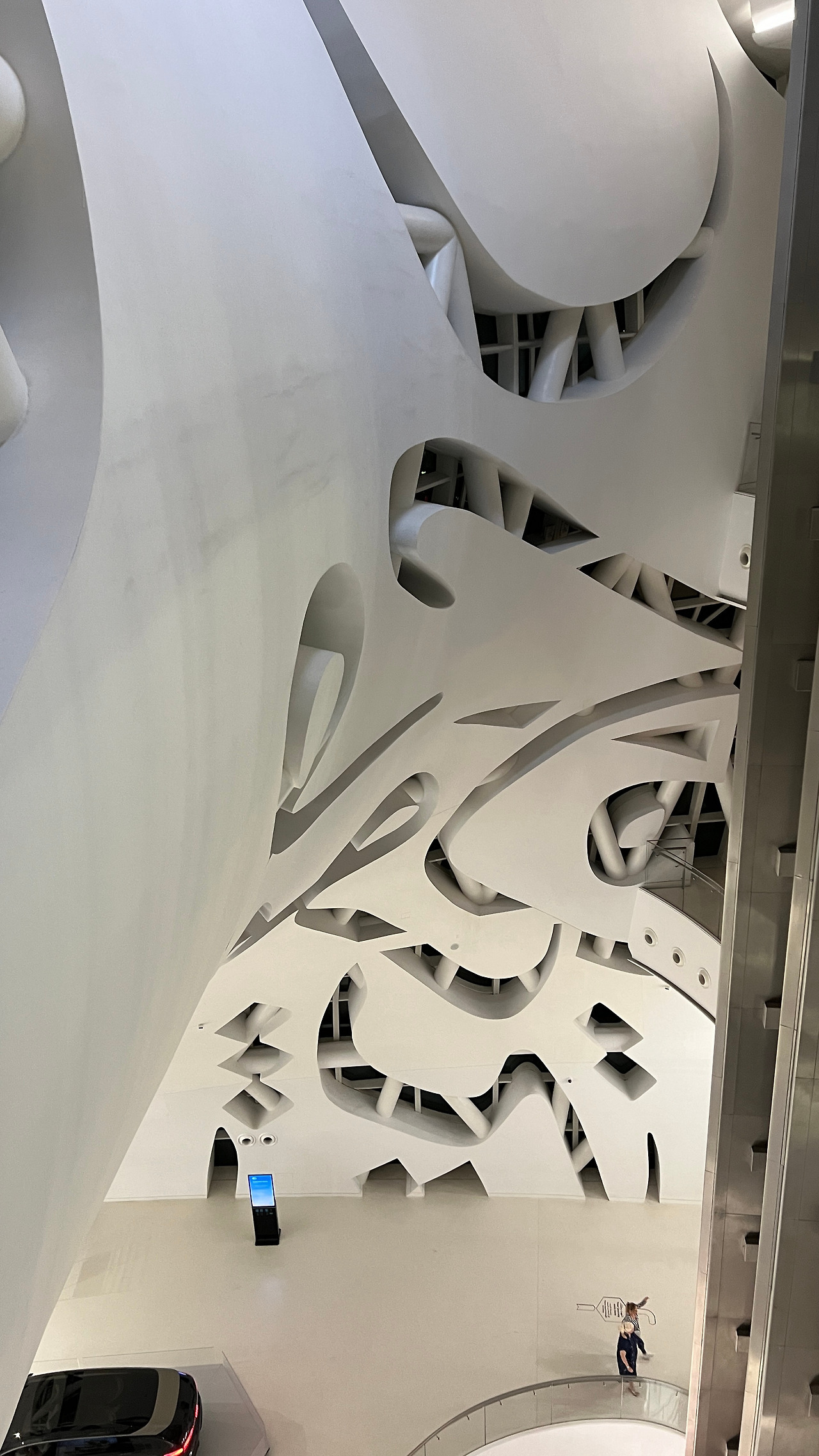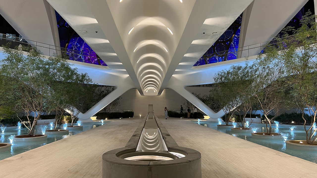 도넛모양 형태의 외관에는 아랍어로 된 캘리그래피를 새긴 1,024개의 패널이 사용됐다. 두바이 통치자의 미래에 대한 생각을 나타내는 세 가지 문구가 적혀 있다고 한다. 실내에서도 조명과 함께 천장과 벽을 감싸고 있어서 우주선을 컨셉으로 한 건물 디자인을 납득할만한 신비한 분위기를 자아낸다.