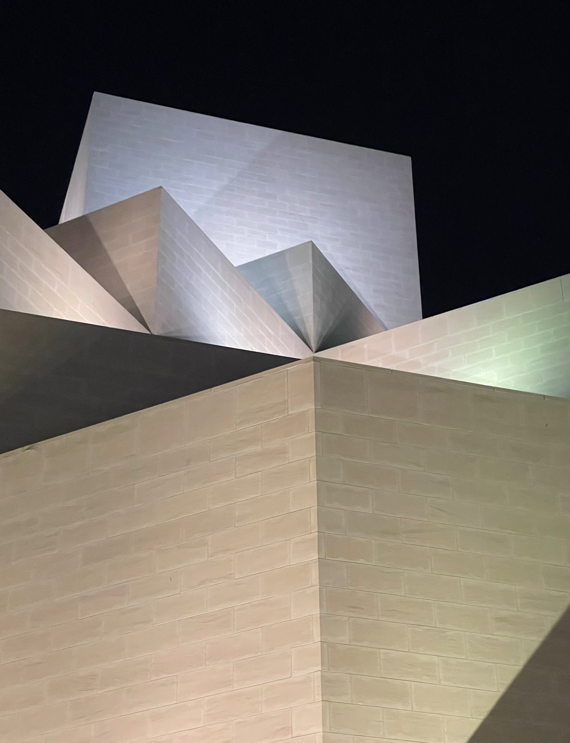 해가 지고 바다를 바라보고 있는 1층 테라스에 나가면 기하학적으로 쌓아 올린 메스덩어리들이 조명으로 인해 더욱 신비로운 모습으로 나타난다.