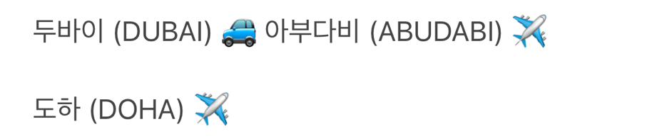 아랍에미레이트 8박 9일, 카타르 4박 5일 일정으로 여행했다. 두 나라 모두 무비자로 각각 90일과 30일 동안 체류가 가능했다. 각 도시에서 4박 5일씩 머물렀다.