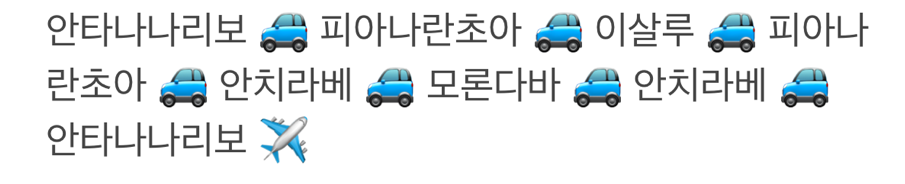 일정을 계획하면서 현지 한식당 서울호텔의 사장님께 도움을 많이 받았는데 직접운전은 도로상태 때문에 힘들다고 하셔서 기사포함 렌터카를 알아봐 주셨다. 안타나나리보에서 우리 동선의 분기점인 안치라베라는 도시까지 약 160km밖에 안되지만 4시간이 넘게 걸리는 걸 보면 도로 상태가 얼마나 좋지 않은지 알 수 있다.