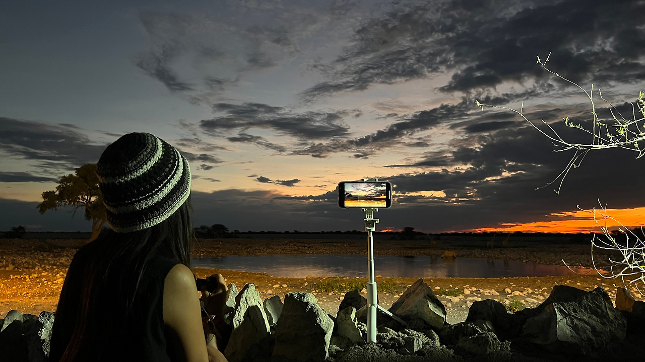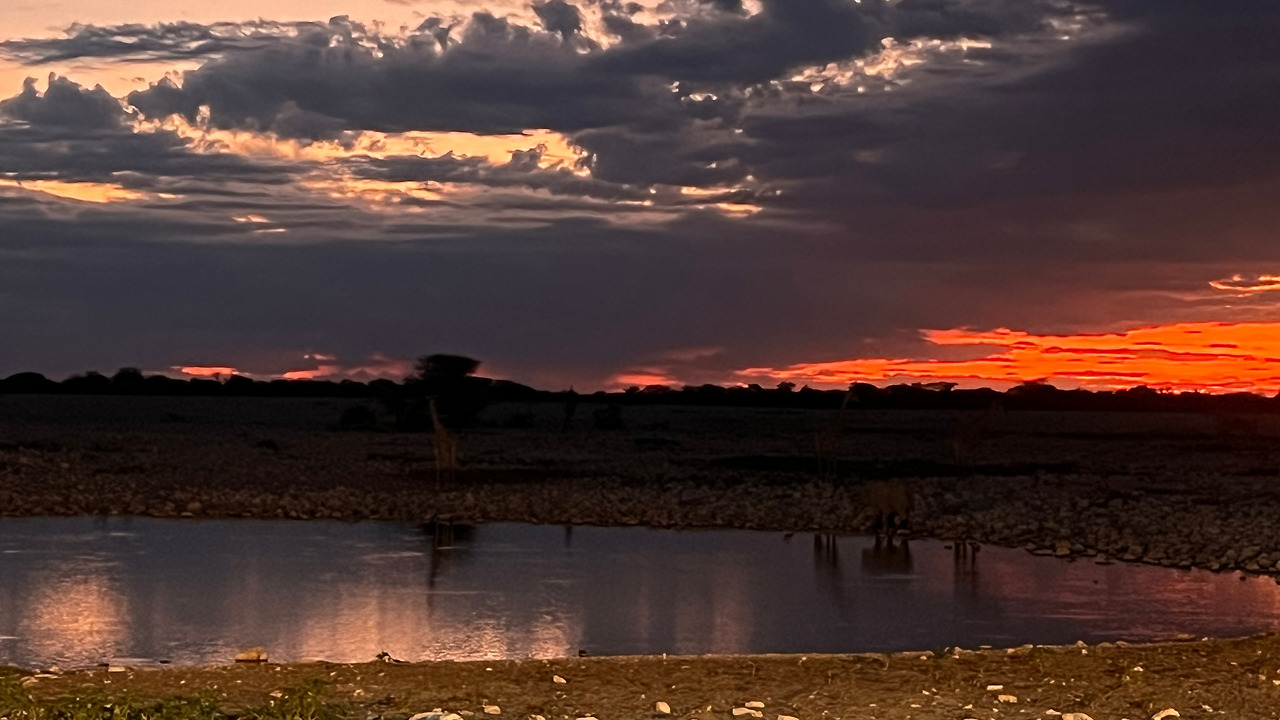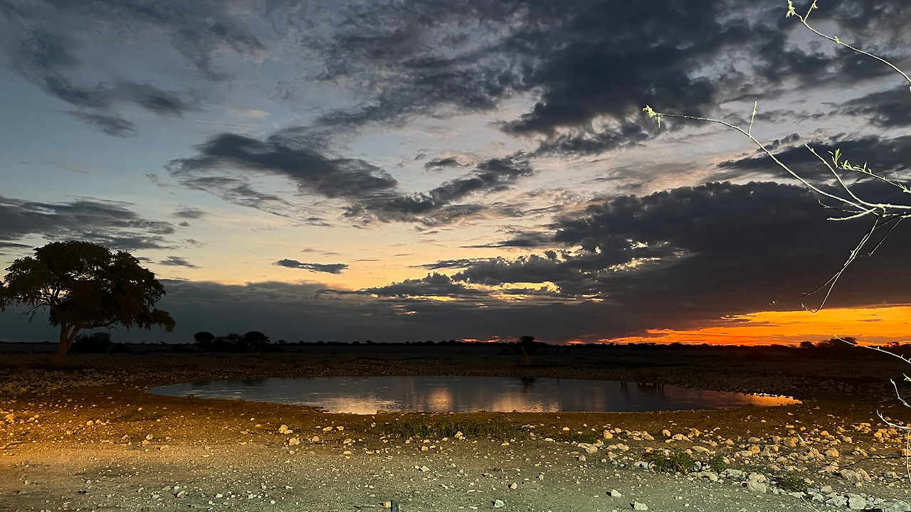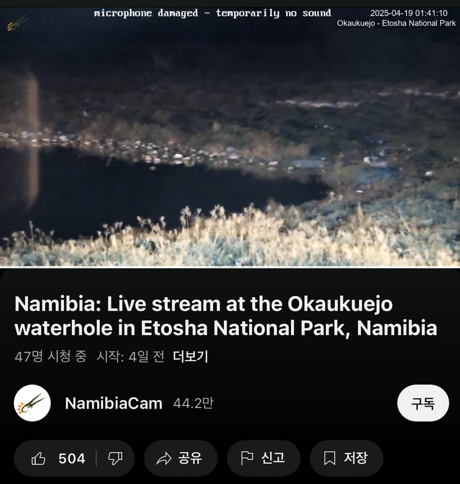 텐트를 펼치고 캠핑준비를 하다 보니 해가 넘어가기 시작한다. 워터홀 주변으로는 롯지들이 위치해 있었기 때문에 우리 캠핑 사이트는 워터홀과는 조금 떨어진 곳에 있었다. 물 마시러 오는 동물들을 못 보면 어쩌나 걱정했는데 초조해할 필요가 없었다. 워터홀을 항시 비춰주는 카메라로 유튜브에 라이브 스트리밍을 해주고 있기 때문이다.