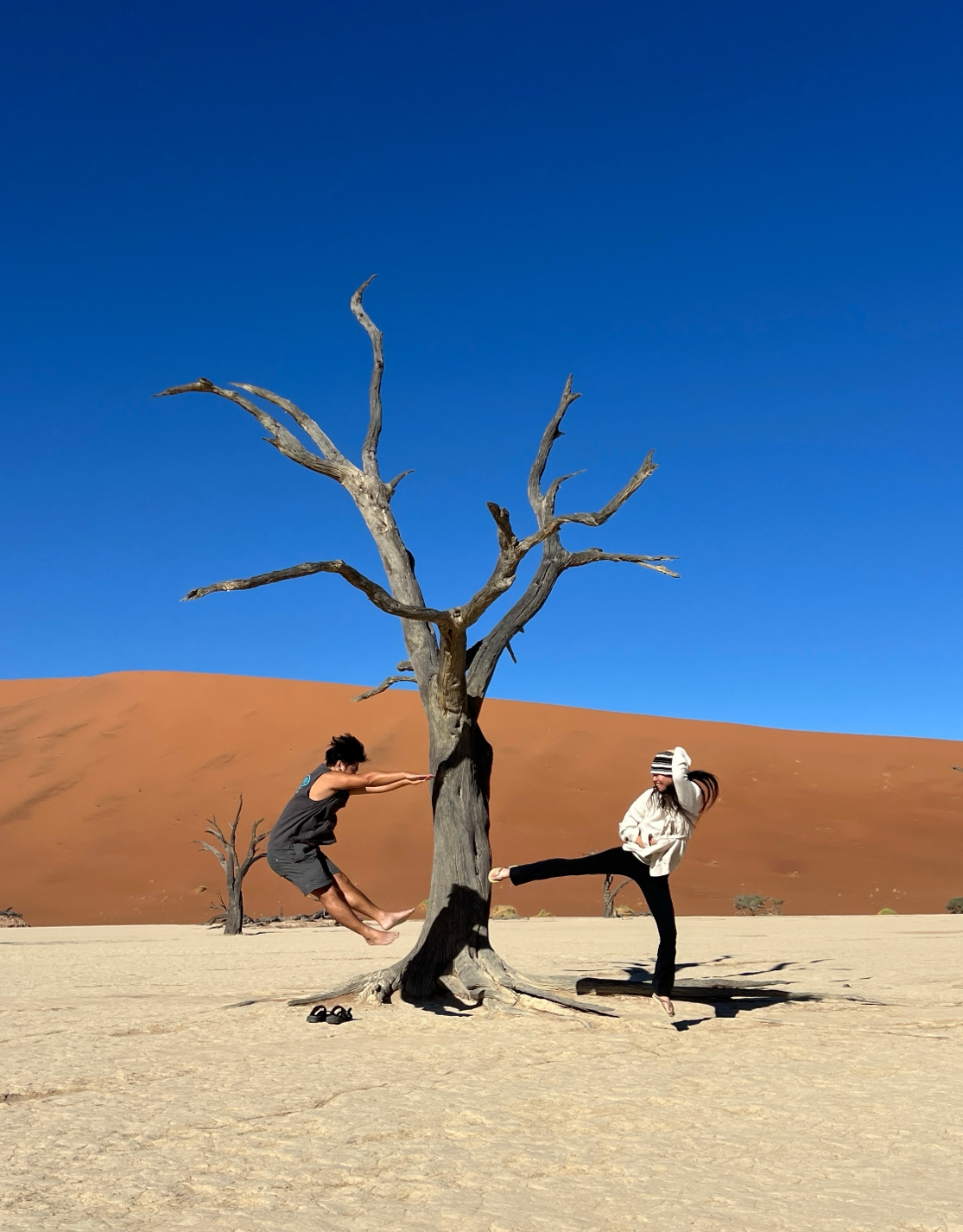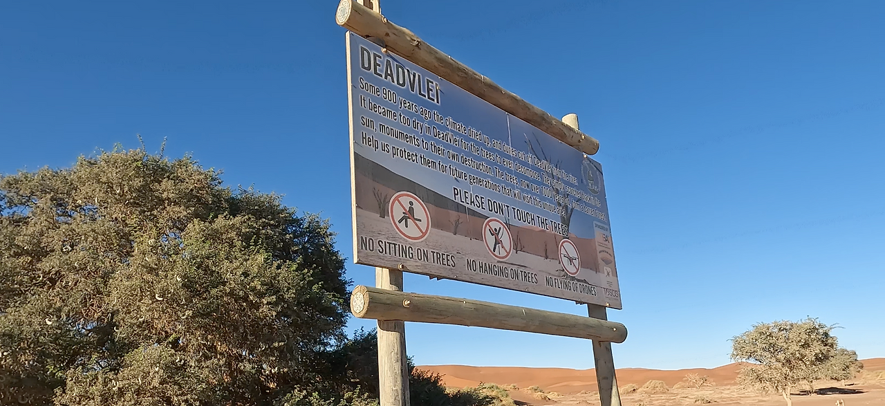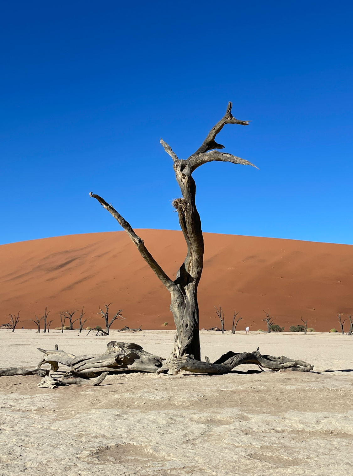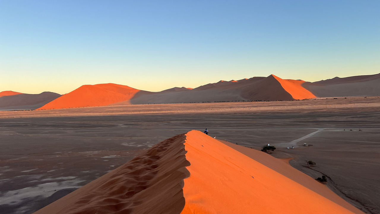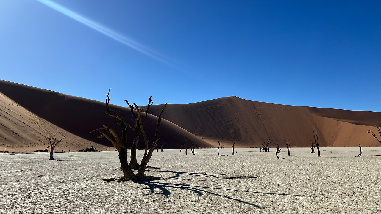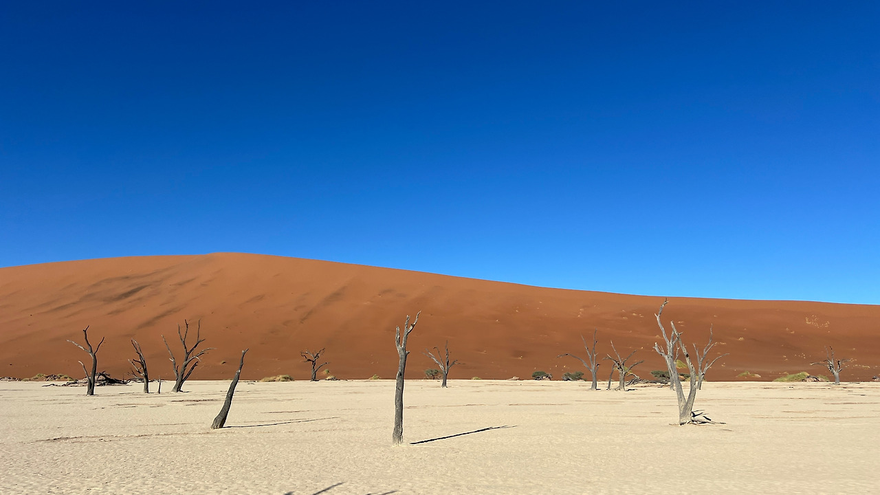 다음 목적지는 듄 45 근처의 데드블레이다. 죽은 습지라는 이름답게 몇백 년 전에 죽은 나무들만 덩그러니 남아있는 바짝 메마른 땅이다. 예전에는 물이 고여있었을 바닥은 하얗게 바짝 마른 점토가 되었고 주변은 오렌지색 모래언덕으로 둘러싸여 있다. 파란 하늘과 까만 나무의 실루엣은 아무렇게나 찍어도 작품이 되었다.
