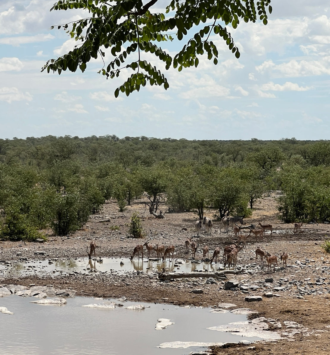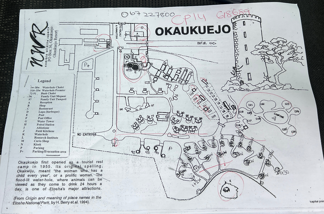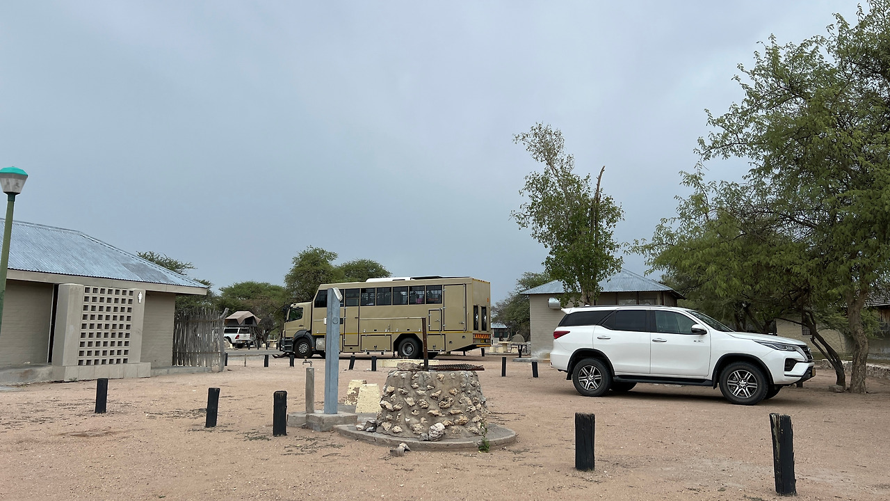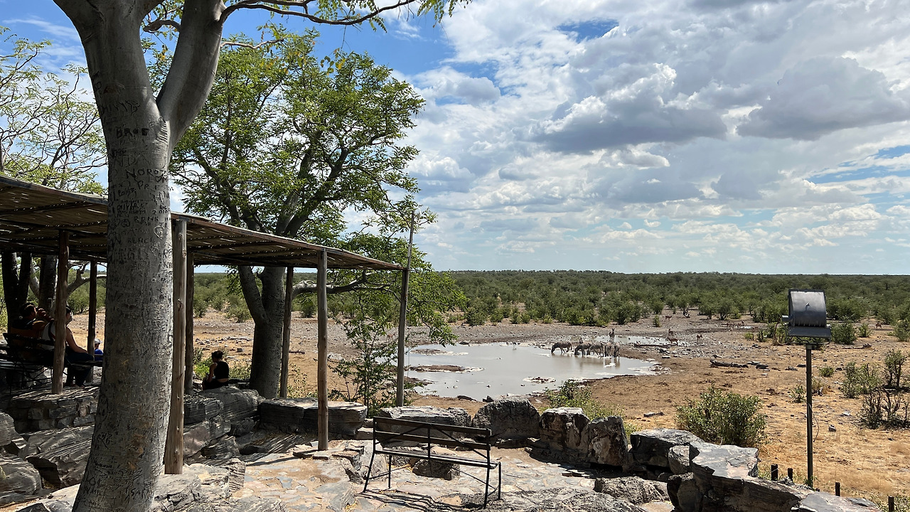 드디어 에토샤 국립공원의 오카쿠에조 (Okaukuejo) 캠핑장에 도착했다. 캠핑장에 큰 물웅덩이가 있어서 물 마시러 오는 야생동물들을 관찰할 수 있는 곳으로 유명하다.