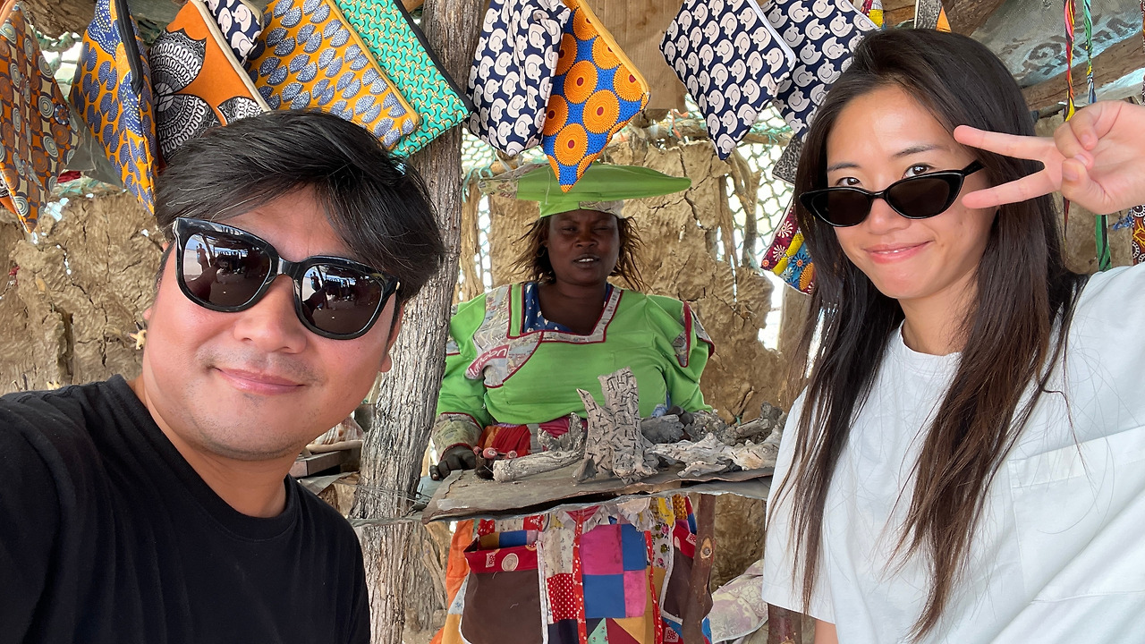 다음 부족은 헤레로족이다. 1900년대 초반에 당시 독일제국의 지배를 받으면서 수많은 헤레로족이 학살당했다는 사실을 알게 되었다. 아프리카 한복판에서 발끝까지 오는 화려한 색상의 드레스와 챙이 넓은 모자를 쓰고 있는 모습이 정말 독특하다고만 생각했는데 슬픈 역사가 있었다. 그들의 모습은 당시 선교사 부인들의 옷 스타일이라고 하는데 나미비아의 스타일로 변형되어 지금까지도 이어져오고 있다고 한다. 사진 찍는 걸 특히 싫어한다는 헤레로족인데 기념품을 사고 사진촬영에 동의를 구했다.