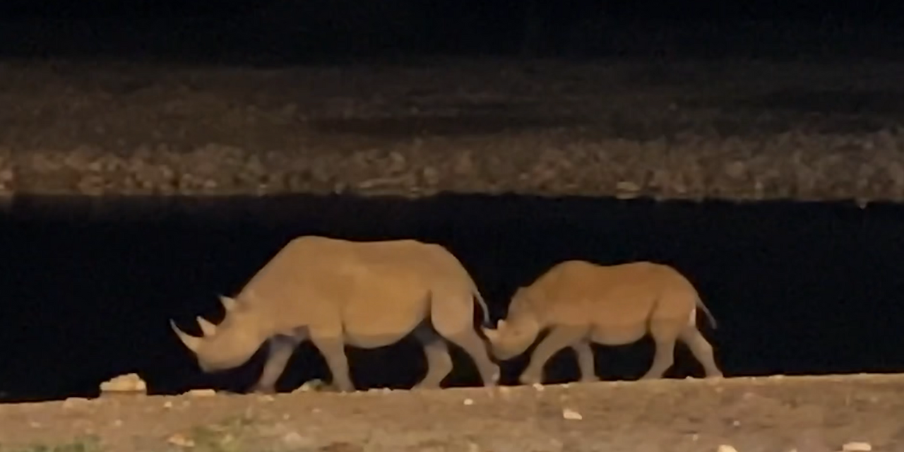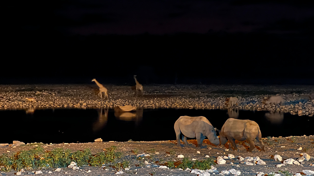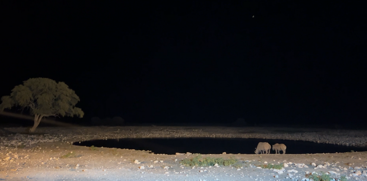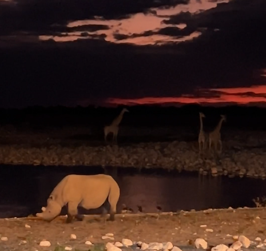 어느새 어둠이 내리자 또 동물들이 물을 마시러 모여든다. 그동안 못 봐서 아쉬웠던 코뿔소를 원 없이 봤다.
