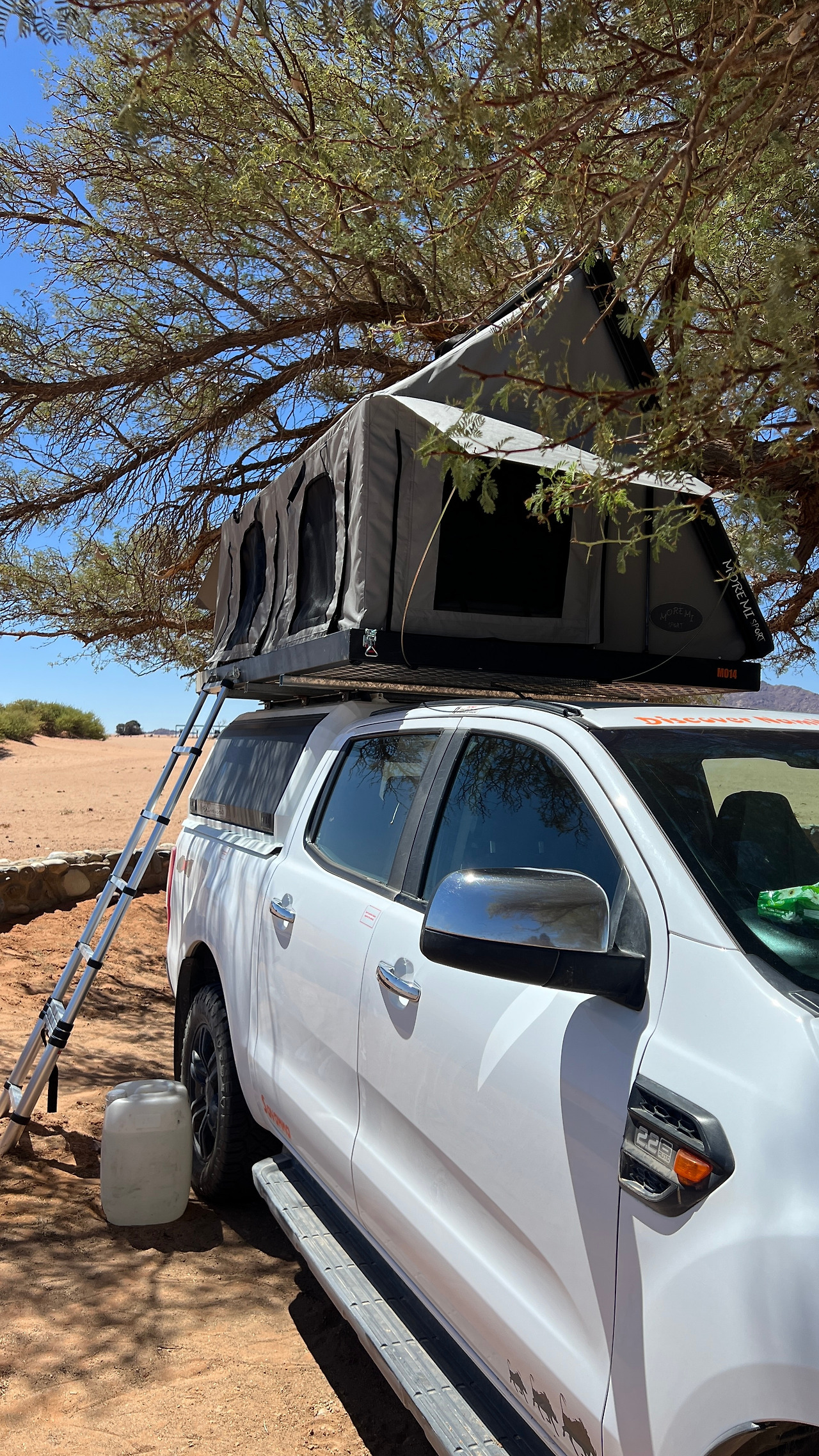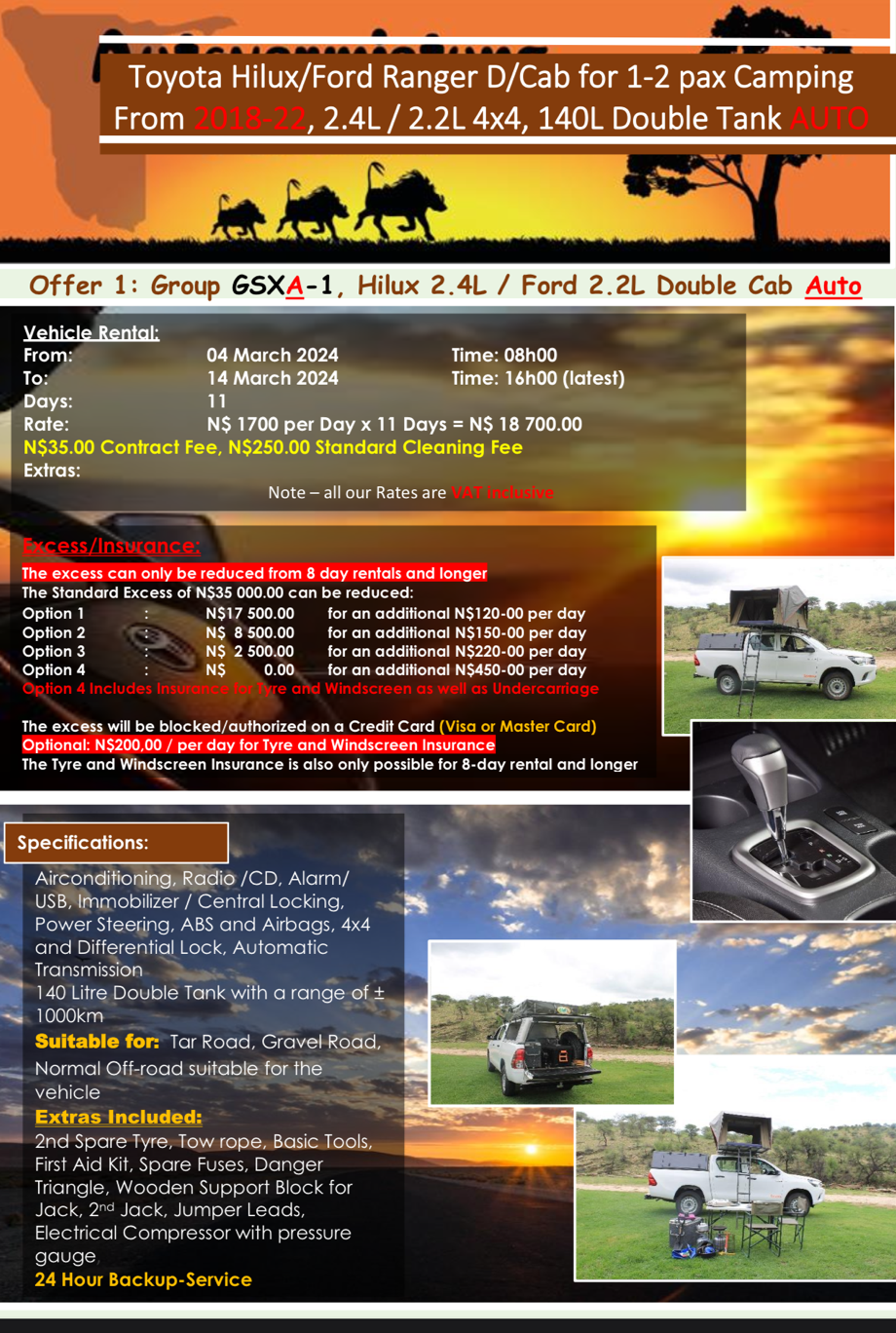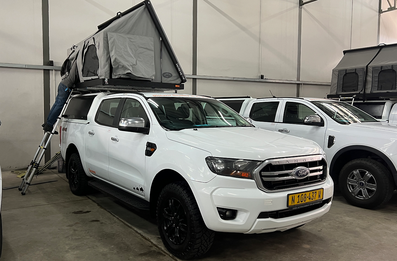 우리는 사바나라는 업체를 선택했다. 풀커버 보험에 연료탱크도 두 개였고 스페어타이어와 타이어교체 장비도 준비되어 있었다. 그리고 지붕에 텐트도 설치되어 있었고 트렁크에는 냉장고와 컴프레셔도 설치되어 있는 포드 레인저 차량을 각종 캠핑도구와 함께 하루에 한화 약 14만 원에 예약했다. 캠핑카에는 연료탱크가 두 개였는데 이동거리가 길고 척박한 도로사정 때문에 중간에 주유소가 많지 않아 한번 주유할 때 넉넉히 채우기 위함이었다.
