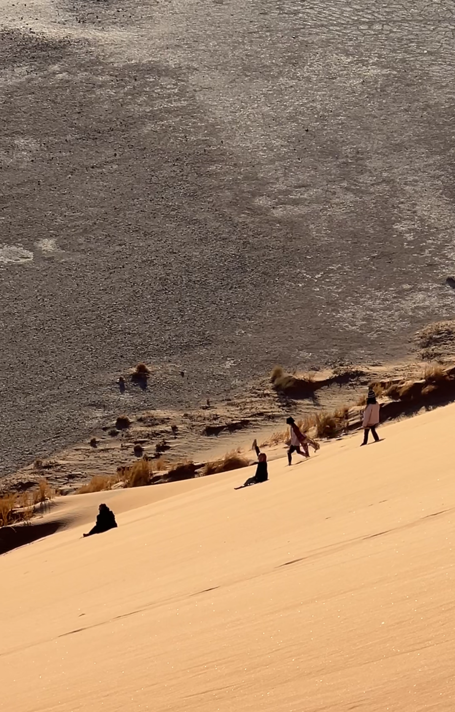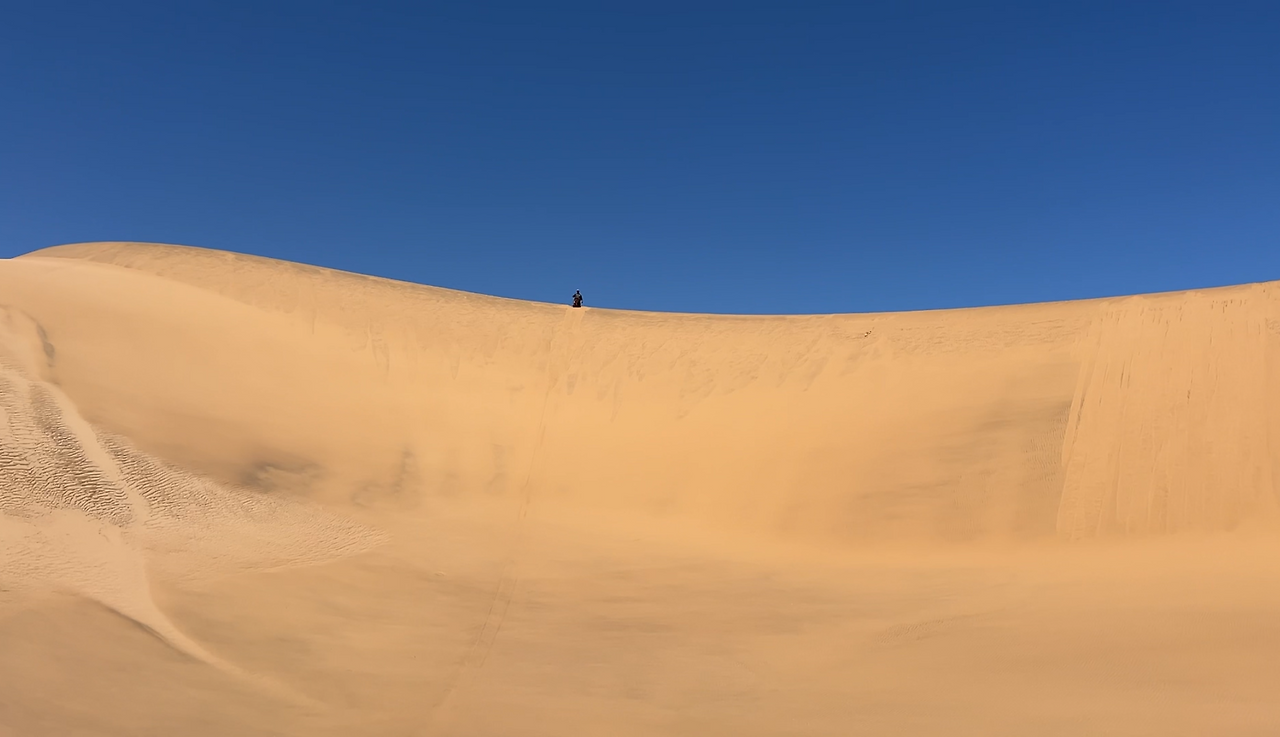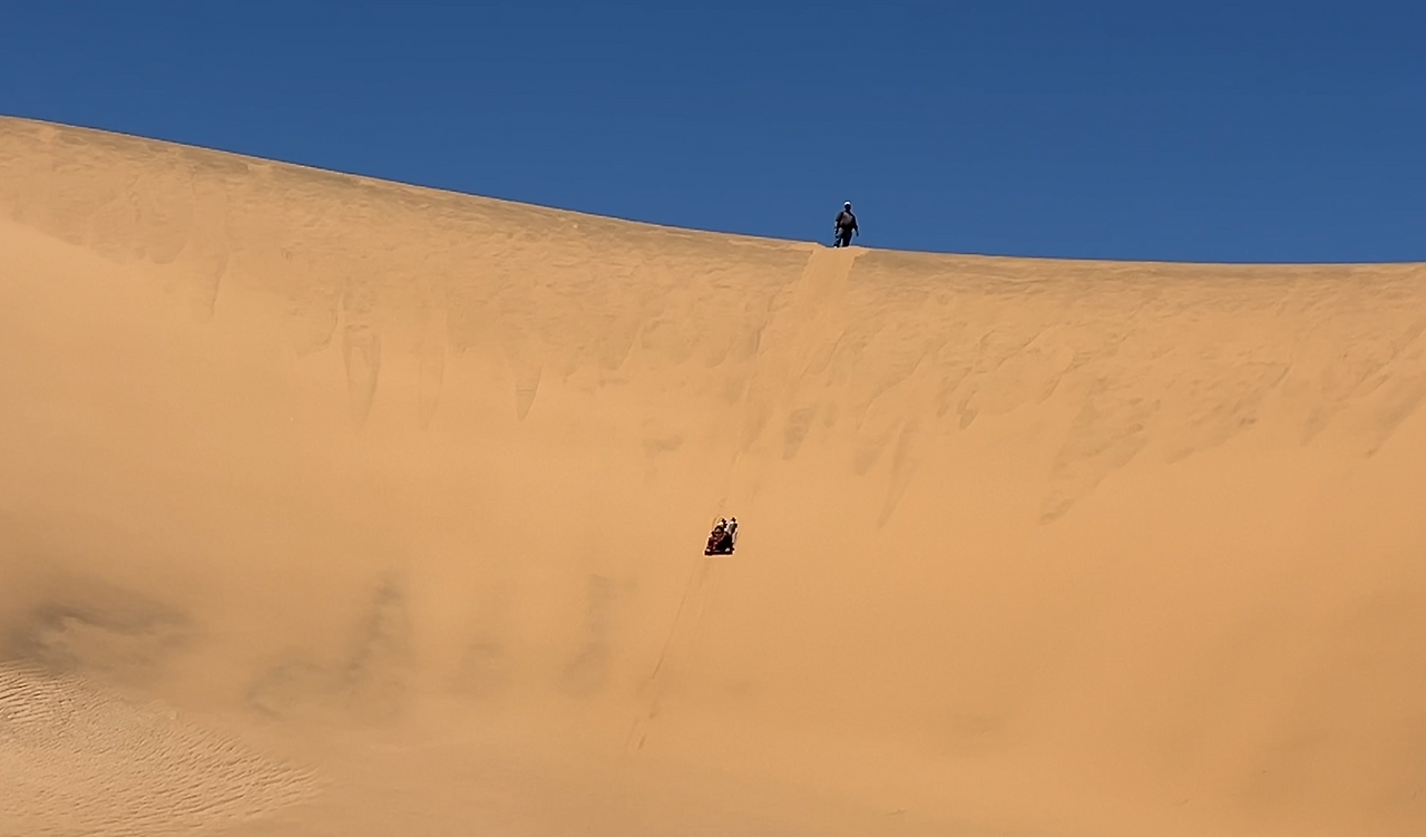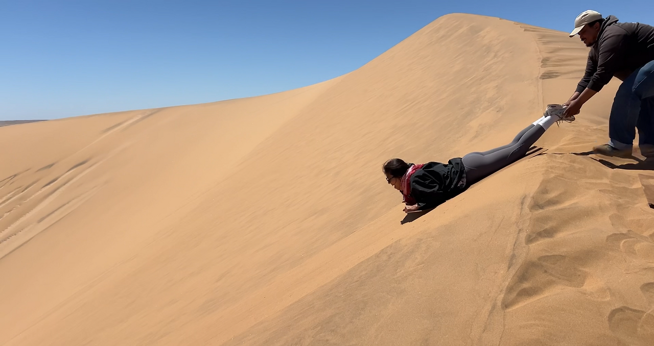 조금 더 달린 후에 아주 높은 모래언덕에 올라왔다. 아랍에미레이트의 아부다비에서도 샌드보딩을 경험해 봤지만 이곳의 샌드보딩은 찐이었다. 장점이자 단점은 한번 타고 내려오면 또다시 타러 올라가고 싶은 생각이 들지 않을 정도로 언덕이 높다는 것이다.