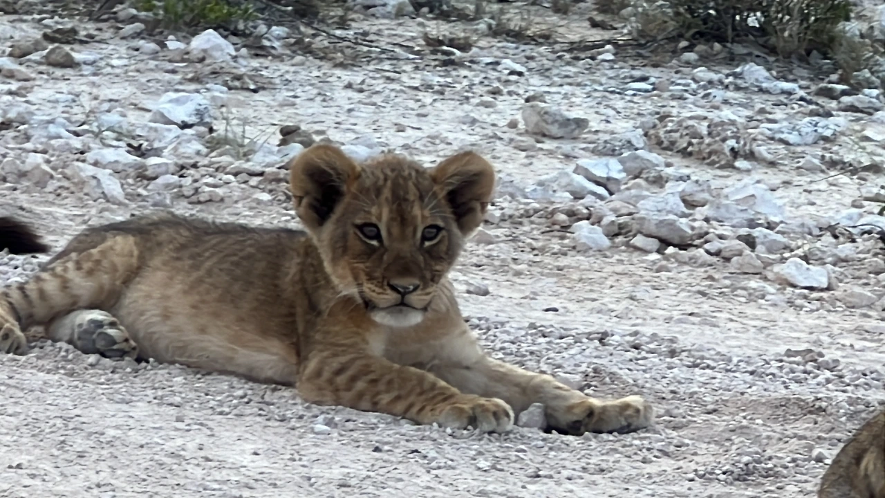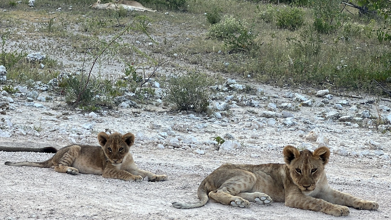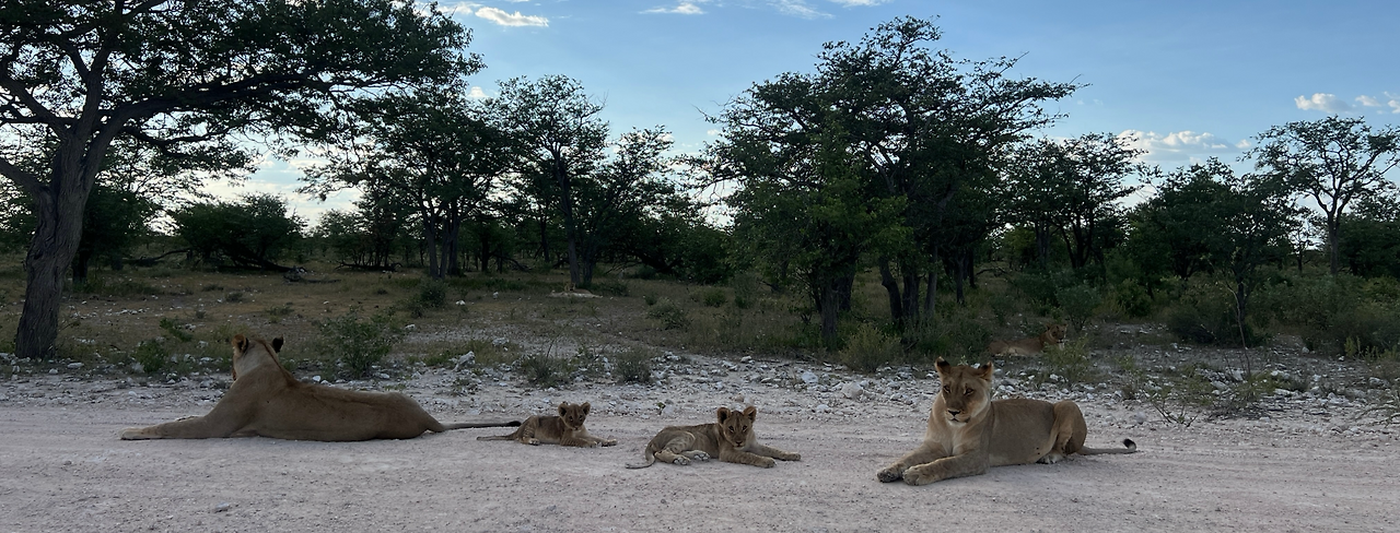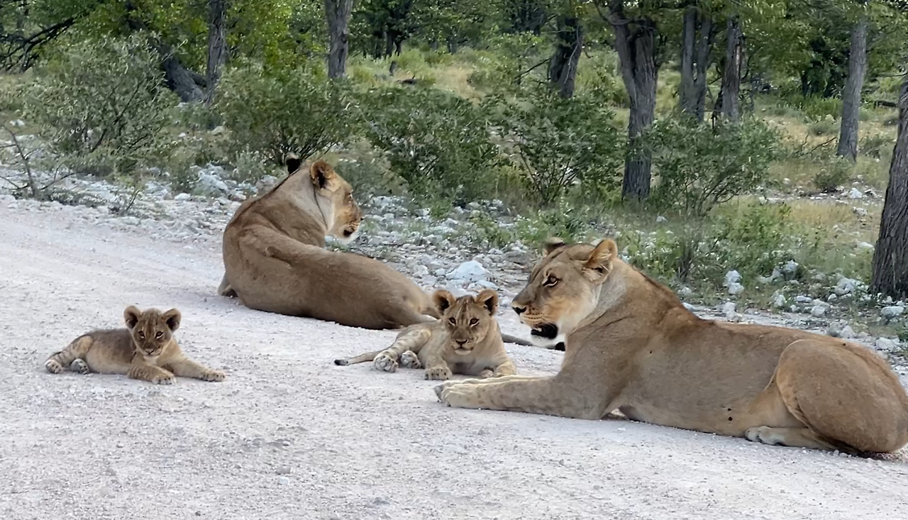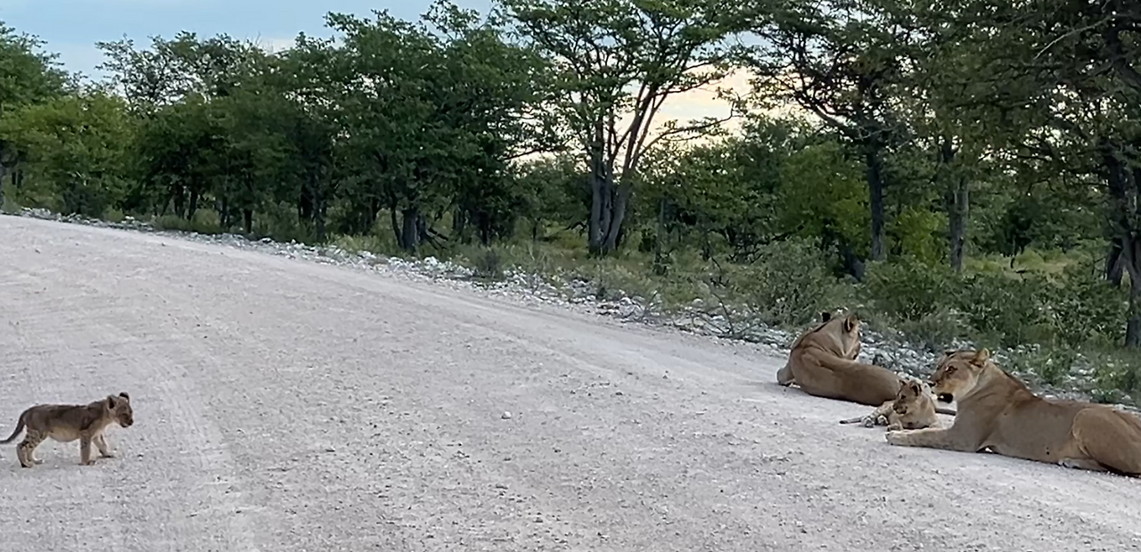 새끼사자다!! 점점 다가가니 사자가족이 도로에 누워있다. 엑셀에 발을 떼고 서서히 움직여서 그들 바로 옆에 세우고 시동을 껐다. 대박이라고 소리치고 싶었지만 큰소리도 못 내고 숨죽이며 신기해하고 있는데 그들과 눈을 마주치자 소름이 돋을 정도로 무시무시했다. 방금 전까지 귀여워하면서 창문도 조금 내리고 구경했는데 다시 문을 잠그고 창문을 올렸다.