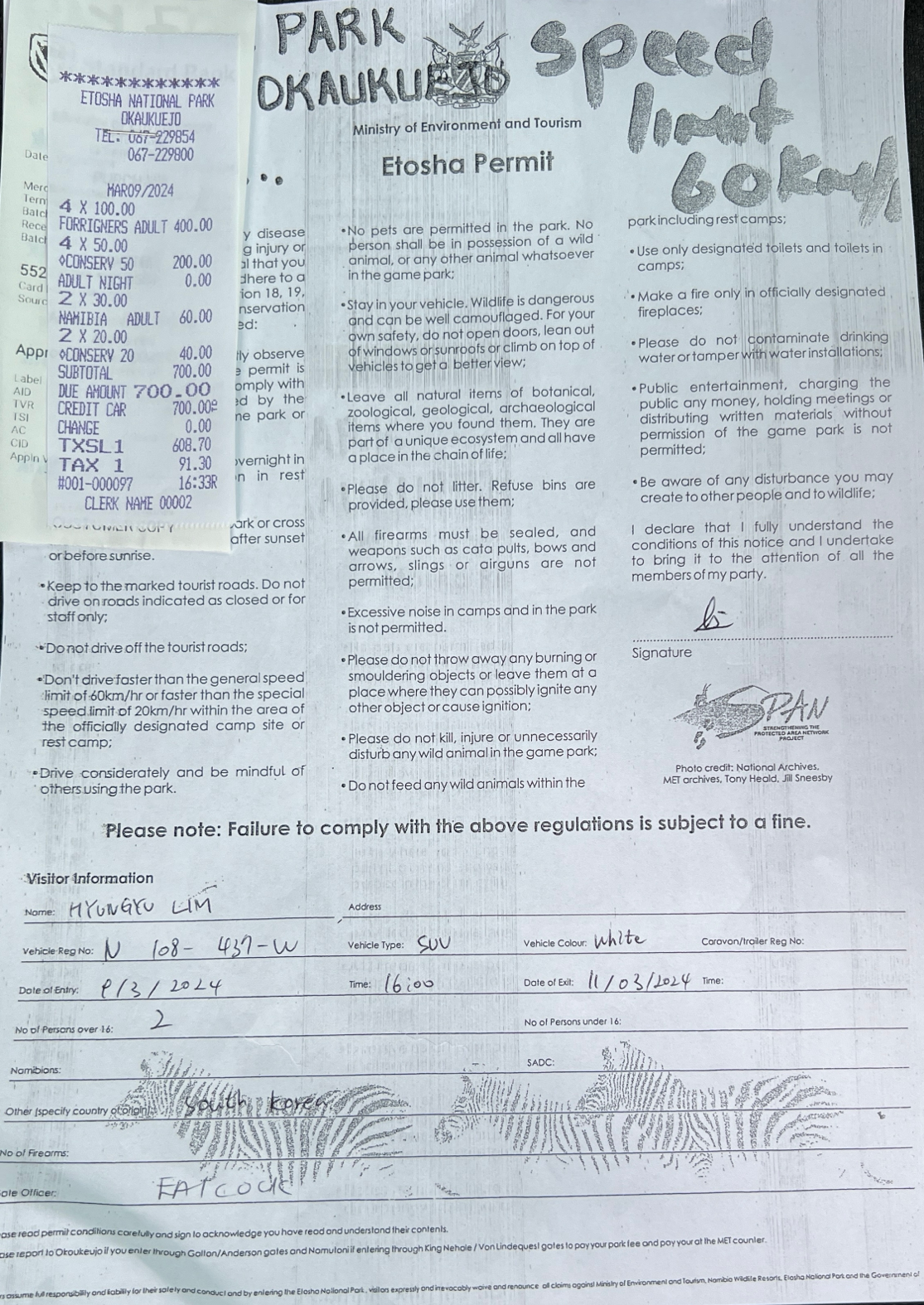 체크인을 하면서 캠핑장과 공원이용에 대한 안내를 받고 공원 이용에 대한 허가를 받을 수 있었다. 공원 밖으로 나갈 때 검사를 하니 꼭 챙겨야 한다. 우리 인원과 차량 정보, 들어오고 나가는 일시를 적는다.