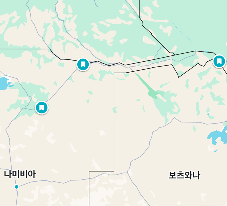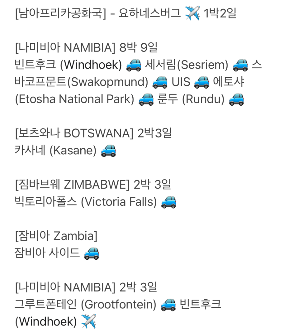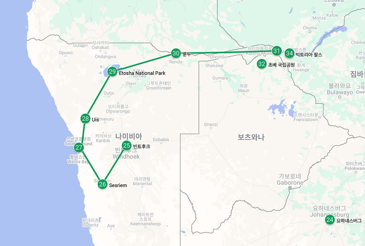 당시 강대국들이 지도를 펼쳐놓고 지형을 무시한 채 선을 그어 만든 국경은 말도 안 되는 이상한 오늘날의 아프리카의 국경이 되었다. 그래서 나미비아와 빅토리아폭포를 묶어서 보기 위해 여러 나라 국경을 넘는 동선이 나올 수밖에 없었다. 우리는 꽃보다 청춘의 동선을 참고했는데 한 가지 다른 점은 렌터카 반납을 위해 빈트후크로 다시 돌아왔다는 것이다.