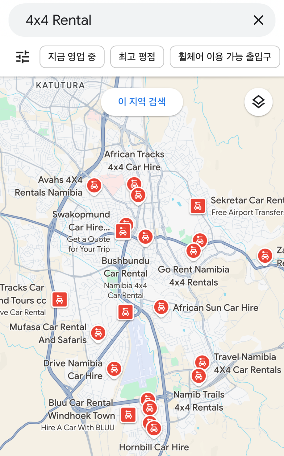 하지만 나미비아는 도시를 벗어나게 되면 대부분 비포장도로여서 펑크 나는 차량이 많이 발생하였고 이분들도 타이어가 펑크 나서 고생을 하셨다고 했다. 그래서 렌터카 업체를 고를 때 이와 같은 안전에 대한 대비가 얼마만큼 되어있는지가 가장 중요했다. 구글맵에서 빈트후크에 있는 4X4 렌터카를 검색했고 평점이 높고 후기도 많은 업체들을 골라서 견적을 받았다.