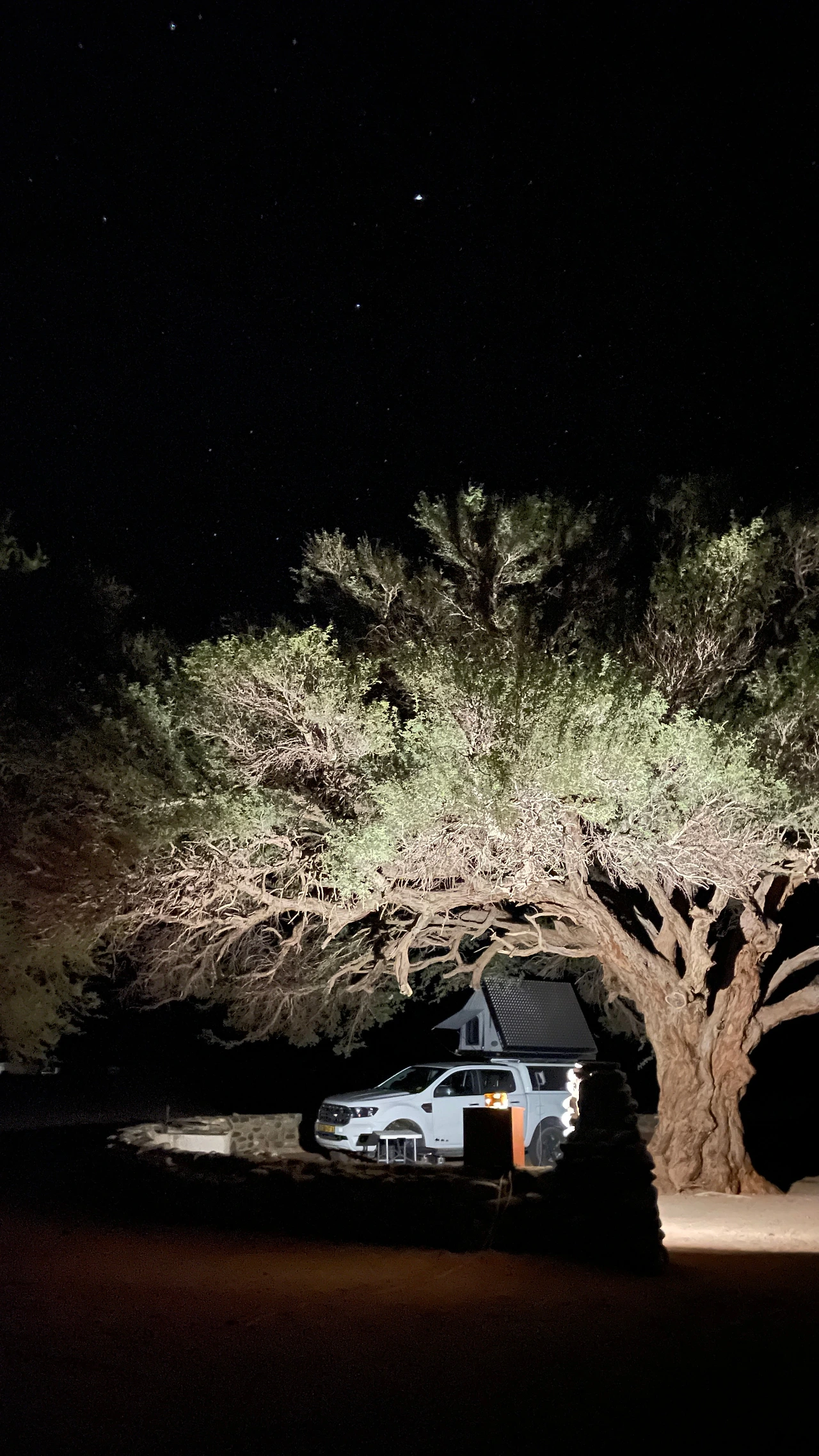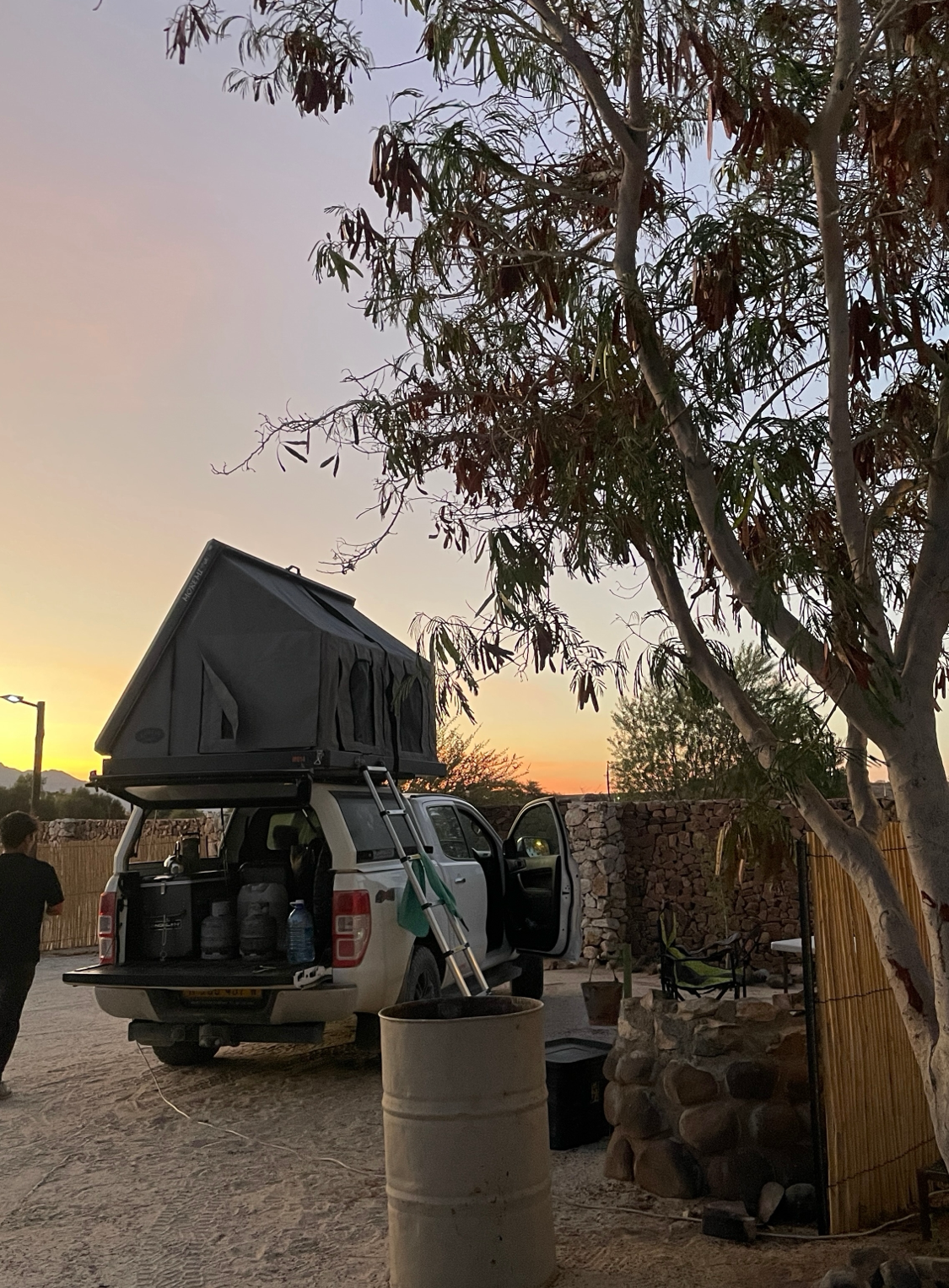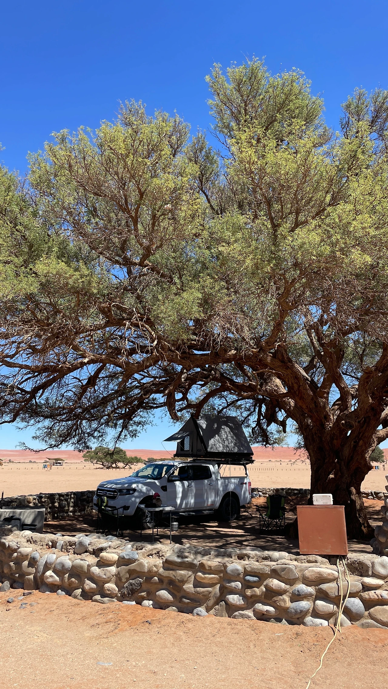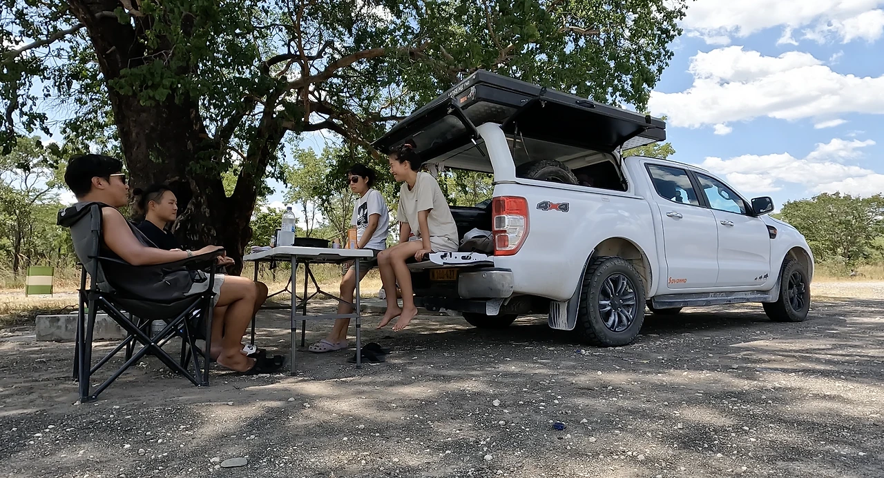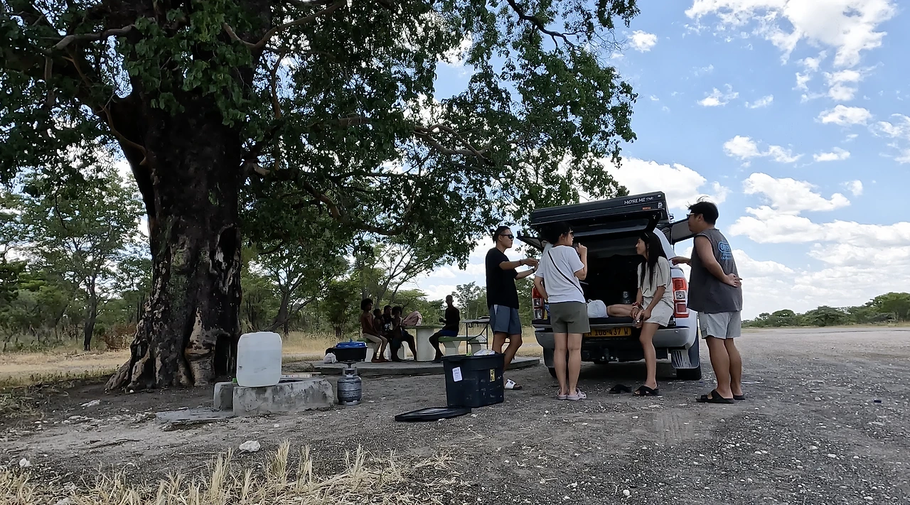 우리가 예약한 사이트는 큰 나무가 있어 그늘이 되어주는 곳이었다. 도착해서 지붕 위 텐트를 펴고 캠핑 준비를 하는데 한국인 부부가 다가왔다. 우리는 위험하다는 생각 때문에 갈 엄두도 못 낸 서아프리카를 여행하고 온부부와 아프리카 사막의 캠핑장에서 우연히 만나 급속도로 친해졌다. 나이도 비슷하고 말이 잘 통해서 이후의 빅토리아 폭포까지의 여정을 함께 하게 되었다.