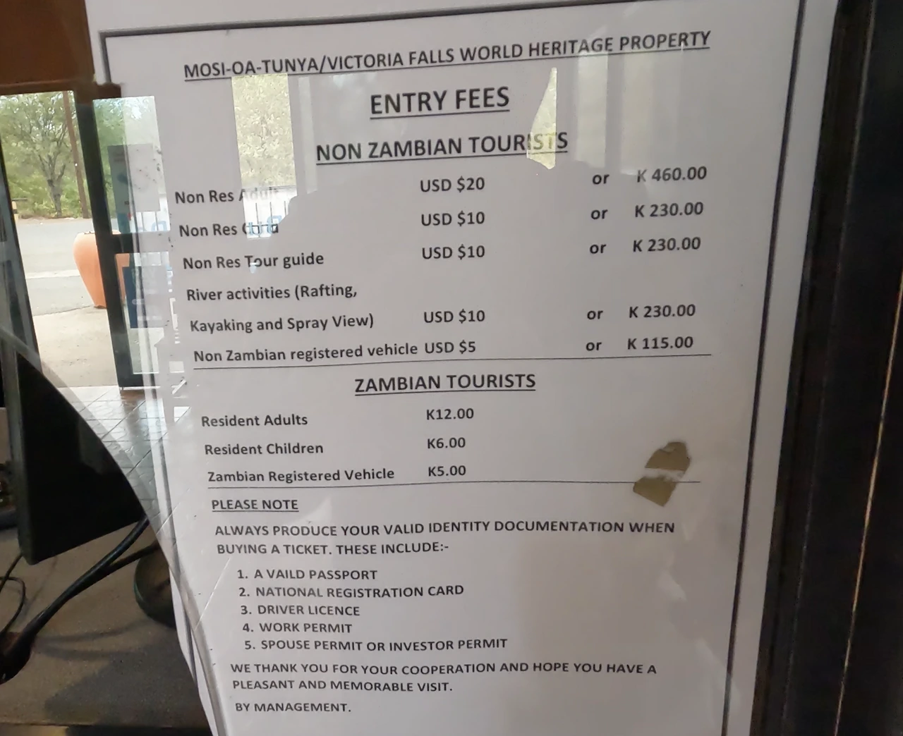 2024년 3월 잠비아사이드의 입장료는 20 USD였다. 빅토리아 폭포의 약 75%가 짐바브웨에 있어서 그런지 입장료도 더 저렴했다. 모든 나라가 마찬가지지만 관현지인들과의 관광지입장료에는 차이가 있었다. 담비아 사이드는 현지인들과 38배 정도의 차이가 났다.