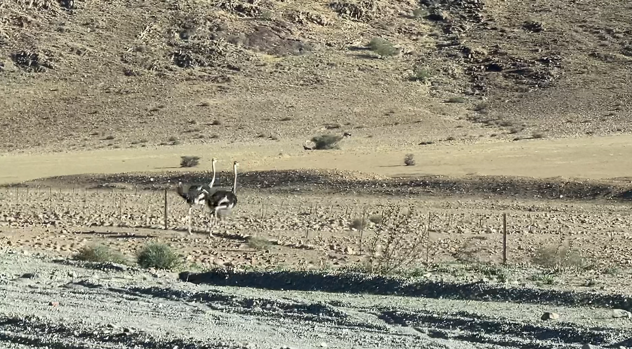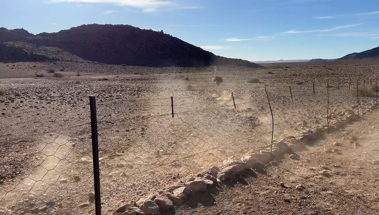 나미비아 스와코프문트에서 에토샤 국립공원으로 향하는 길이다. 저 멀리 울타리를 넘어 도로에 넘어와 있는 타조 두마리가 보였다. 우리차가 점점 다가가자 다시 울타리를 넘어가려고 한다.
