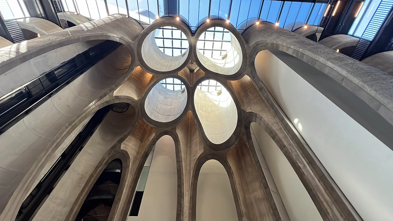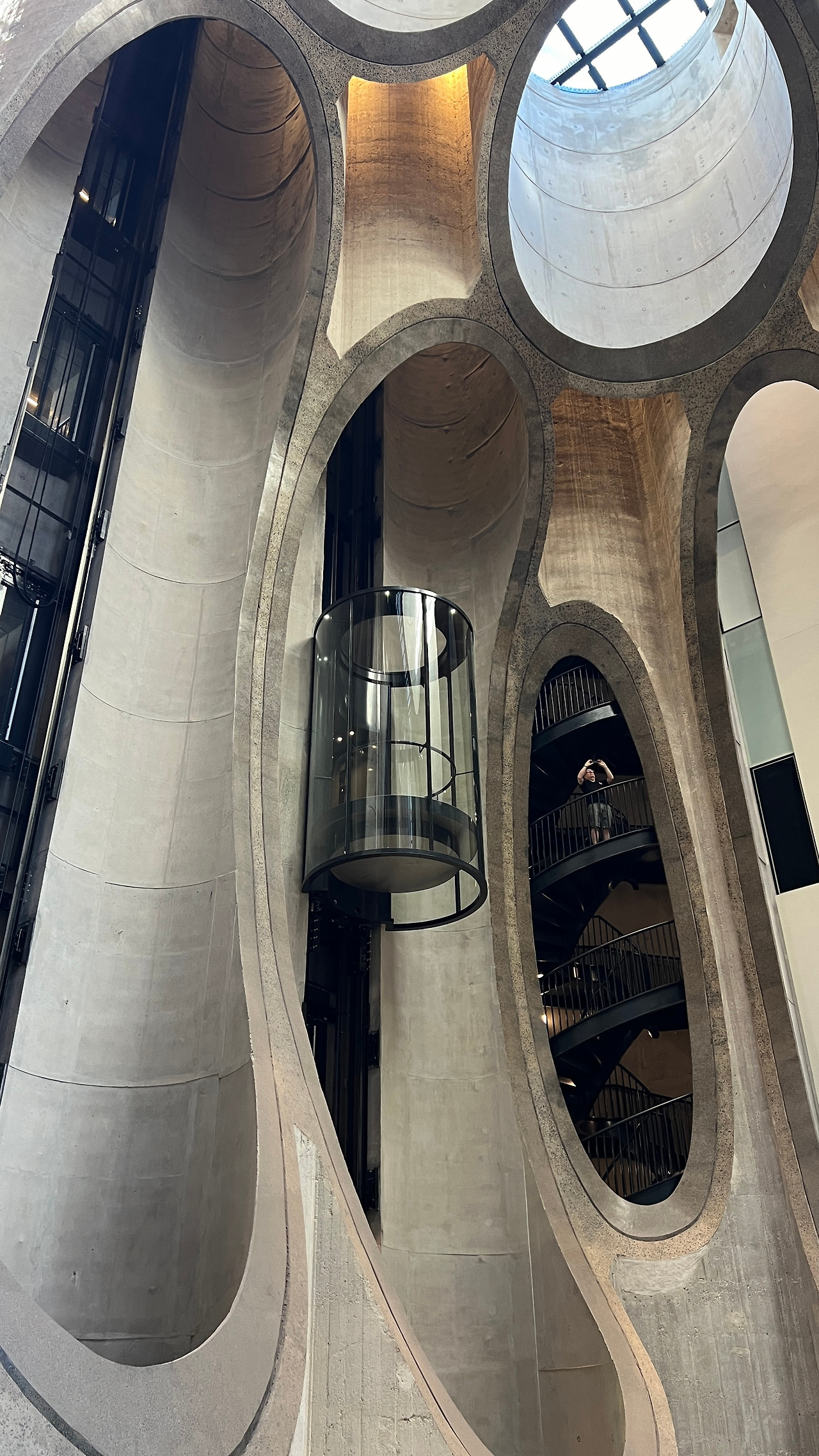 내부로 입장하면 30m가 넘는 원기둥 모양의 콘크리트 구조물을 깨끗하게 잘라낸 모습을 볼 수 있다. 기존의 구조물과 공간을 최대한 이해하고 보존하려는 노력이 새로 신축하는 건물에서는 찾아볼수 없는 리모델링만의 매력을 느끼게 해주는것 같다.