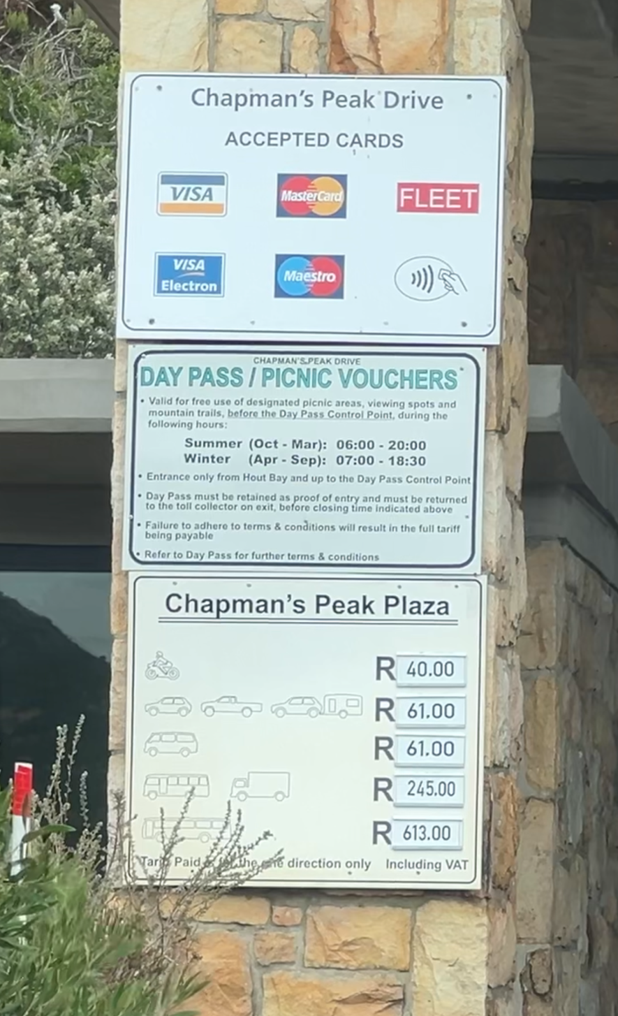 채프먼스 피크는 세계적으로 유명한 해안도로이다. 총길이는 9.5km이고 도로의 시작과 끝 지점에 톨게이트가 있어서 비용을 지불한다. 승용차는 편도 61랜드(한화 약 4,790원)로 거리에 비해 만만치 않은 통행료였다.