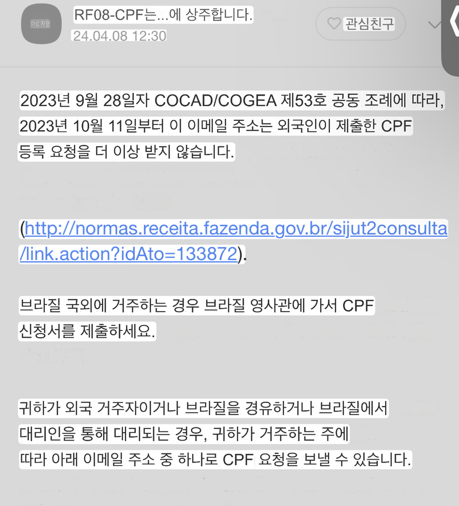 브라질에 도착한 후에 필요성을 느껴 뒤늦게 신청해봤는데 더 이상 온라인으로는 신청을 받지 않는다는 내용의 답장을 받았다.
