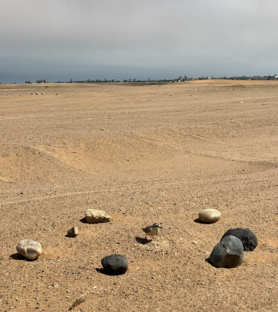 하늘을 날고 있어야 할 새가 사람이 가까이 다가가도 도망치지 않고 “자리”를 지키고 있다. 사막의 모래 속에 알을 낳고 그 알을 지키고 있는 중이다. 모래뿐인 사막에 그 새와 알들을 지켜주기 위해 투어 가이드들이 놓아둔 돌들이 “자리”하고 있는 모습도 인상적이었다.