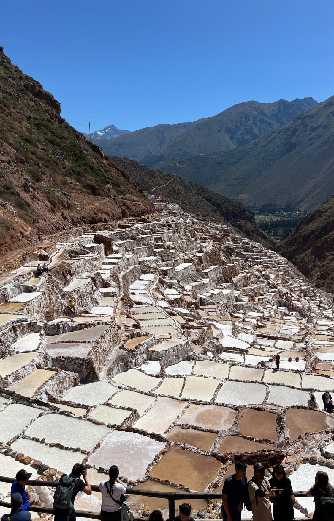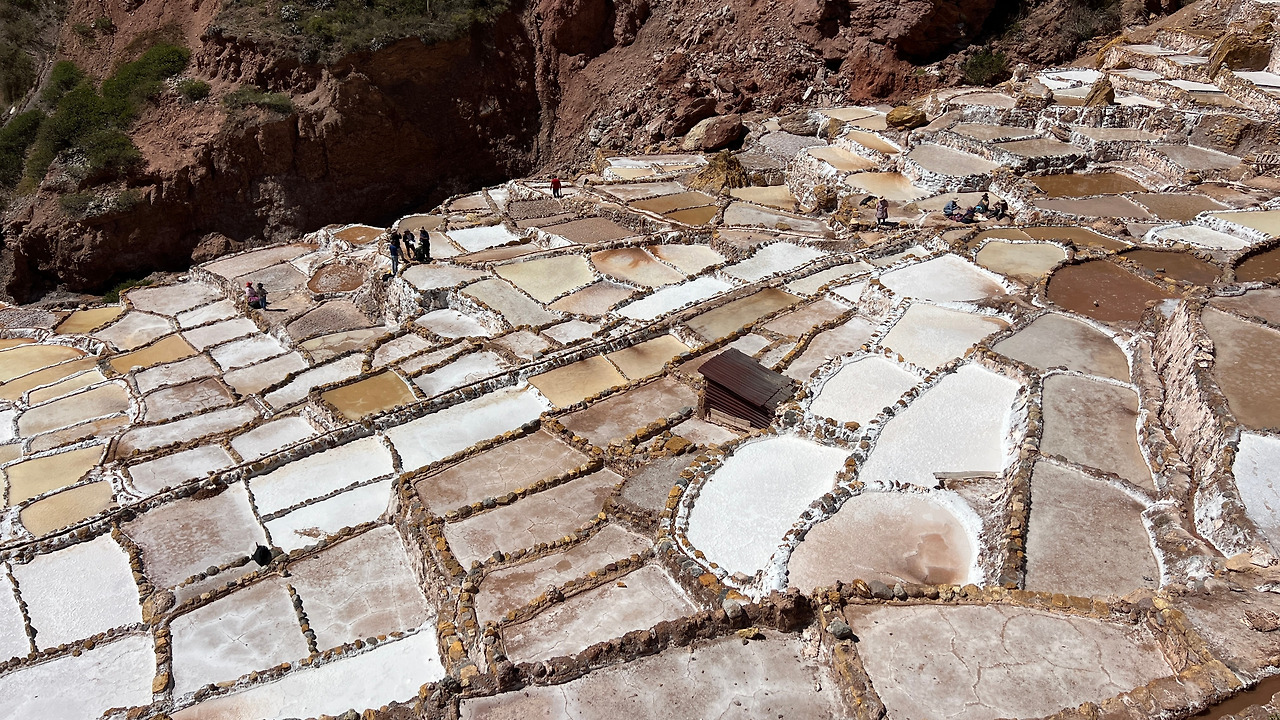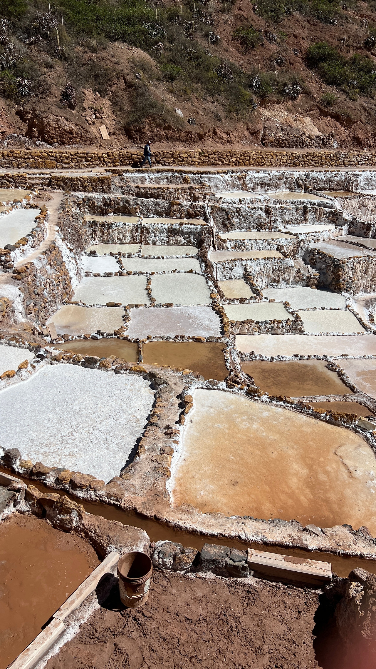 3,000개가 넘는 작은 염전 웅덩이가 계단처럼 펼쳐진 광경이 경이롭다. 해발 약 3,200미터에 염전이라니 상식을 벗어나는 광경에 원리가 궁금해서 찾아봤는데 이 지역 땅속 깊은 곳에는 수백만 년 전 바다가 있던 시절의 염분이 남아 있다고 한다. 땅속에 스며든 이 지하 암염층에서 지금도 소금물이 솟아나는 샘이 있는데 수로를 이용해서 각 구역에 물을 저장해 자연 증발 시켜 소금을 얻는 방식으로 운영되고 있다고 한다.
