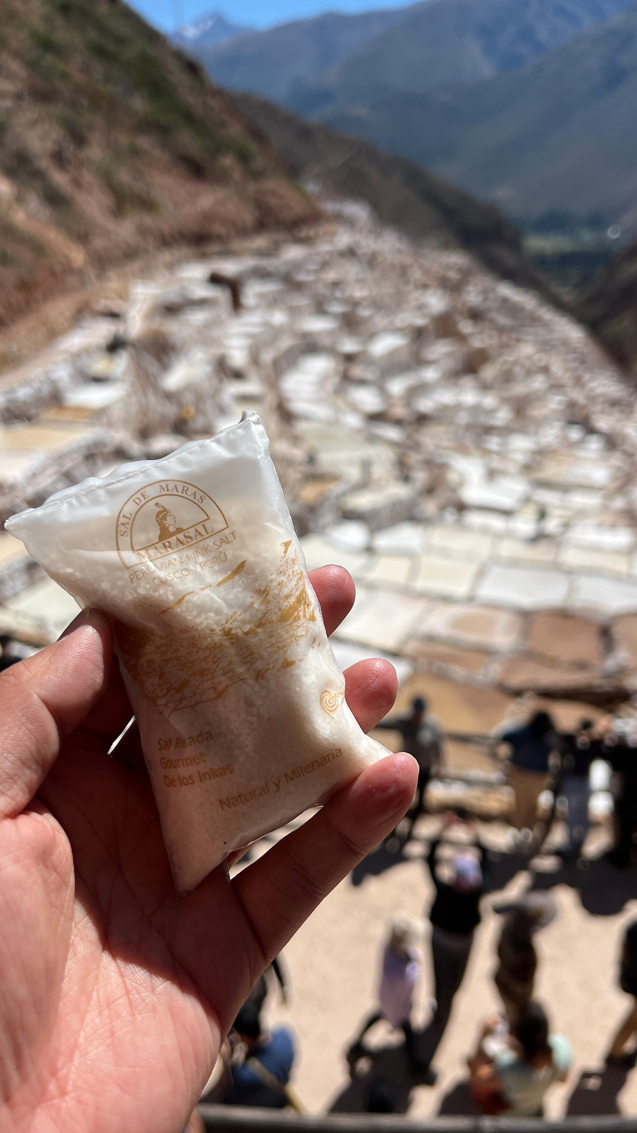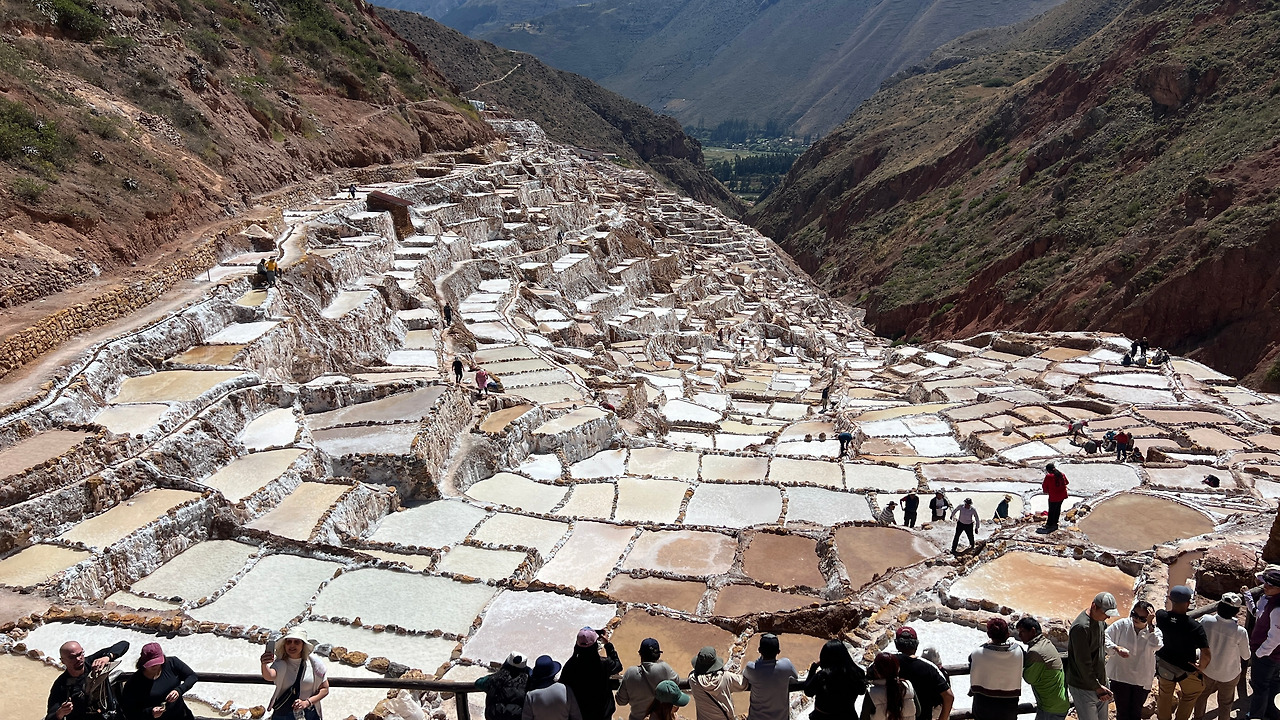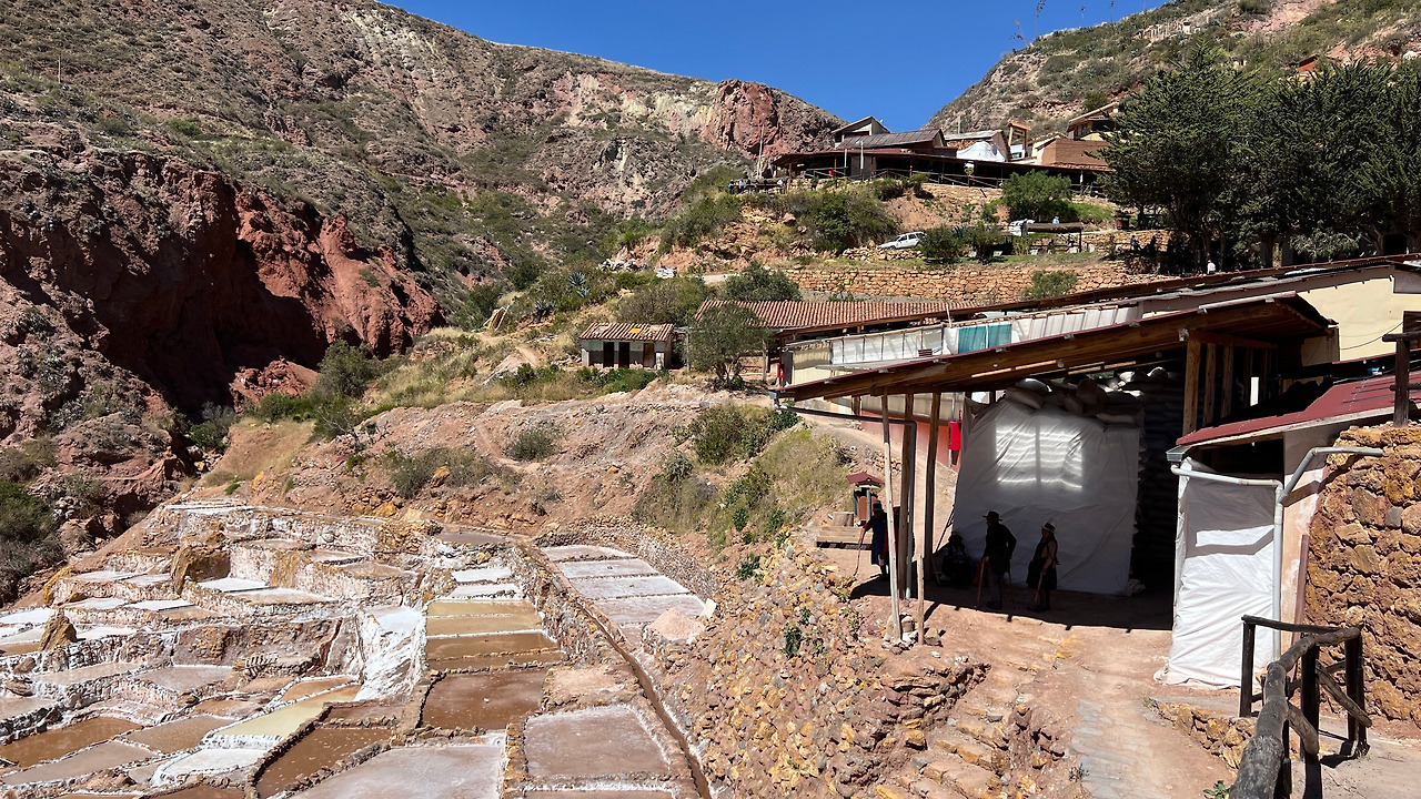 3,000개가 넘는 작은 염전 웅덩이가 계단처럼 펼쳐진 광경이 경이롭다. 해발 약 3,200미터에 염전이라니 상식을 벗어나는 광경에 원리가 궁금해서 찾아봤는데 이 지역 땅속 깊은 곳에는 수백만 년 전 바다가 있던 시절의 염분이 남아 있다고 한다. 땅속에 스며든 이 지하 암염층에서 지금도 소금물이 솟아나는 샘이 있는데 수로를 이용해서 각 구역에 물을 저장해 자연 증발 시켜 소금을 얻는 방식으로 운영되고 있다고 한다.