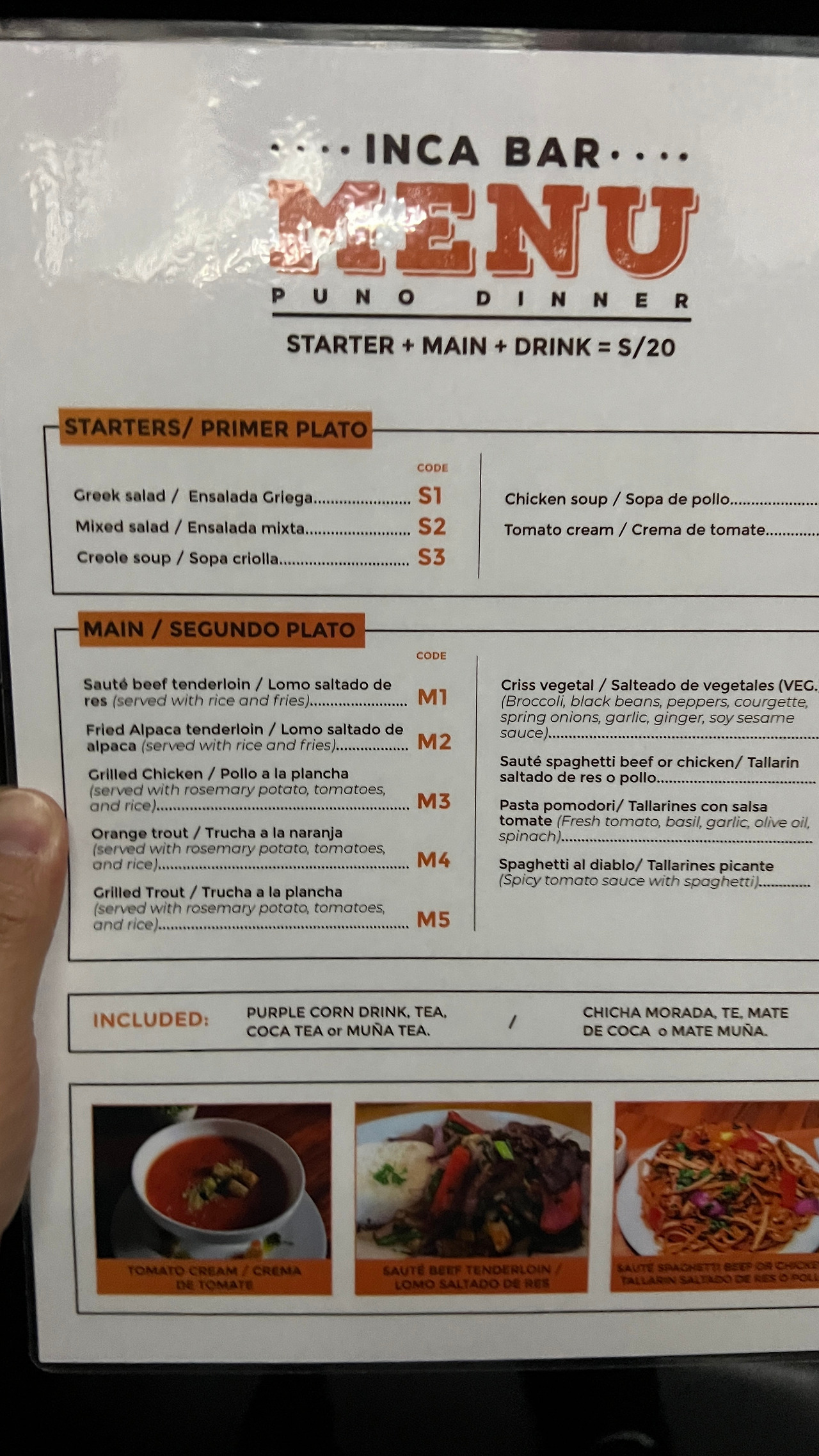 무사히 국경을 통과해서 푸노라는 도시에 저녁 8시쯤 도착했다. 식사를 원하는 우리 부부와 영국인 한 명은 버스기사와 함께 푸노 시내로 향했다. 이때 먹은 음식은 기억에 많이 남지 않는데 음료가 너무 맛있었다. 페루에서만 마실 수 있다는 잉카콜라는 풍선껌 맛 비슷한 달디단 맛이어서 실망했는데 현지인이 추천해 준 치차 모라다(Chicha Morada)는 우리 입맛을 사로잡았다.