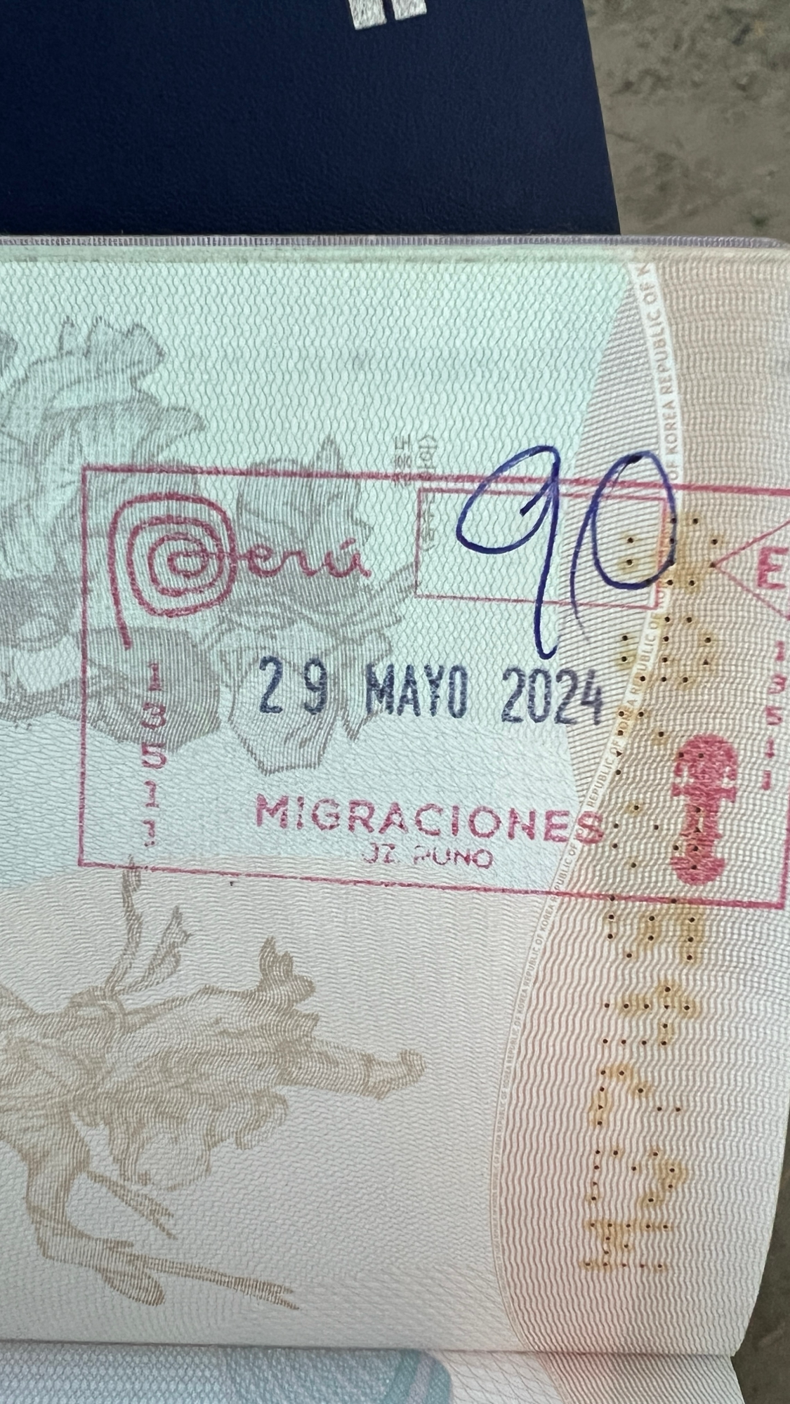 국경을 넘는 일은 항상 긴장된다. 새로운 나라를 여행한다는 설렘과 여행 중 유일하게 사진촬영도 불가능한 무서운 분위기의 출입국사무소를 무사히 통과할 수 있을까 하는 걱정이 매번 새롭다. 페루 입국 시 입국도장을 찍어주지 않아서 출국할 때 공항에서 고생했다는 글을 봐서 걱정했는데 아무 말하지 않았는데도 입국도장을 받을 수 있었다. 세계여행 중 입국도장을 찍어주지 않는 나라는 아르헨티나가 유일했다.