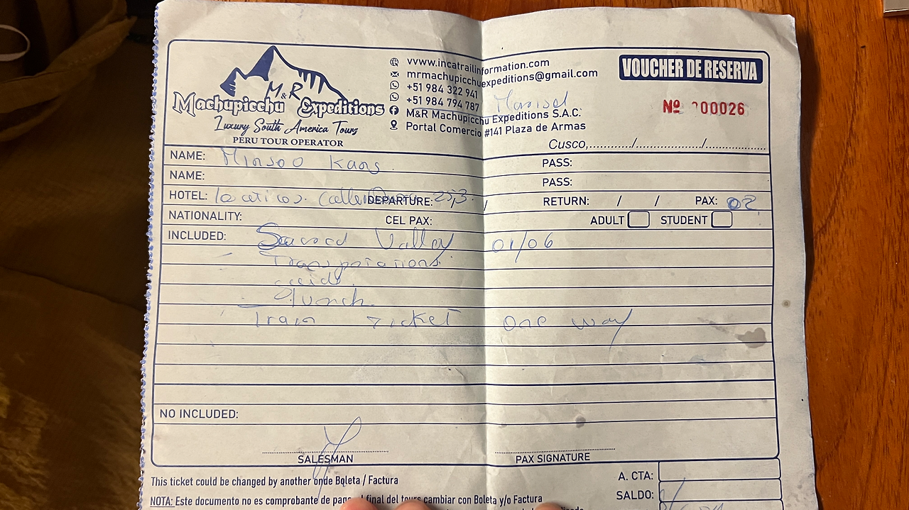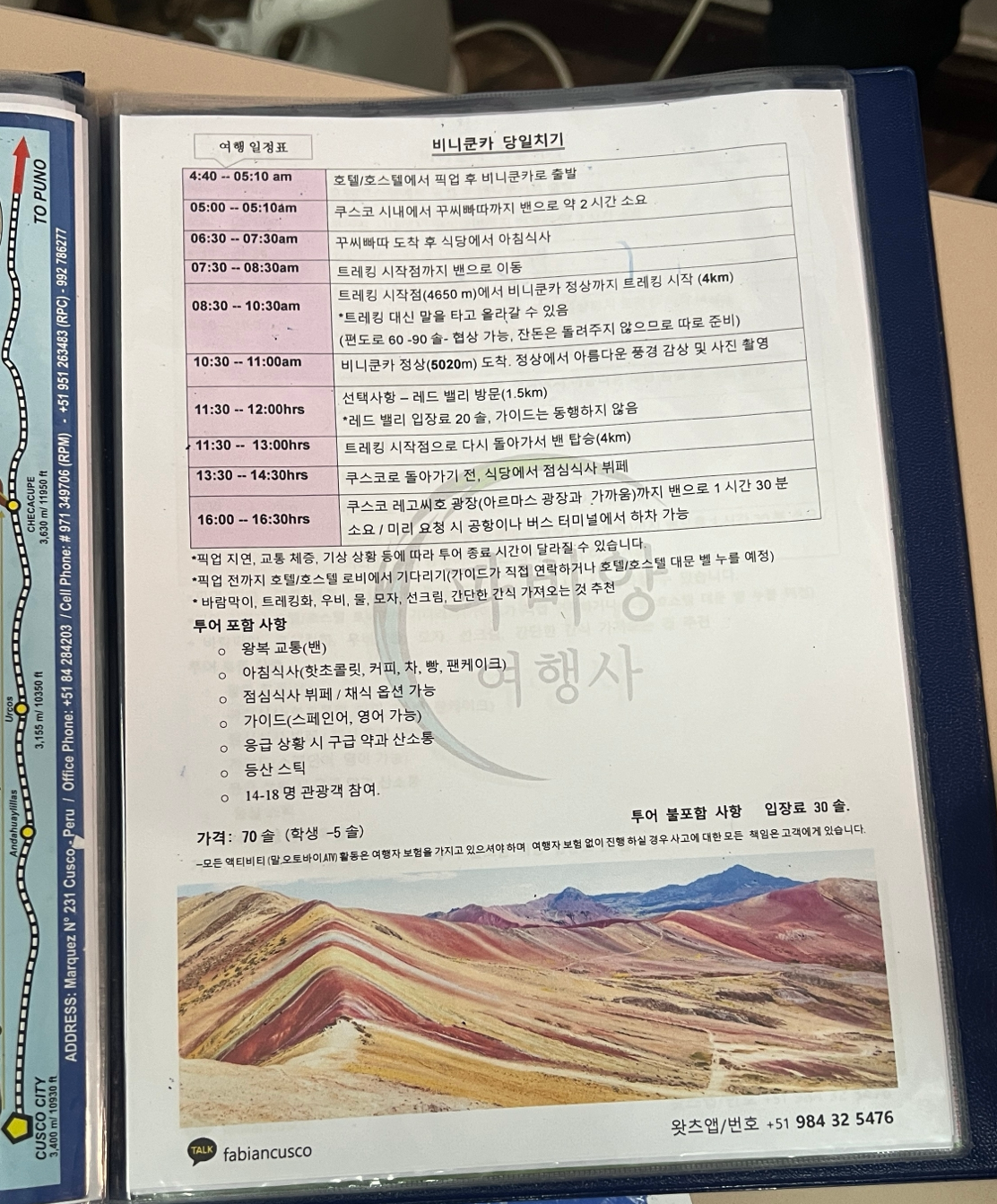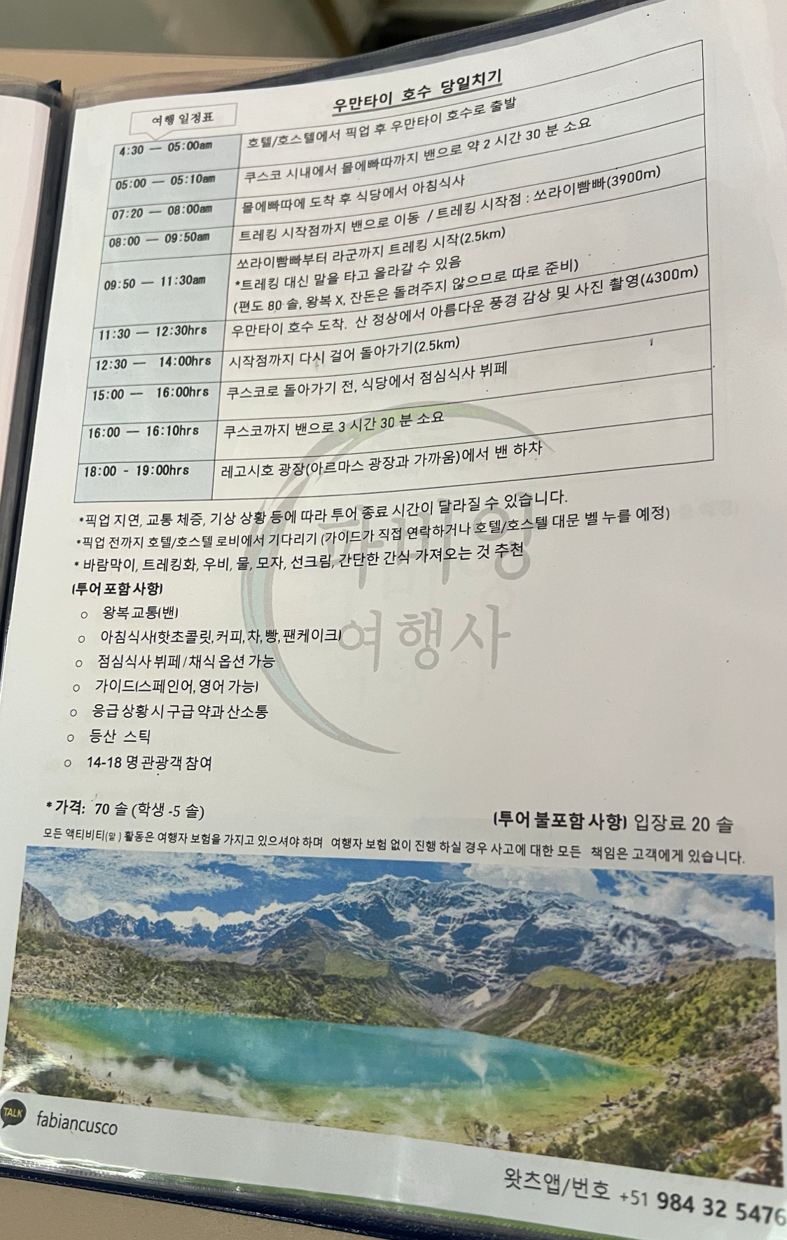 사장님 소개로 스페인어 능력자 중학생아들과 함께 한국인들에게 유명한 여행사들을 비교 견적해 보고 성스러운 계곡투어와 마추픽추 편도 기차, 그리고 비니쿤카투어를 예약했다. 마추픽추에서 다시 쿠스코로 돌아오는 기차는 마추픽추티켓을 미리 예약하지 못한 관계로 상황을 보고 직접 예매하기로 했다.