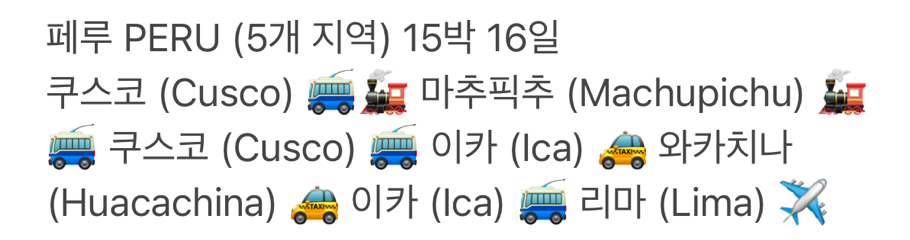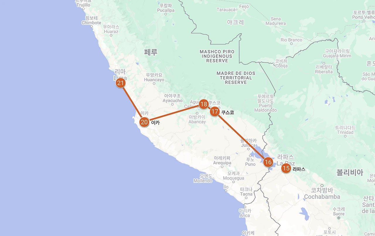 우리나라 국민은 최대 90일까지 무비자로 페루에 체류할 수 있다. 우리는 그중 15박 16일 동안 페루에 머물면서 여행했다. 볼리비아 라파스에서 볼리비아홉이라는 버스를 타고 코파카바나를 경유하여 쿠스코에 도착했다.