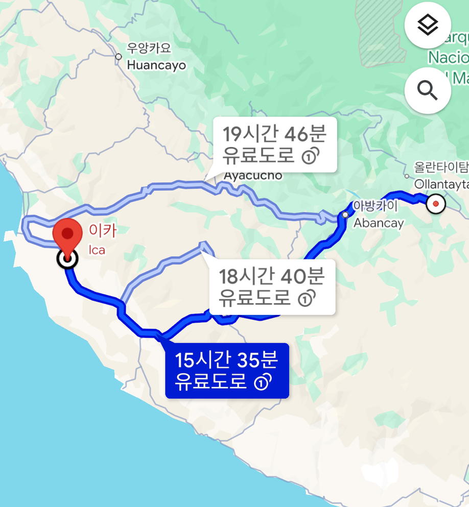 쿠스코에서 버스를 타고 18시간을 달려 와카치나로 향했다. 남미여행하면서 버스는 정말 원 없이 타보았다. 그중에서도 이번 코스가 육체적으로 가장 힘이 들었다. 나스카라는 도시를 경유하는 15시간 35분이 걸리는 도로를 이용했는데 확대해서 보면 하단의 우측 사진과 같은 길이다. 한쪽은 낭떠러지에 비포장이라서 여행 후 처음으로 멀미를 심하게 했다. 실제로는 18시간 이상이 걸렸다.