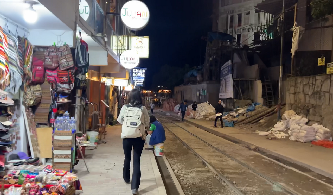 저녁 6시쯤에 아구아스 칼리엔떼스에 도착해서 미리 예약한 숙소에 체크인을 하고 저녁을 먹으러 나왔다. 차가 다닐 수 없고 기찻길이 마을을 관통하고 있었다. 마추픽추를 왕복하는 버스들만 다닐 수 있는 도로가 따로 있었다.