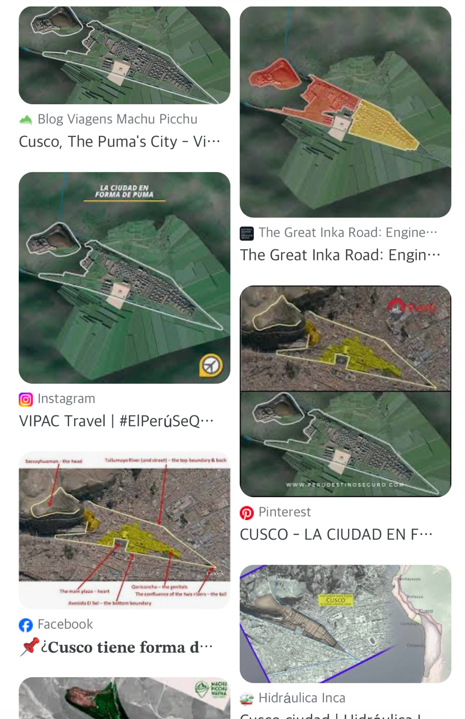 고대 잉카인들이 하늘은 콘도르 땅은 퓨마, 땅속은 뱀이 지배한다고 믿었기 때문에 쿠스코의 형태가 퓨마 모양이 되었다는 말이 있는데 사실 믿기 힘들었다. 눈으로 가늠할 수 없을 정도로 넓은 도시를 오늘날 드론이나 비행기처럼 하늘 위에서 파악할 수 없었을 텐데 특정 형태로 만들기에는 쉽지 않아 보인다. 그럼에도 위성사진을 보면 어느 정도 수긍이 가는 형태이다.