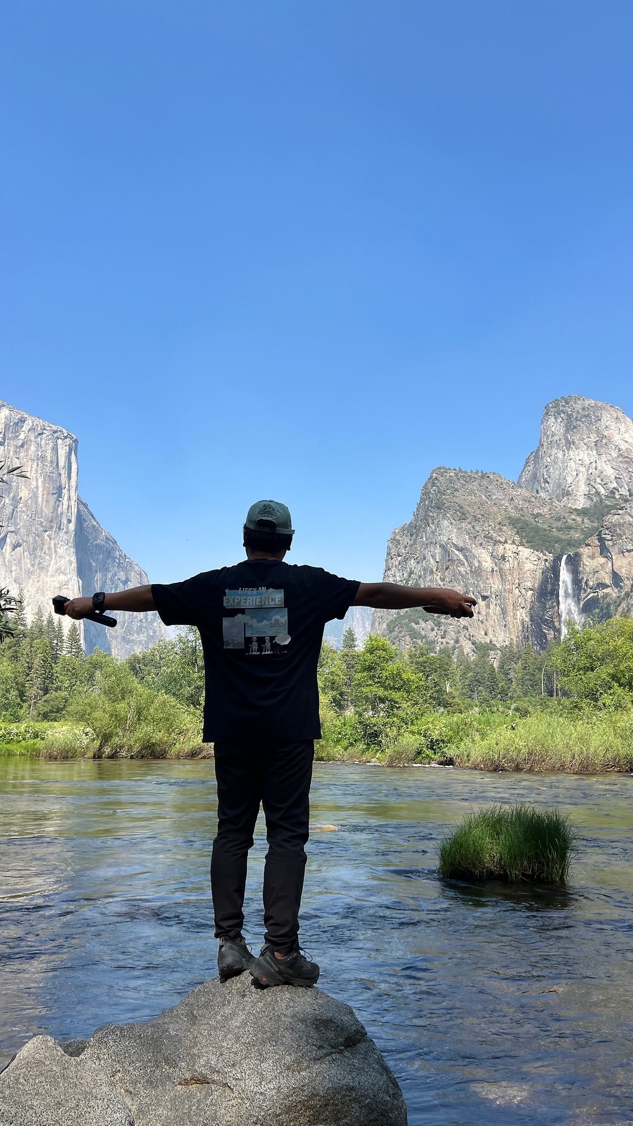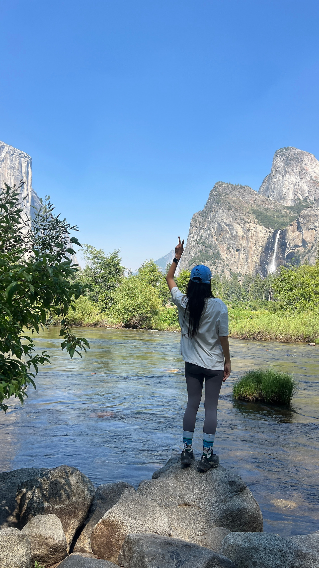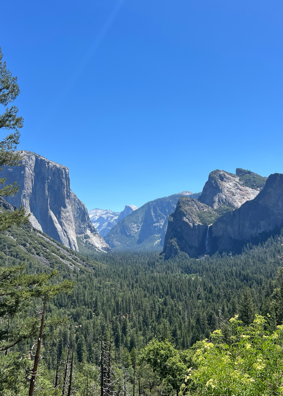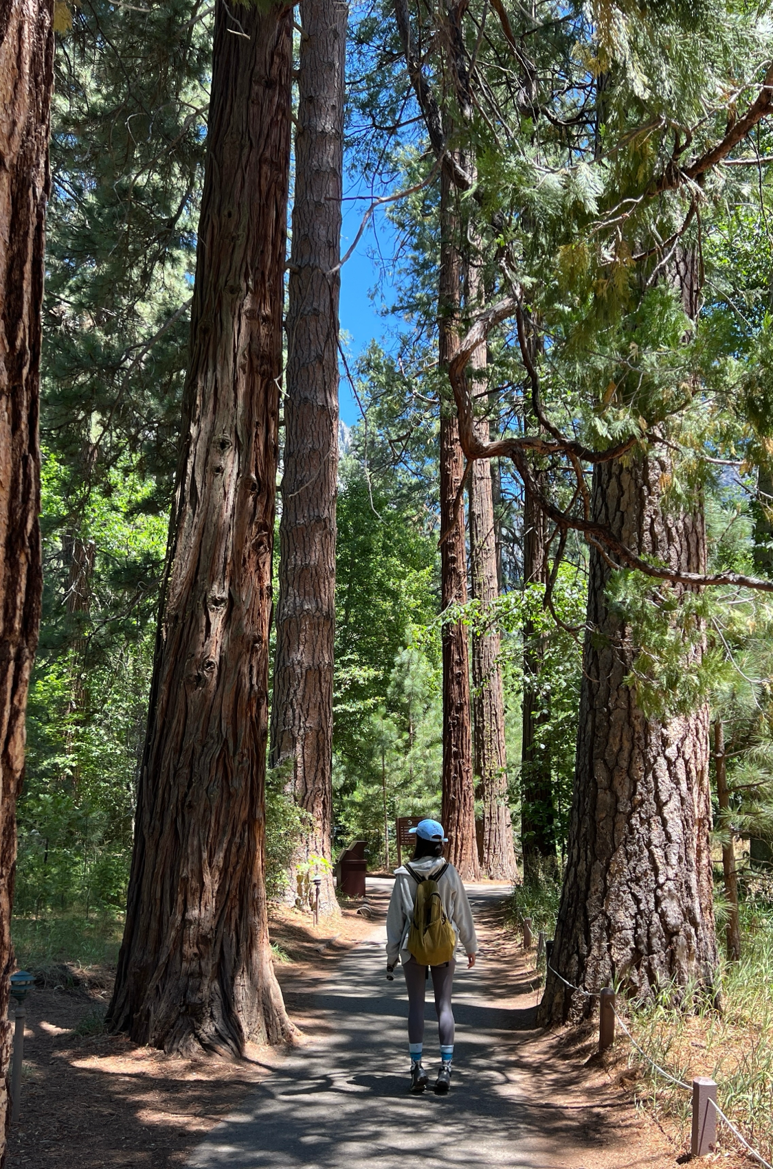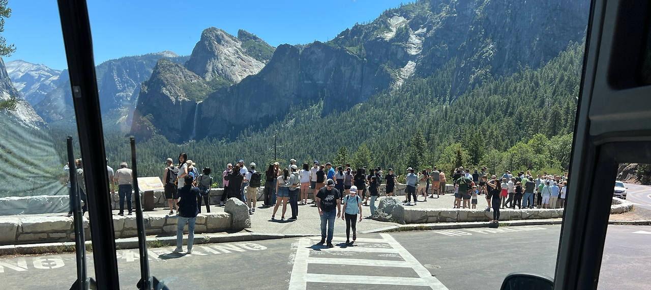 버스는 약 4시간 반을 달려 요세미티 밸리에 도착했다. 입구에서 처음 마주한 풍경은 엄청 키가 큰 나무들 사이로 언뜻 보이는 수직 절벽이었다. 하늘을 찌를 듯 서 있는 나무들과 사진으로만 보던 그 거대한 바위산이 실제 눈앞에 나타났다는 사실에 말문이 막혔다. 산악인들의 성지라고 하는데, 저길 어떻게 올라가나 싶었다.