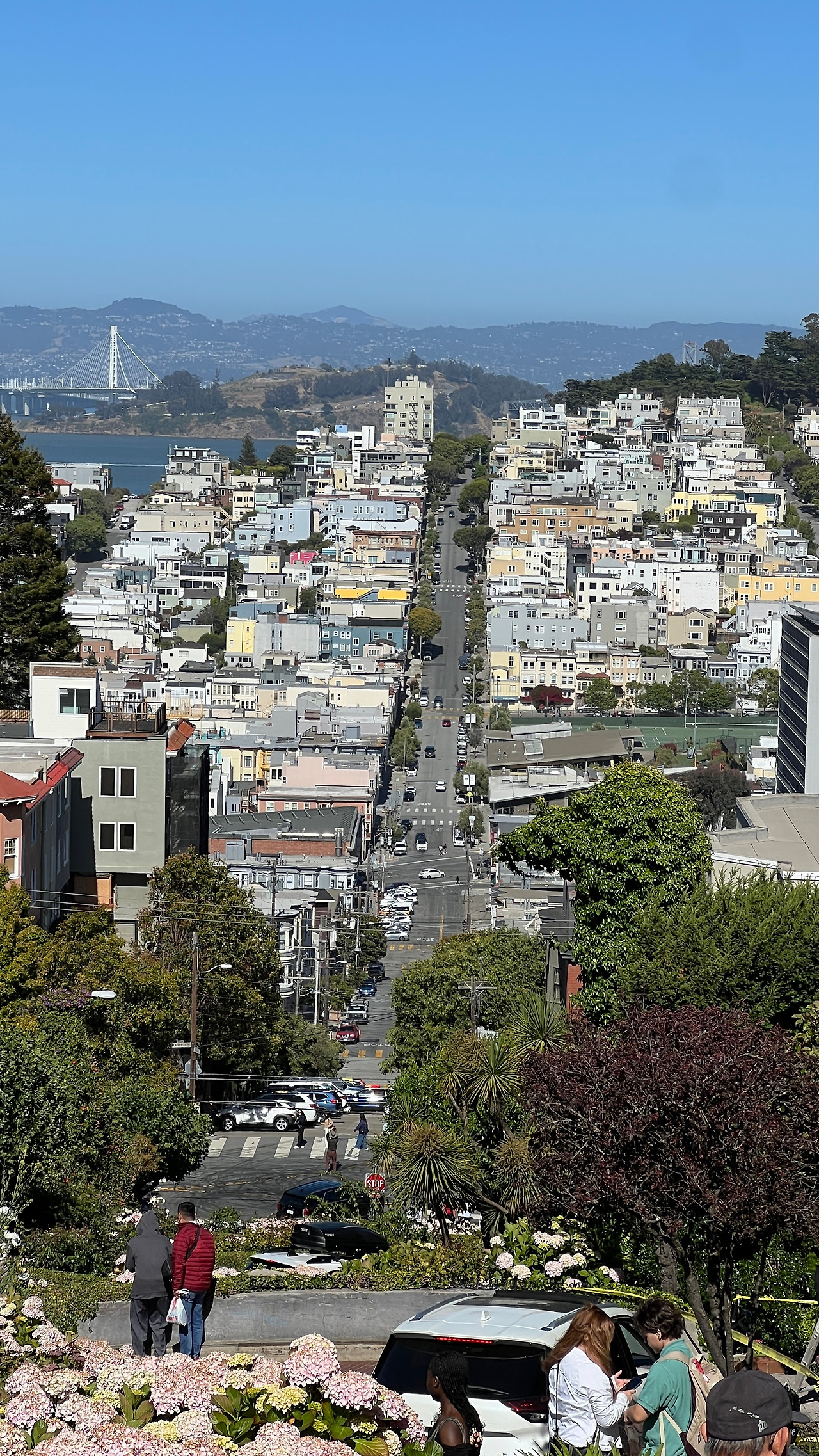 케이블카를 타고 샌프란시스코에서 꼭 가봐야 할 명소 중 하나인 롬바드 스트리트 (Lombard Street)에 도착했다. 총 8개의 헤어핀 커브가 있는 짧은 내리막 도로인데 광고나 영화에 많이 나왔다고 한다. 우리가 갔던 6월 말에는 수국이 잔뜩 피어있어서 더 눈이 즐거웠다.