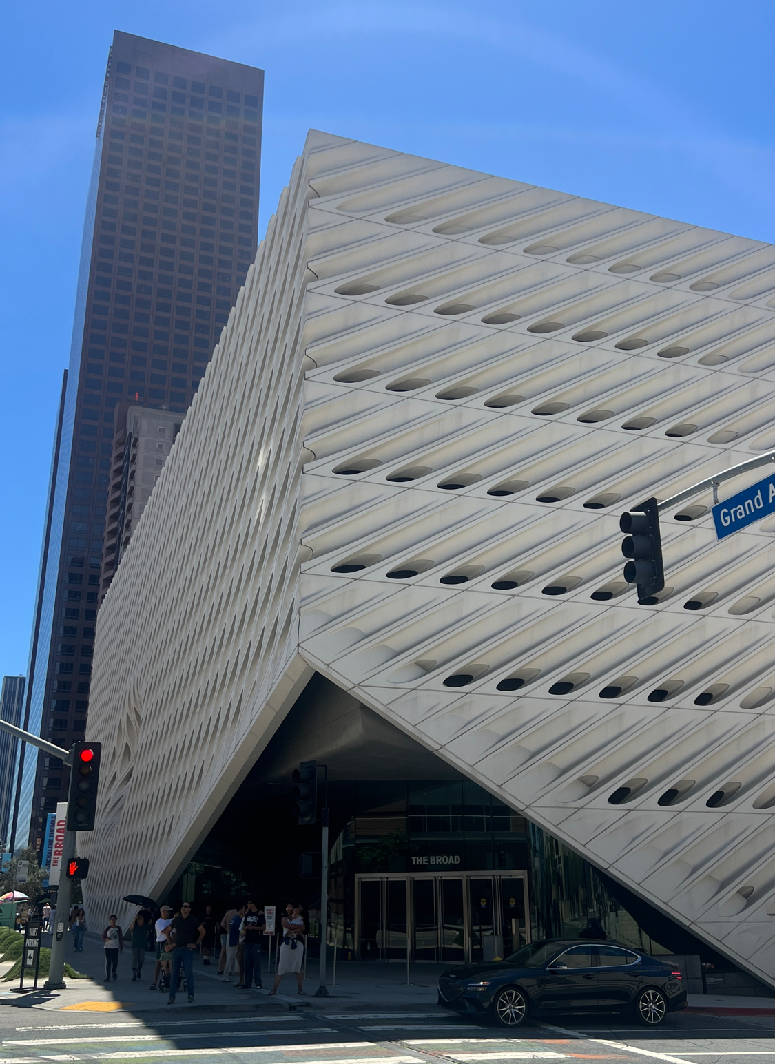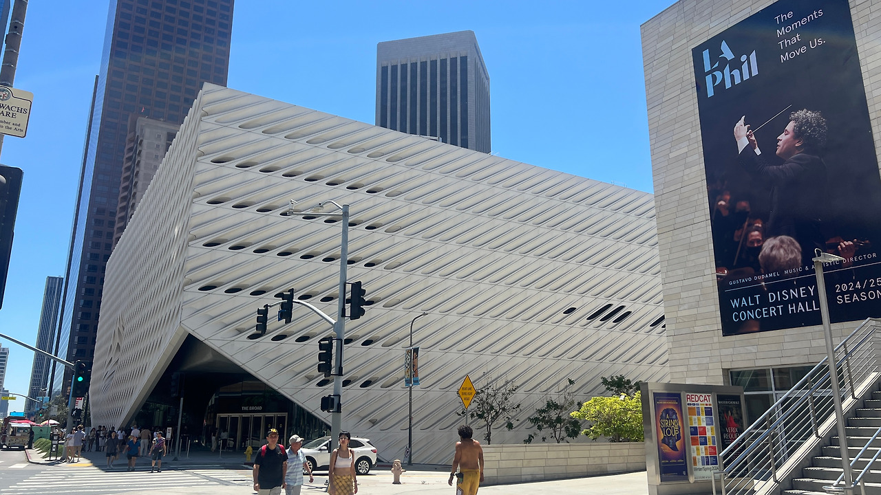 더 브로드 미술관은 월트 디즈니 홀 바로 맞은편에 위치한 현대미술 전문 미술관이다. 뉴욕의 명물 하이라인 파크를 설계한 건축가 딜러 스코피디오 렌프로 (Diller Scofidio + Renfro)가 설계했다. 벌집모양의 하얀색 외피가 눈이 띄는 건물이다.