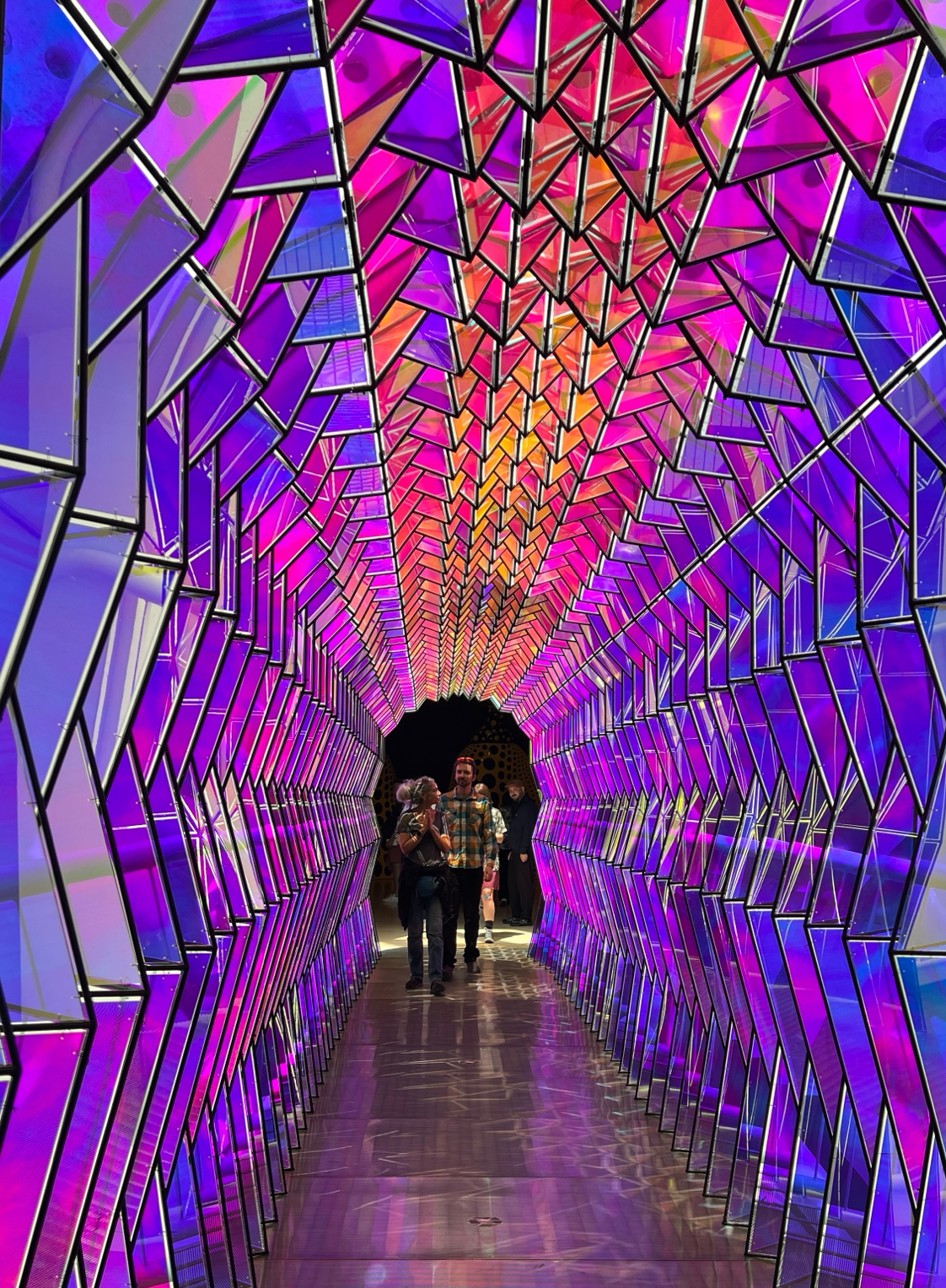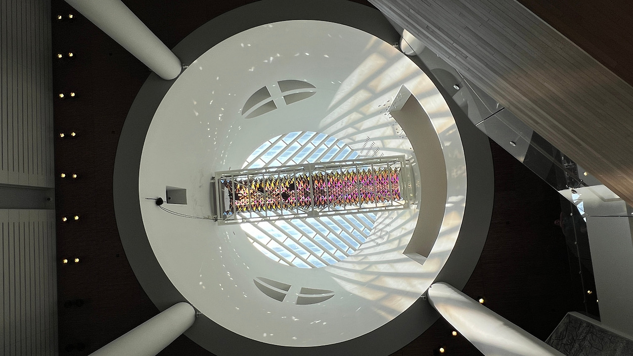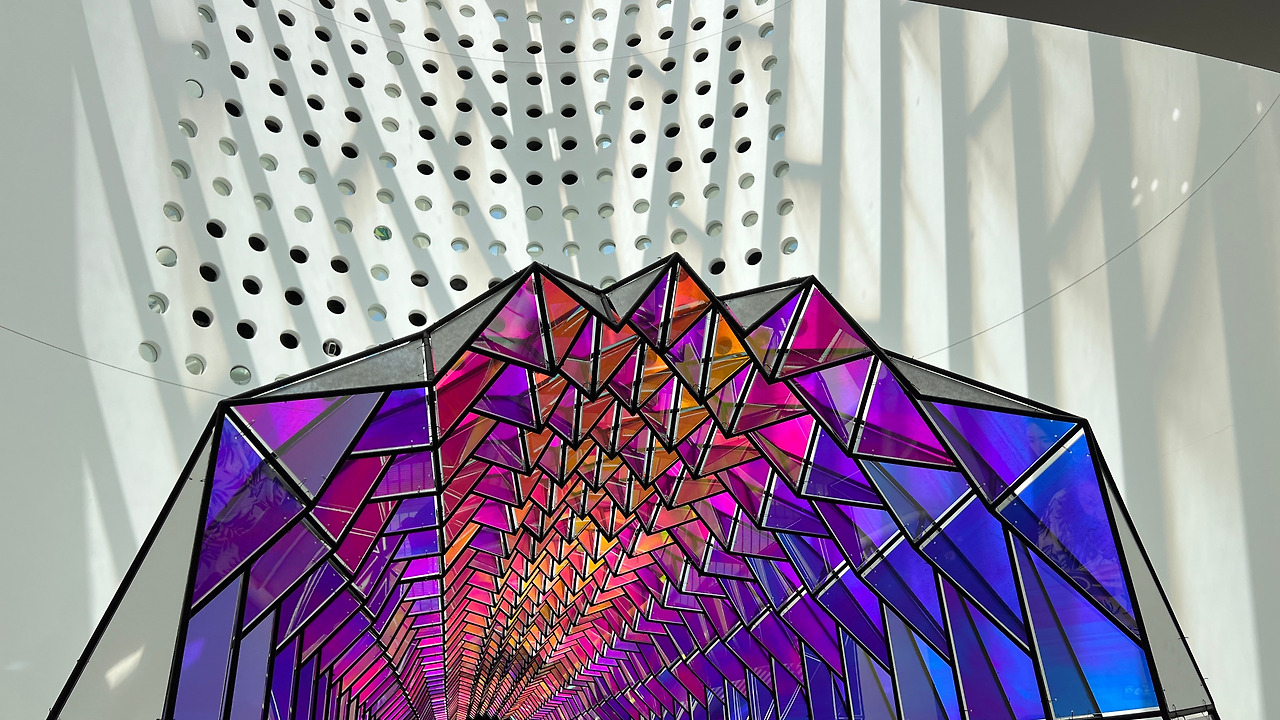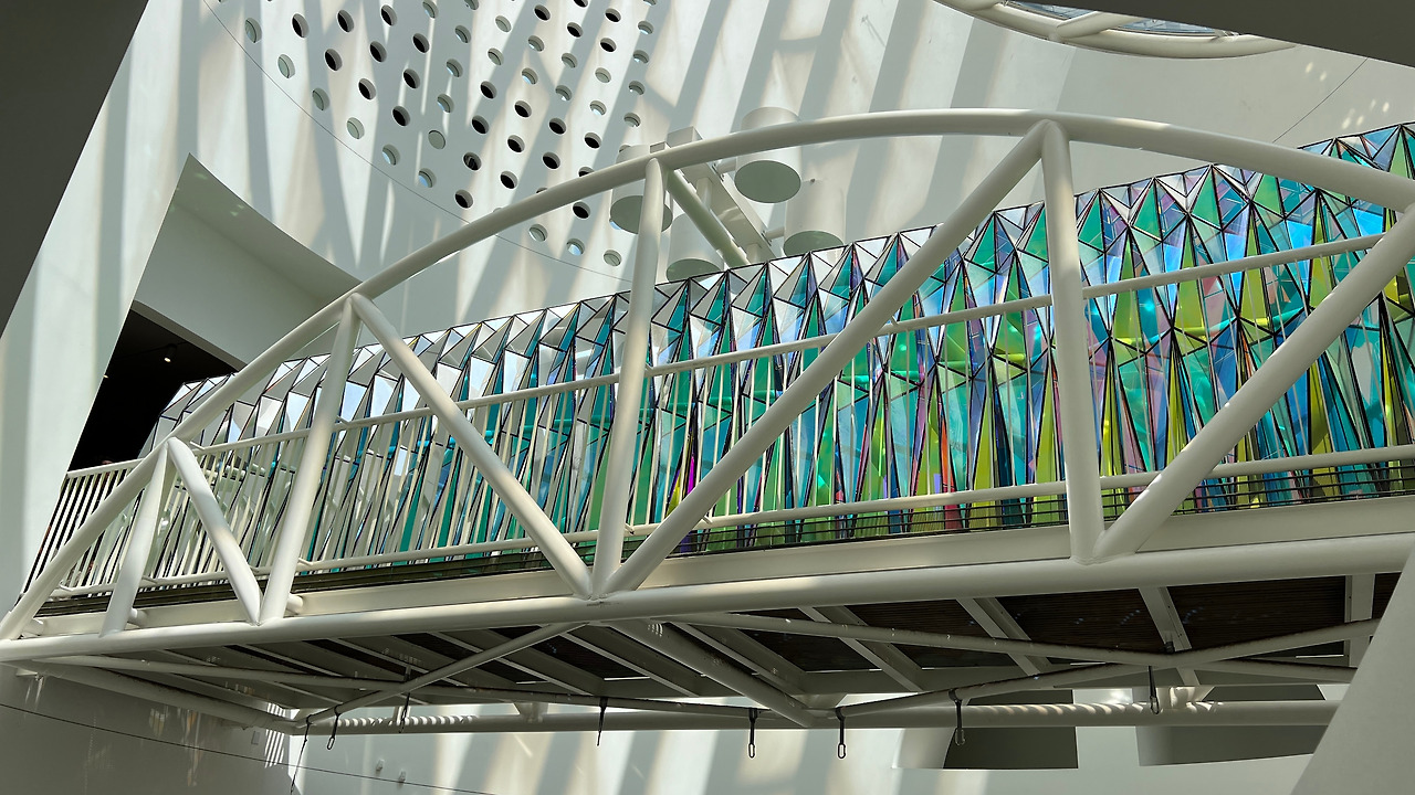 밑에서 천장을 바라봤을 때 보이던 다리에 왔다. 5층에 위치한 오큘러스 브리지는 One‑way Colour Tunnel이라는 작품으로 시각과 감각을 깨우는 설치작품이라고 한다. 아치형 터널 내부, 삼각형의 컬러 글라스·아크릴 패널을 빽빽이 배치되어 있었다. 보는 각도에 따라 색상이 달라져 신비로운 느낌이었다.