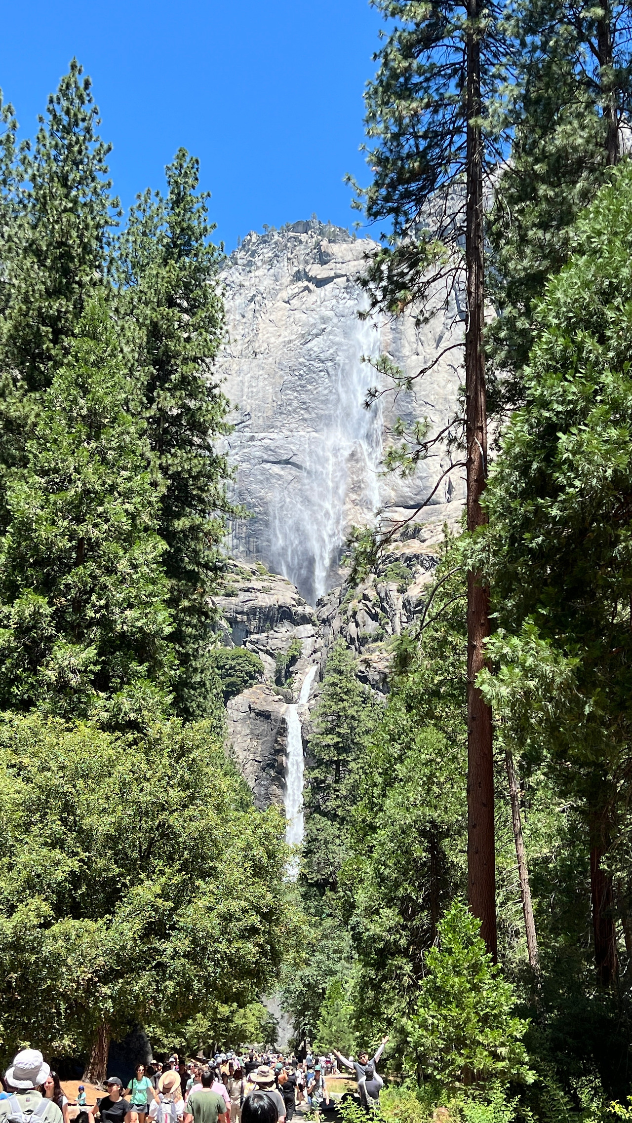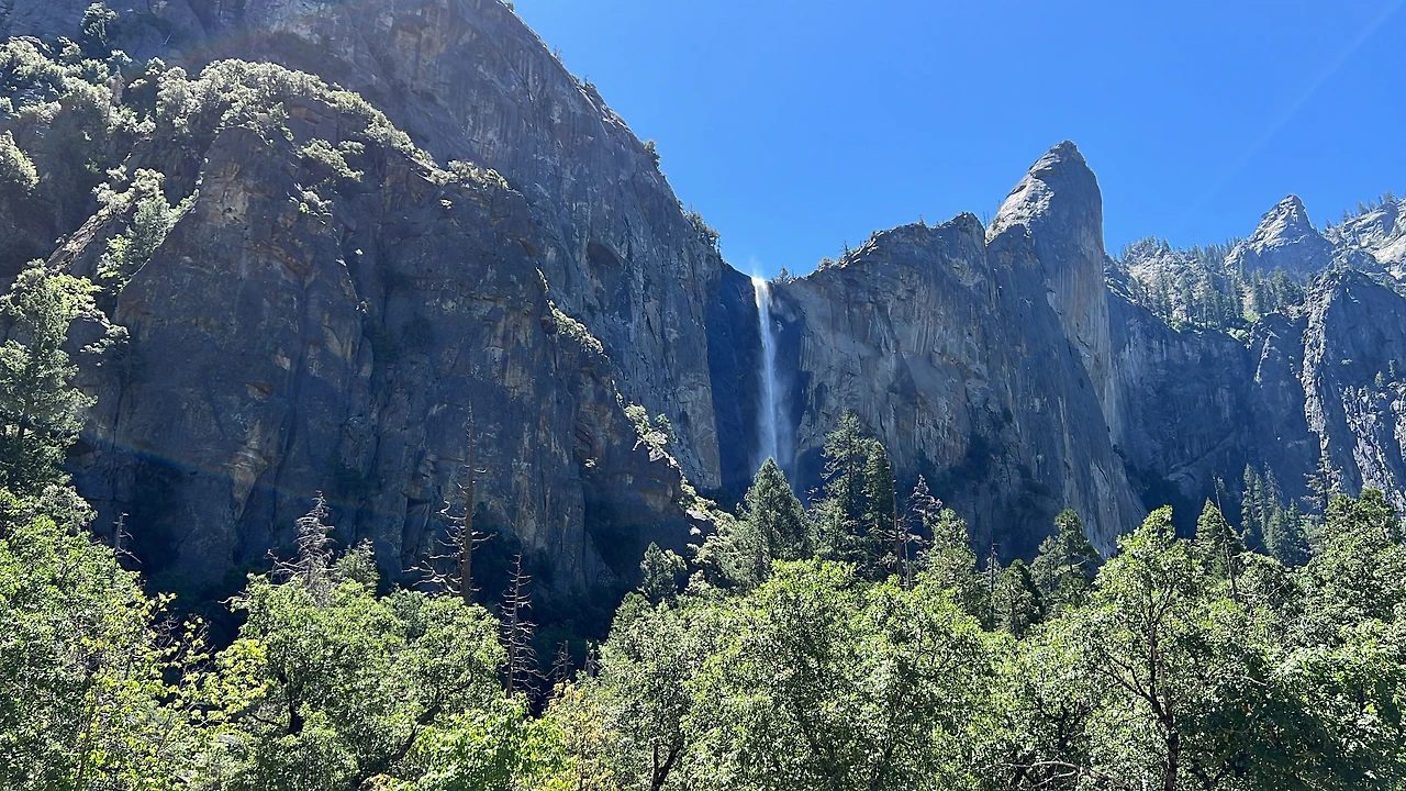 안개처럼 부드러운 물줄기로 유명한 폭포 브라이들베일 폭포(Bridalveil Fall)를 잠깐 구경하고 요세미티 폭포(Yosemite Falls)에 왔다. 우리가 갔던 6월 말은 폭포 수량이 많아서 볼만했다. 북미지역에서 가장 높은 폭포라고 한다.