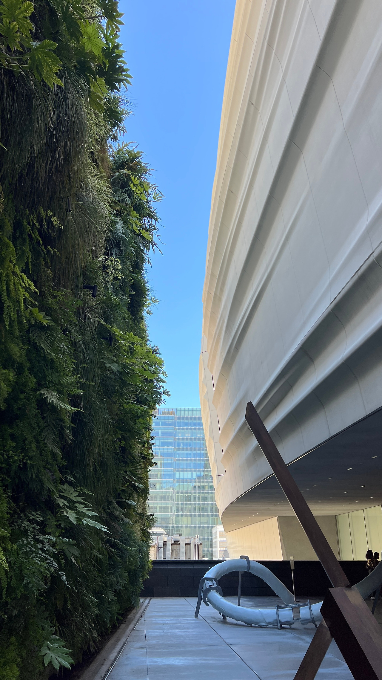 위로 올라가니 바깥으로 통하는 테라스공간이 있었다. 독특한 유선형 외피를 눈여겨봤었는데 기존 마리오보타의 건물에 2016년이 새롭게 증축을 했다고 한다. 샌프란시스코의 바다와 안개, 구름에서 영감을 얻어 디자인했다고 한다.