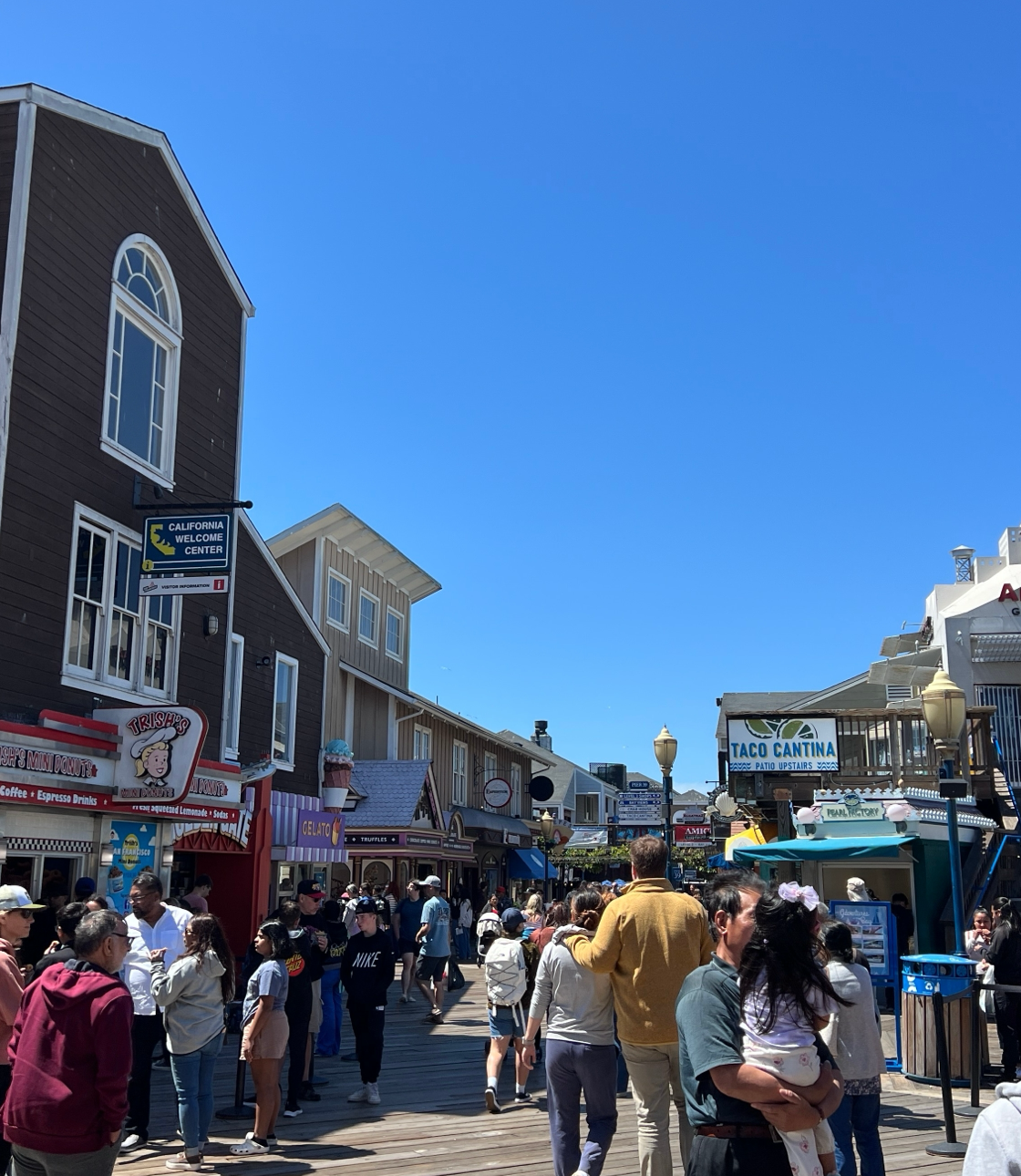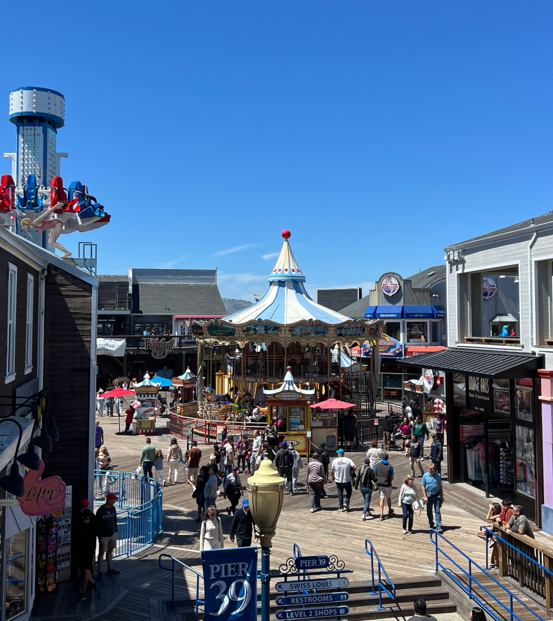 무인택시 웨이모를 타고 도착한 피어 39는 샌프란시스코의 유명한 해안 관광지이다. 피셔맨스 워프(Fisherman’s Wharf) 근처에 위치한 이곳은 마치 작은 놀이공원처럼 활기찬 분위기를 풍겼다.