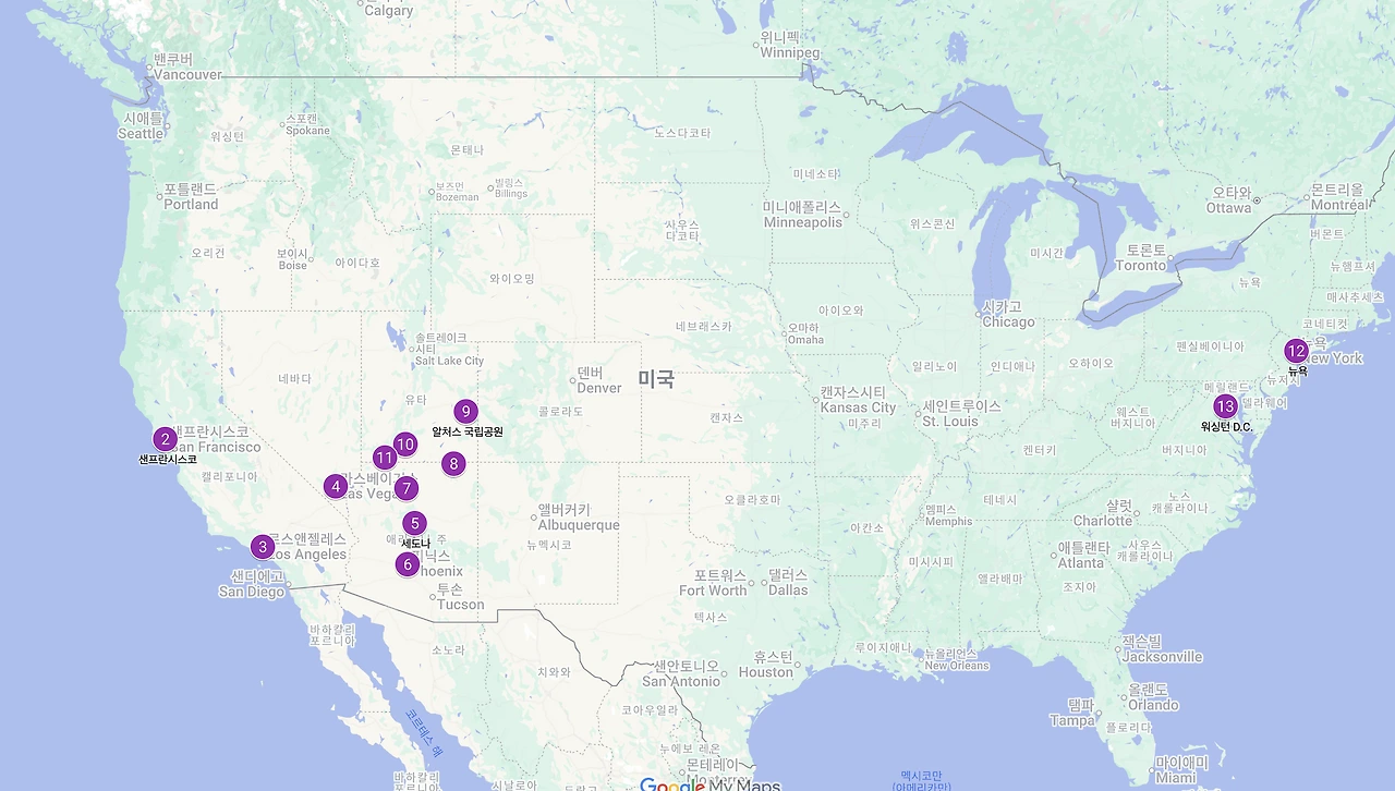 세계에서 세 번째로 큰 나라답게 이동이 만만치 않았다. 우리는 서부의 샌프란시스코 (San Francisco)로 IN 해서 로스앤젤레스 (Los Angeles), 라스베이거스 (Las Vegas)를 여행하고 캠핑카를 빌려서 미서부의 그랜드 서클(Grand Circle)이라 불리는 루트를 따라서 국립공원들을 한 바퀴 돌았다. 이후에 비행기를 타고 미동부의 뉴욕으로 넘어가서 10일 동안 여행하고 마지막으로 미국의 수도 워싱턴에서 아웃했다.