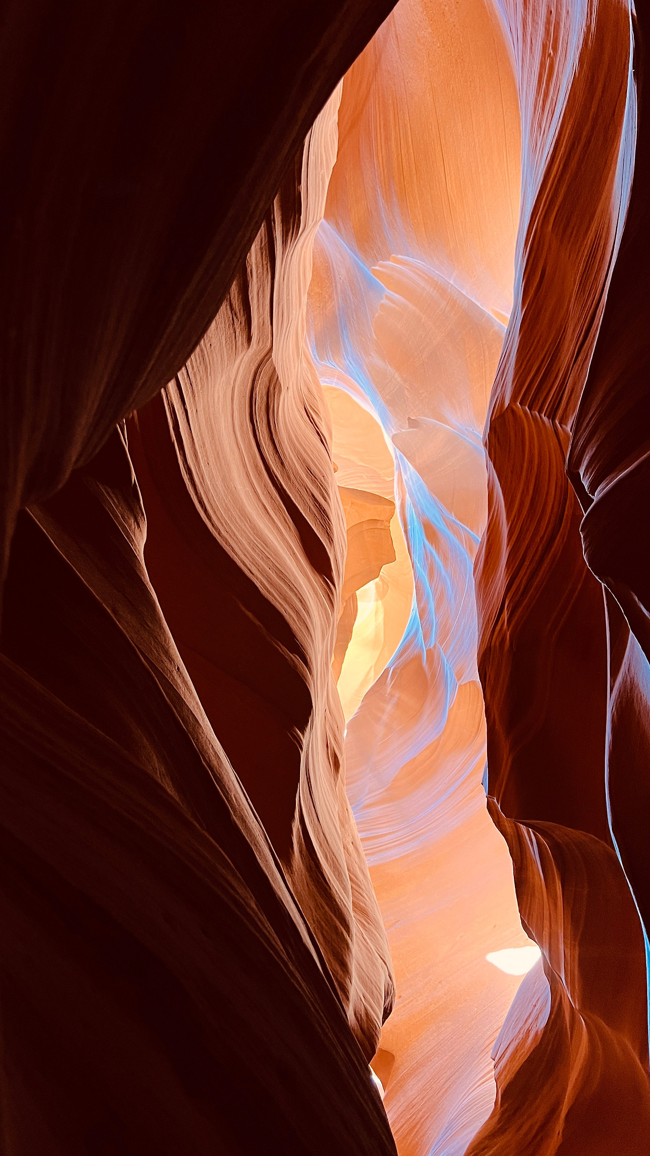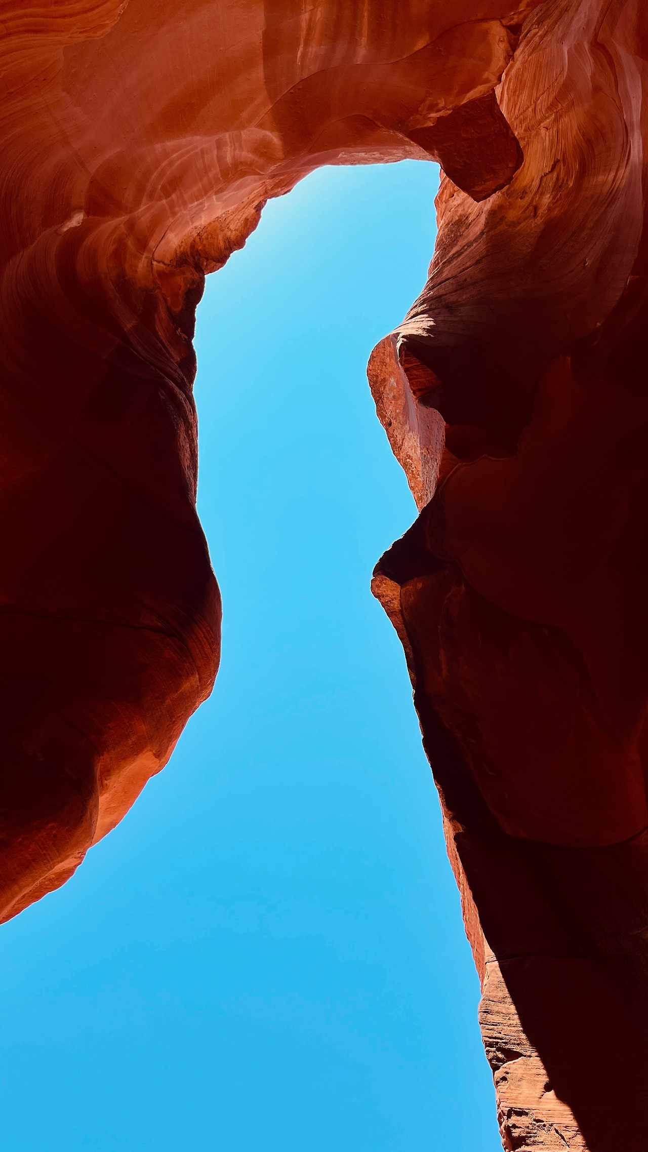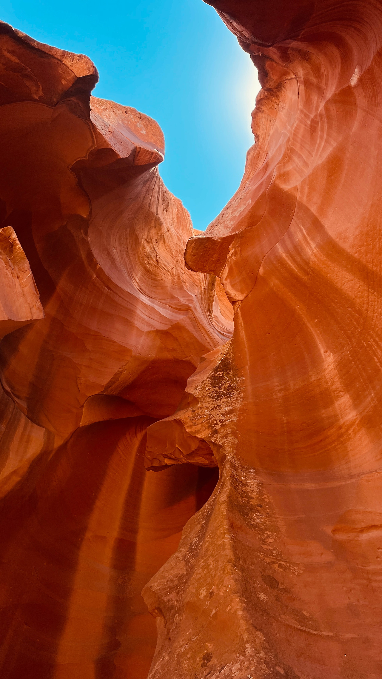 좁은 협곡의 입구로 들어서니 붉은색 사암이 양쪽으로 우리를 감싸고 있다. 좁은 틈으로 파란색 하늘이 보이는데 선명한 색상의 차이가 아무렇게나 막 찍어도 예술이다. 운 좋게 가장 인기가 많은 시간대인 열두 시를 예약해서 좁은 협곡사이로 햇빛이 내리쬐는 모습을 가장 잘 볼 수 있었다.
