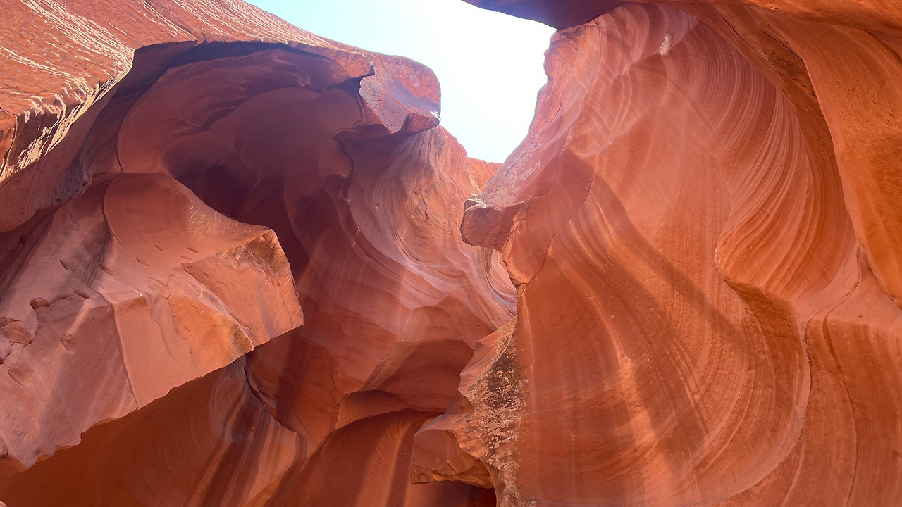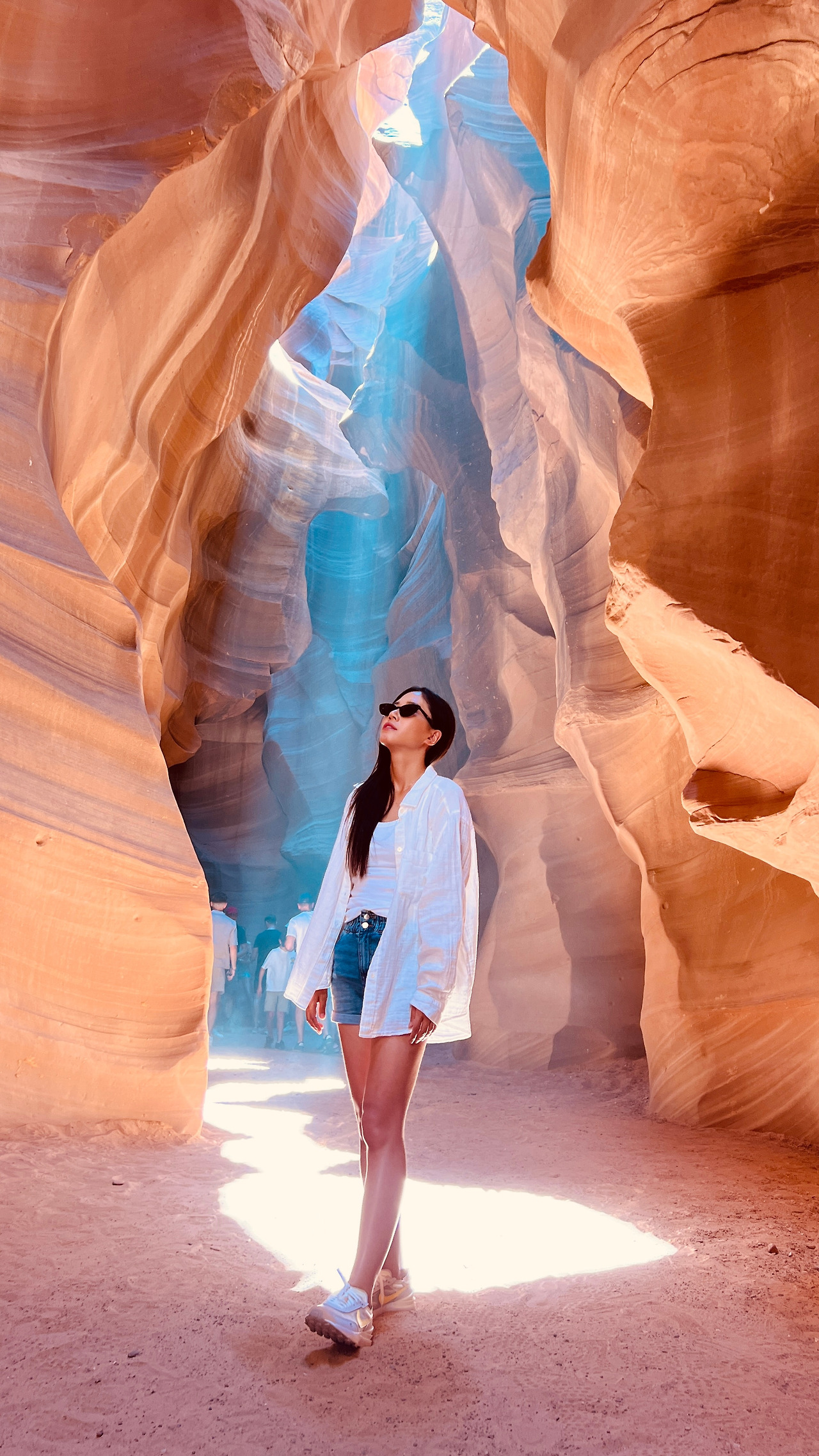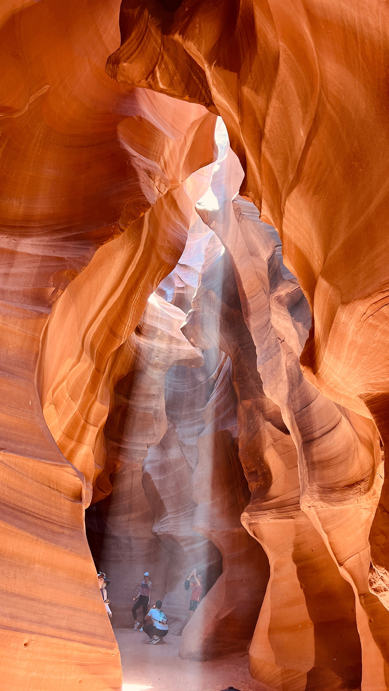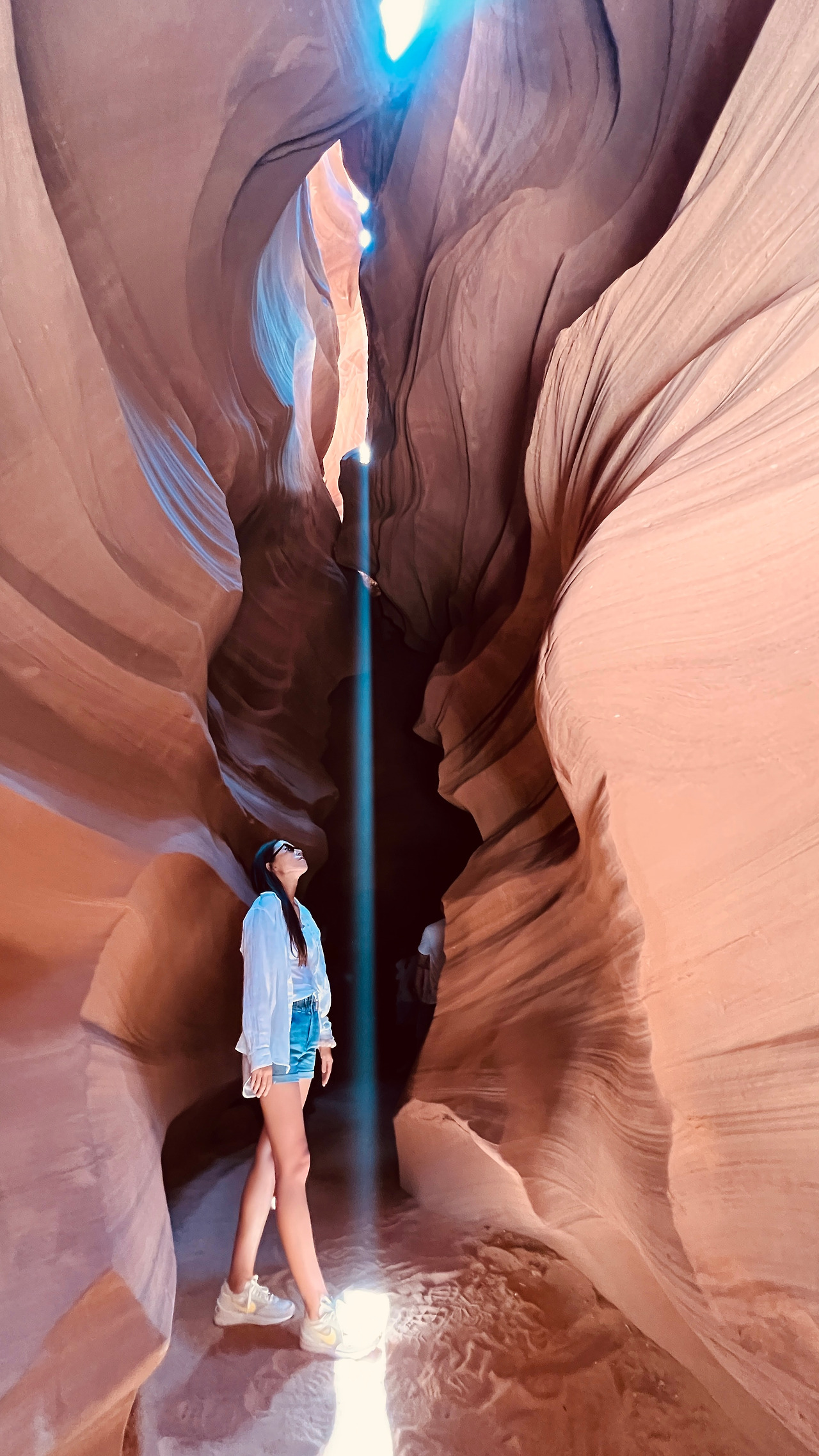 좁은 협곡의 입구로 들어서니 붉은색 사암이 양쪽으로 우리를 감싸고 있다. 좁은 틈으로 파란색 하늘이 보이는데 선명한 색상의 차이가 아무렇게나 막 찍어도 예술이다. 운 좋게 가장 인기가 많은 시간대인 열두 시를 예약해서 좁은 협곡사이로 햇빛이 내리쬐는 모습을 가장 잘 볼 수 있었다.