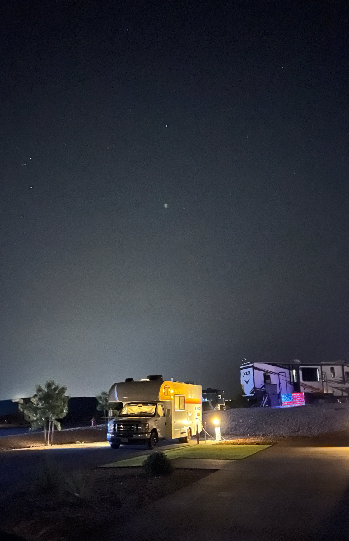 해가 넘어가는 걸 지켜보고 Mather Campground (마더 캠프그라운드)라는 5분 거리 캠핑장으로 갔다. 몇 개월 전부터 예약을 해야 할 정도로 그랜드캐년에서 가장 인기가 많은 캠핑장이라고 하는데 우리는 당일 예약에 성공했다. 밤 9시쯤 도착해서 셀프 체크인을 하고 저녁을 먹는데 누군가 차문을 두드린다. 관리인이 와서 밤에는 제너레이터를 사용할 수 없다고 한다. 아주 큰 실수를 했다. 미국 캠핑장에는 전기와 수도, 오수와 하수를 버릴 수 있는 훅업(hookups) 시스템이 있다. 우리가 예약한 캠핑장의 사이트는 전기 훅업이 불가능한 곳이었다. 그래서 에어컨을 켜기 위해 발전기를 켰는데 그게 소음이 상당하다. 한국에서도 캠핑을 해본 적이 없는 초보가 미국 캠핑장에서 정숙해야 하는 밤인 줄도 모르고 캠핑장을 시끄럽게 만들었다. 다행히 견딜만한 더위였다.